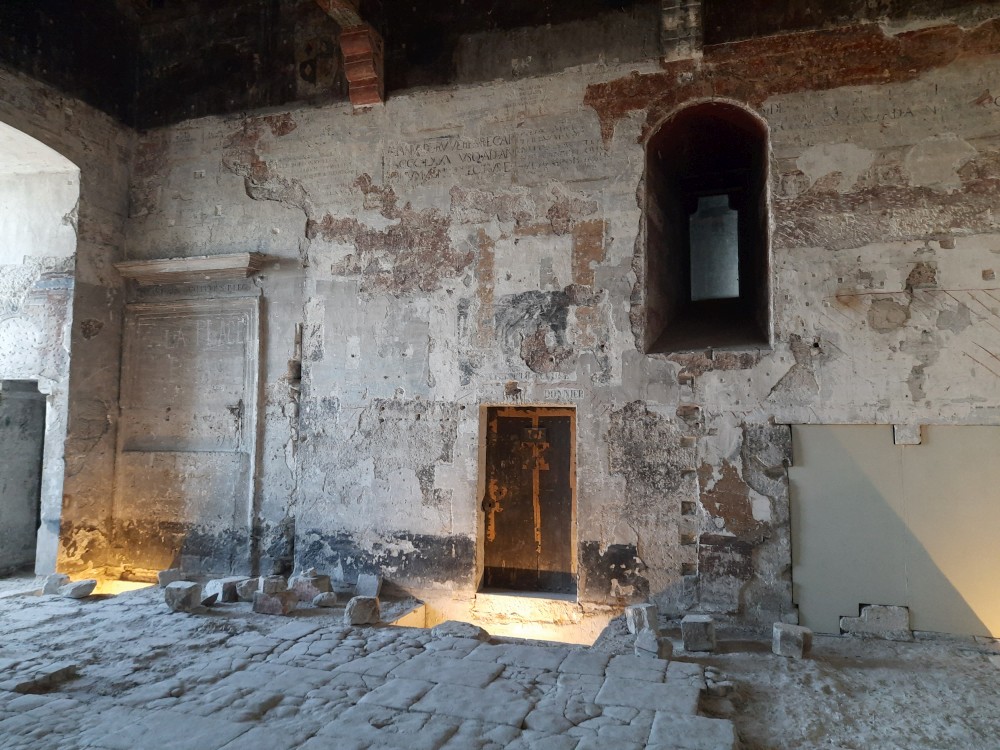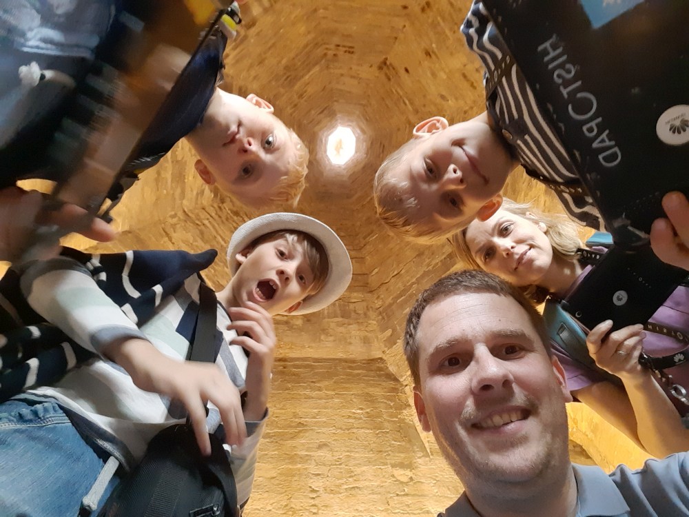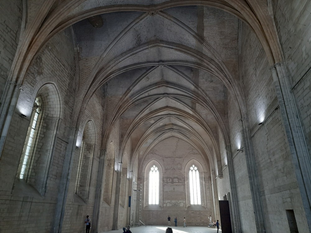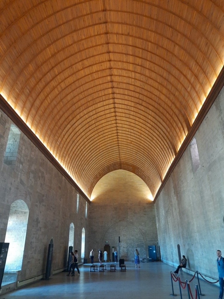 Kupujeme lístky do paláce a jdeme na prohlídku. Vyfasovali jsme malé tablety. Pomocí tabletu lze v jednotlivých místnostech paláce naskenovat kód a pak je možné se skrz tablet rozhlížet okolo sebe a na tabletu vidět vizualizaci, jak to tu vypadalo v nejslavnější době, kdy palác obýval papež. Procházíme interiéry paláce, ale také papežské zahrady.