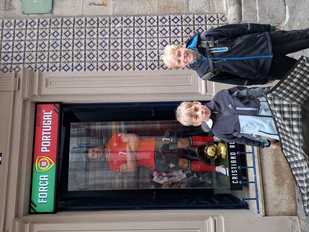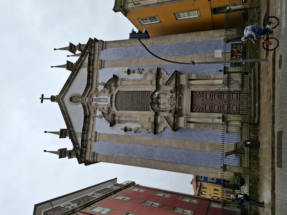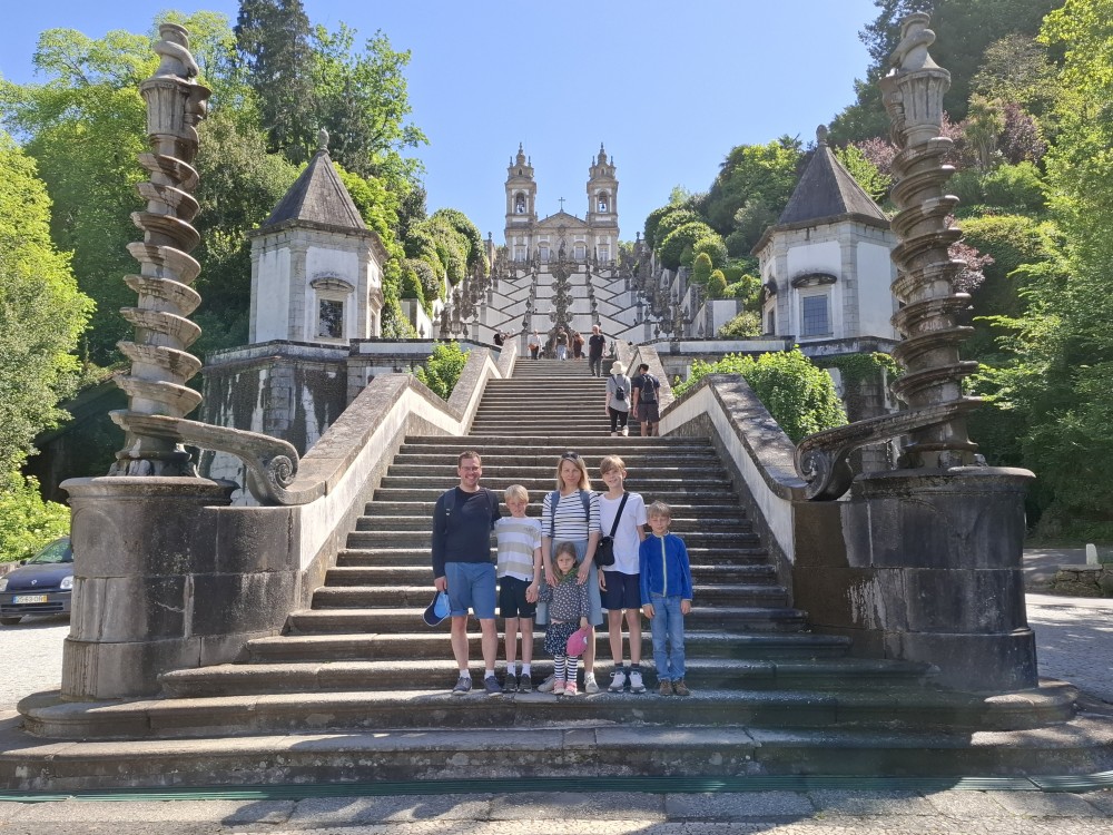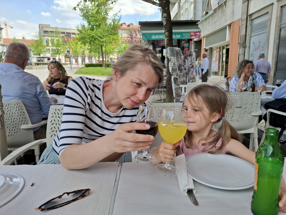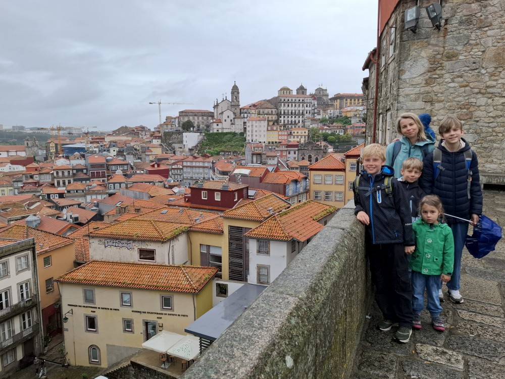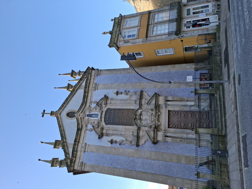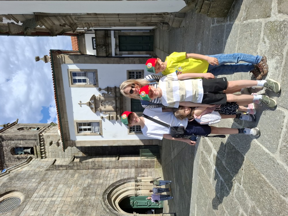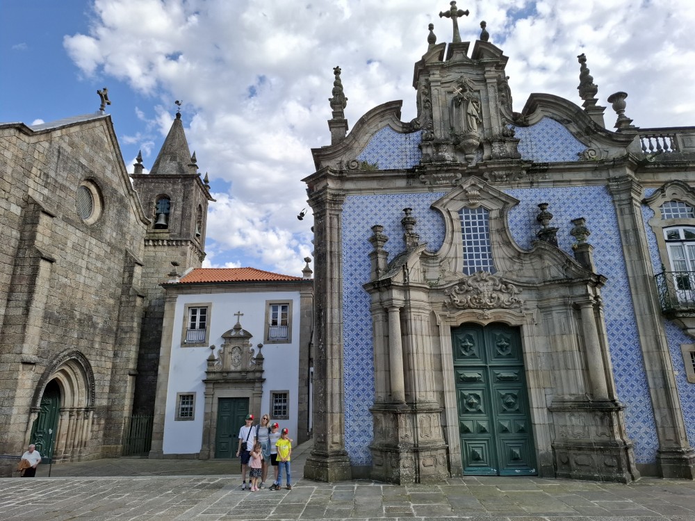 Ochutnáváme také portské víno. Kluci si dávají citronovou limonádu. Po obědě vyrážíme na procházku centrem. Zastavujeme v kostele s interiérem zdobeným Azulejos, dlaždičkami. Procházíme kolem městské věže a jdeme na zmzlinu. U katedrály Panny Marie kupujeme v suvenýrovém obchodě všem klukům portugalské kšiltovky. Dokončujeme okruh, sedáme do auta a pokračujeme do Guimarães.
