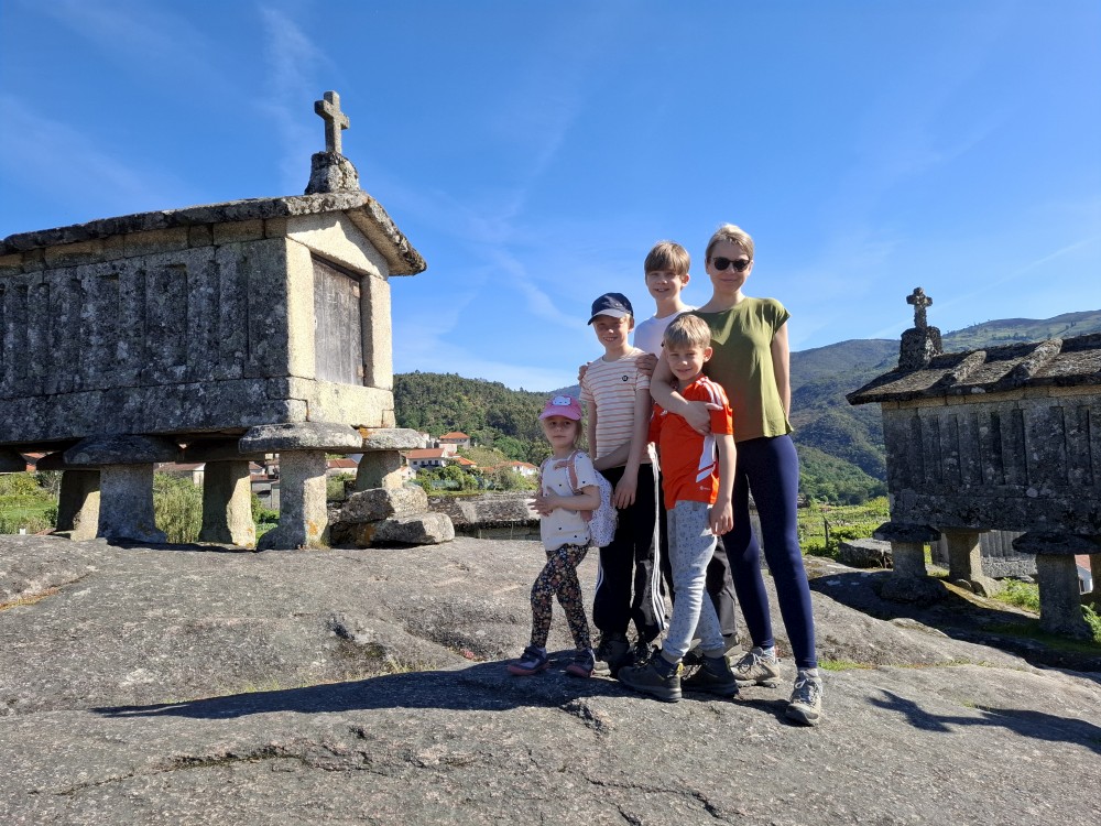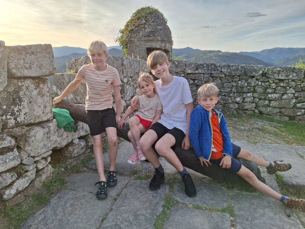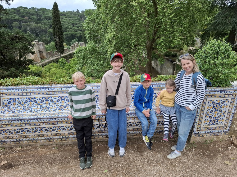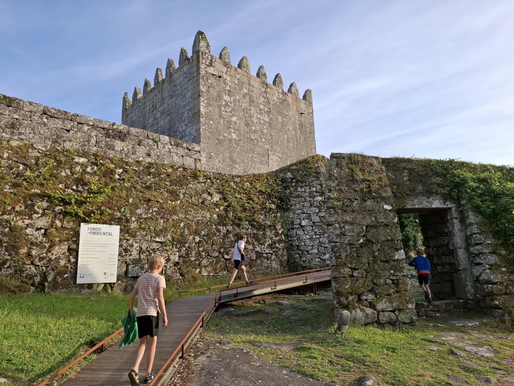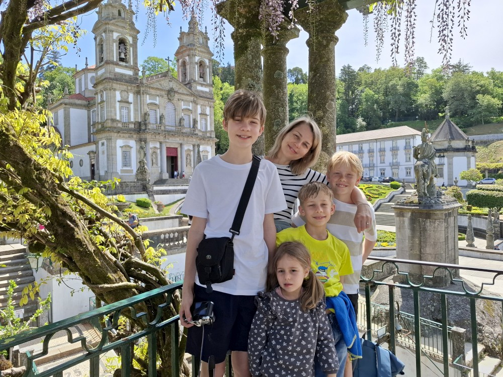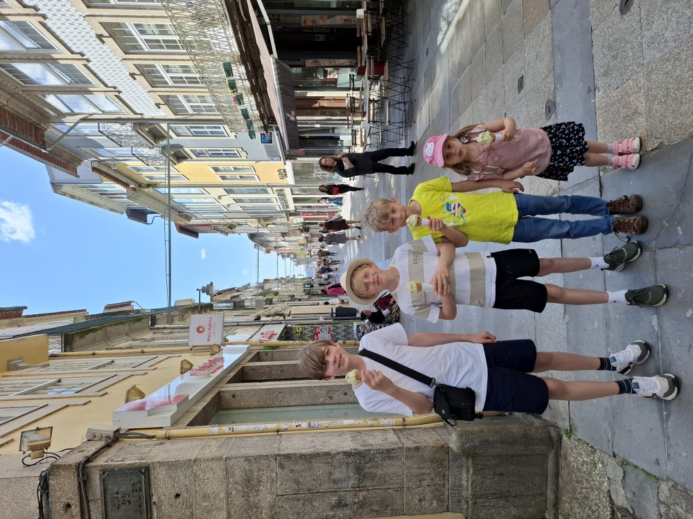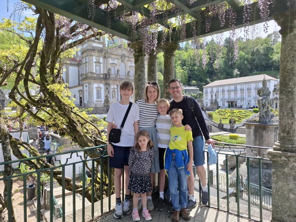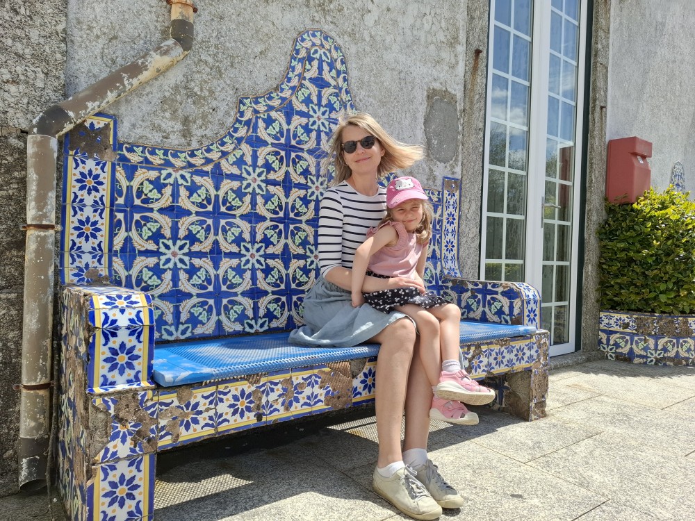 Ochutnáváme také portské víno. Kluci si dávají citronovou limonádu. Po obědě vyrážíme na procházku centrem. Zastavujeme v kostele s interiérem zdobeným Azulejos, dlaždičkami. Procházíme kolem městské věže a jdeme na zmzlinu. U katedrály Panny Marie kupujeme v suvenýrovém obchodě všem klukům portugalské kšiltovky. Dokončujeme okruh, sedáme do auta a pokračujeme do Guimarães.