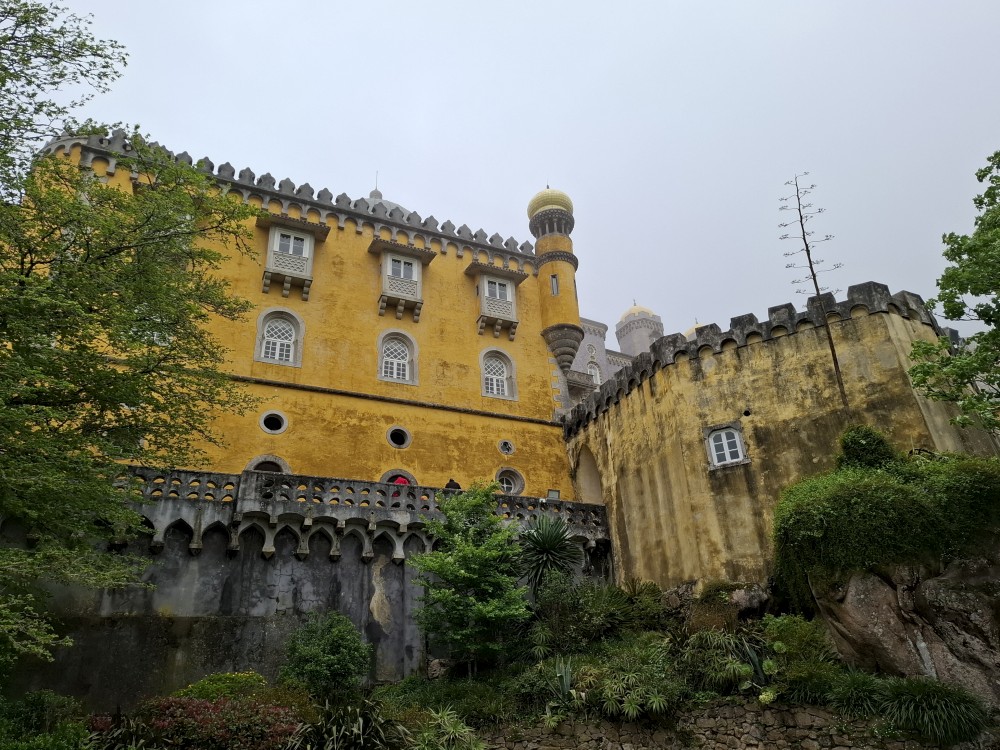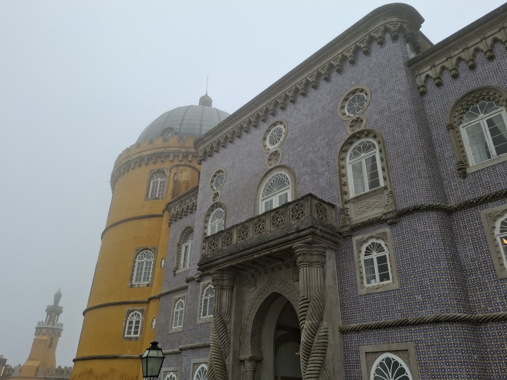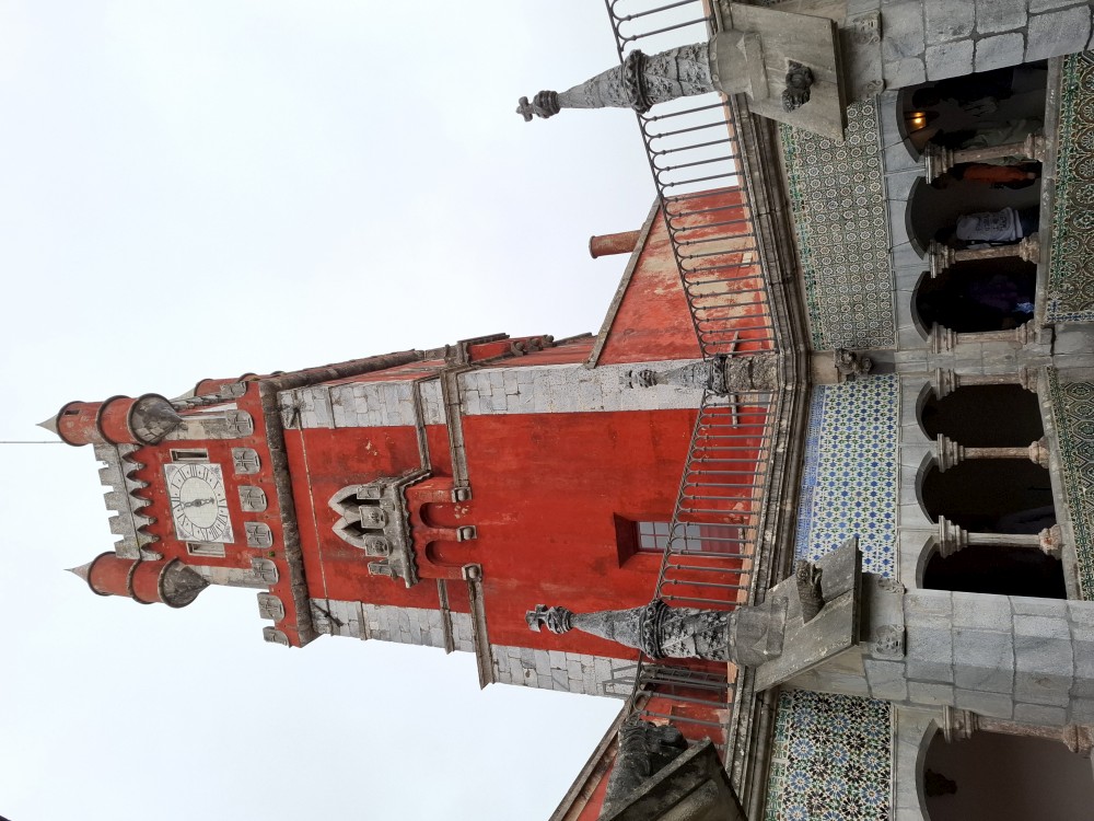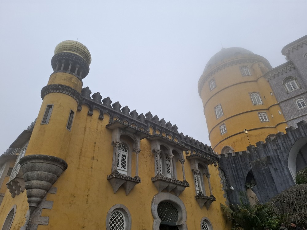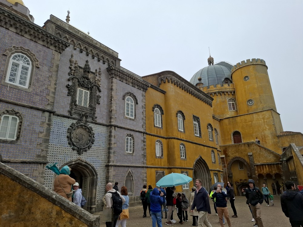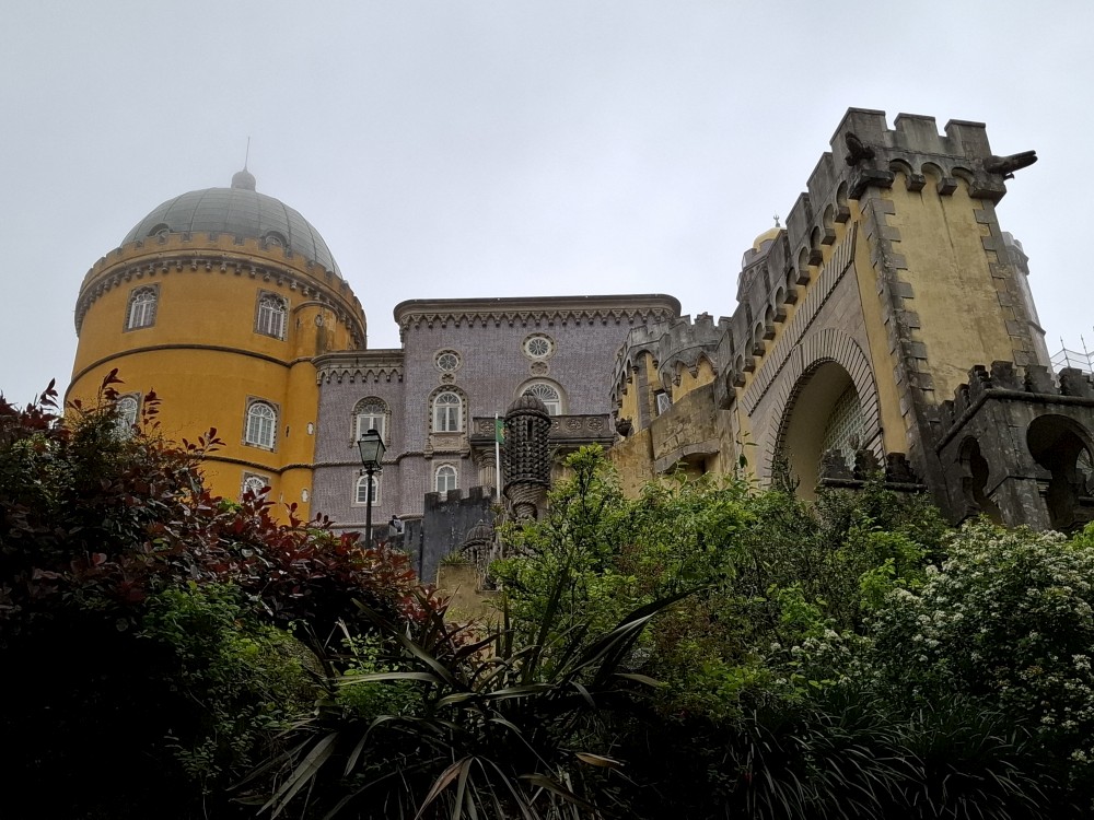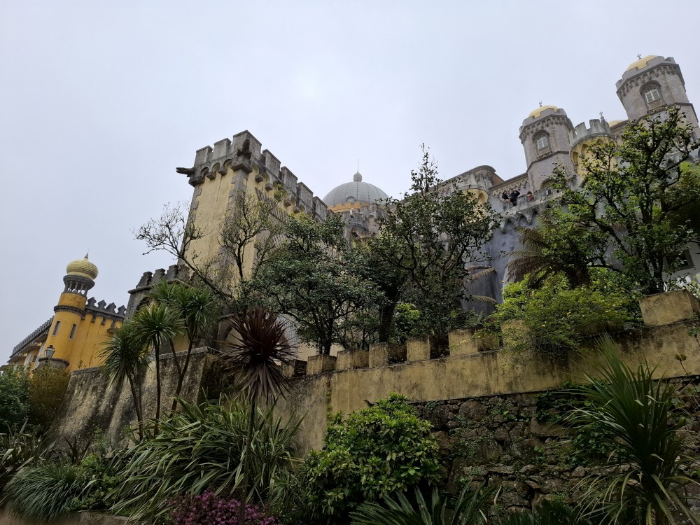 Do paláce nepůjdeme, jdeme se podívat jen do jeho zahrad a také do kavárny na kávu a nanuky. Pak vyrážíme zase vzhůru do prudkého kopce k paláci Pena. Jdeme po strmých schodech krásnou zahradou až k jednomu ze vstupů do areálu paláce Pena. Areálem pak stoupáme až k paláci. Je tu opravdu hodně lidí. Palác je v mlžném oparu mraků.