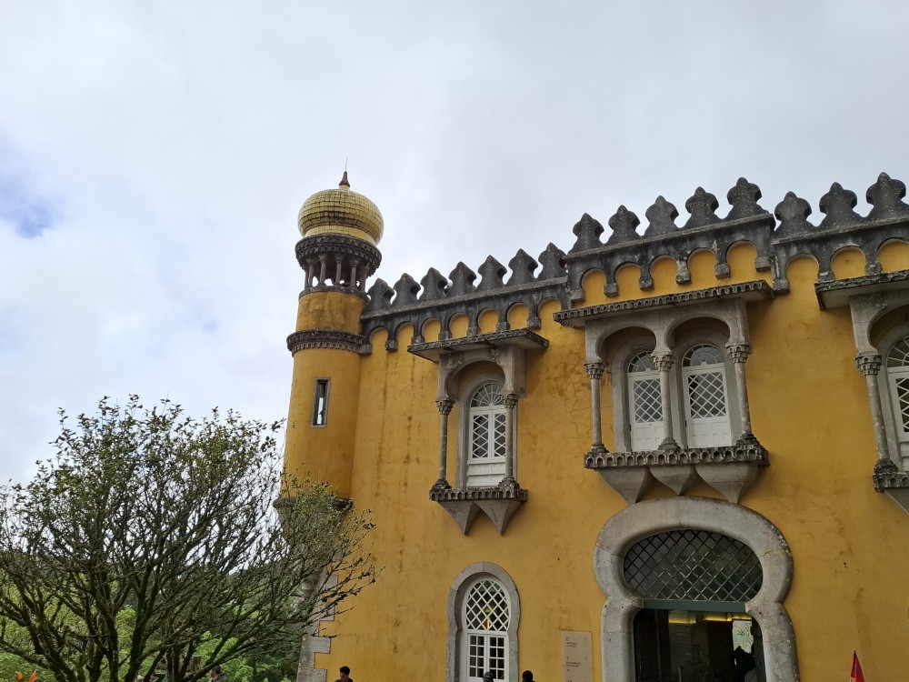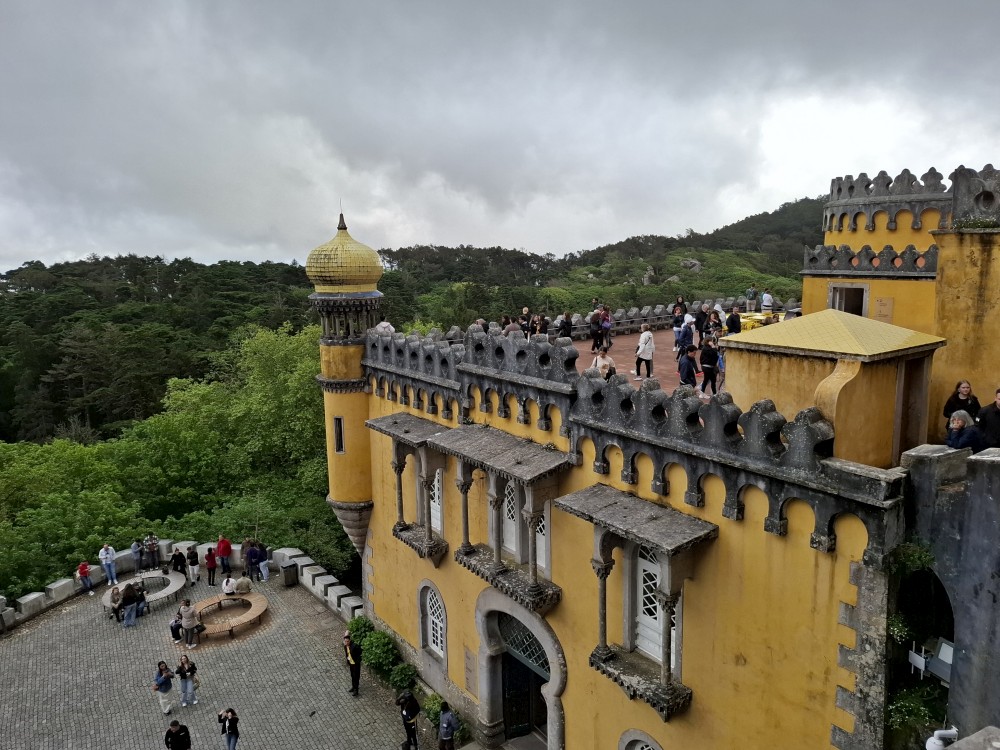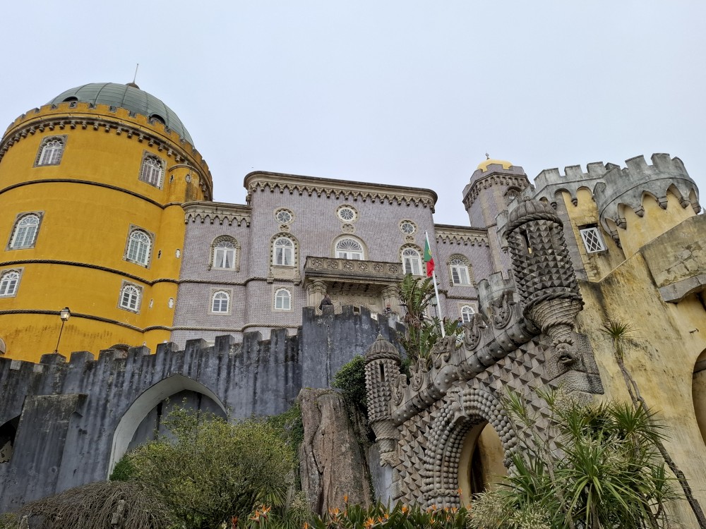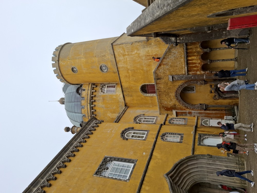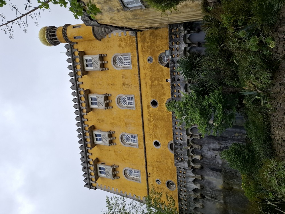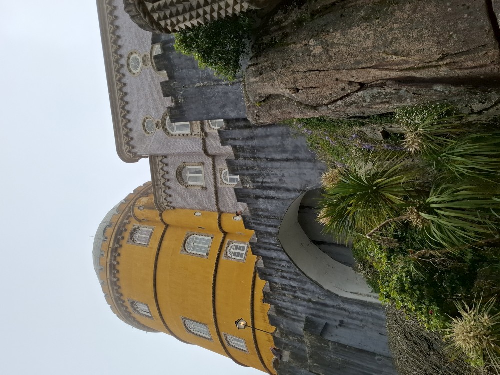 Do paláce nepůjdeme, jdeme se podívat jen do jeho zahrad a také do kavárny na kávu a nanuky. Pak vyrážíme zase vzhůru do prudkého kopce k paláci Pena. Jdeme po strmých schodech krásnou zahradou až k jednomu ze vstupů do areálu paláce Pena. Areálem pak stoupáme až k paláci. Je tu opravdu hodně lidí. Palác je v mlžném oparu mraků.