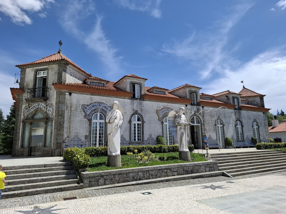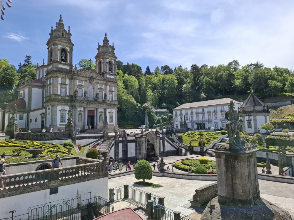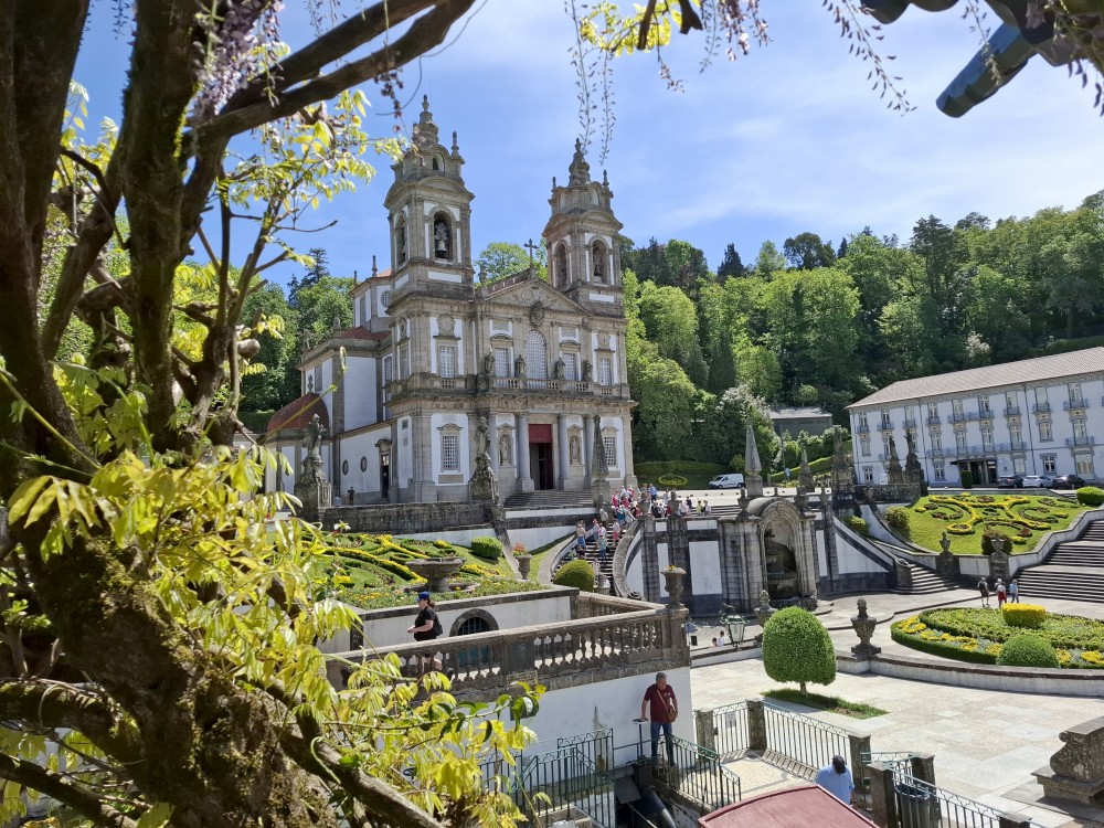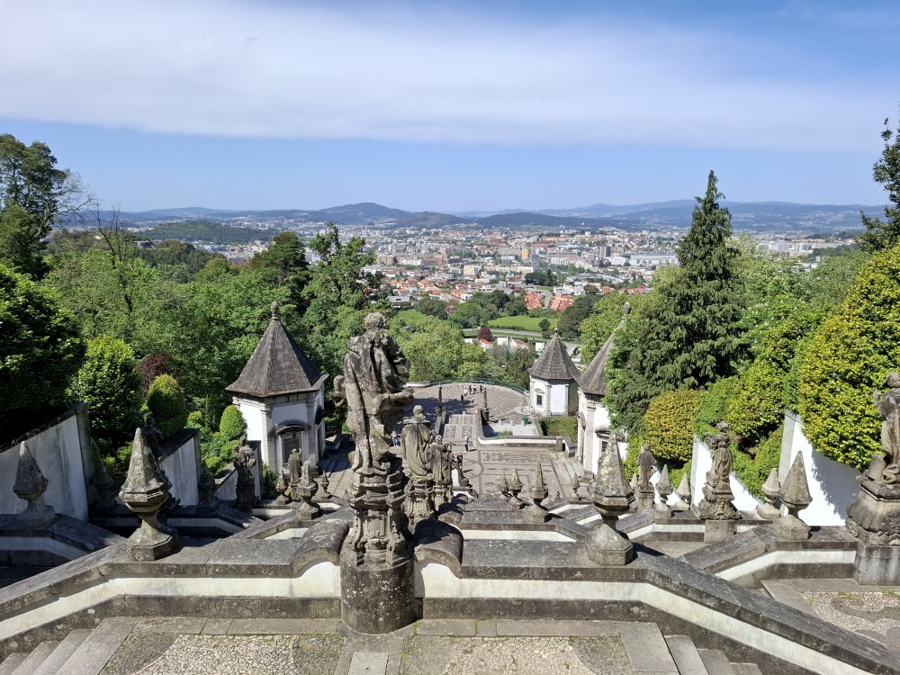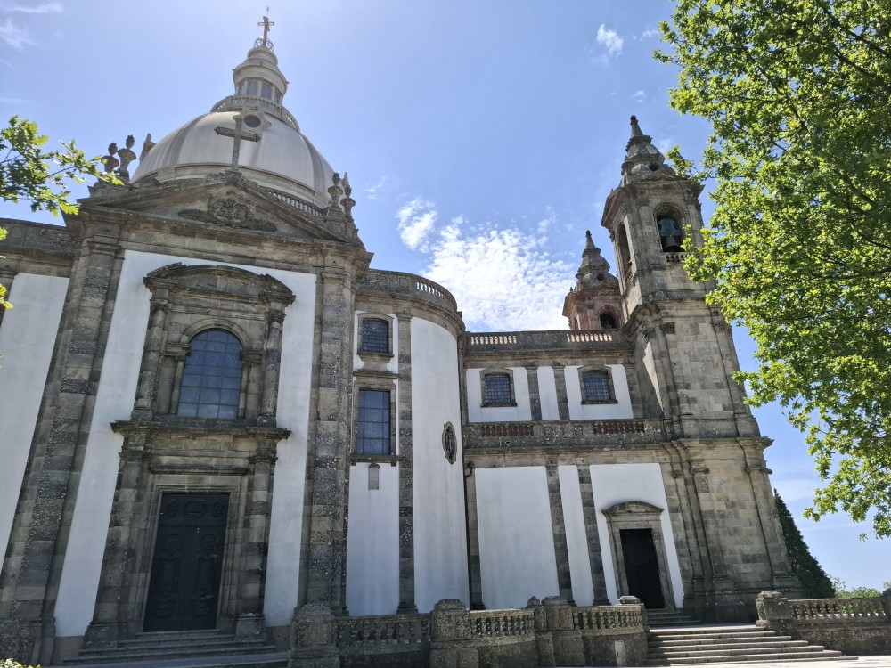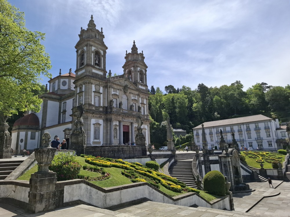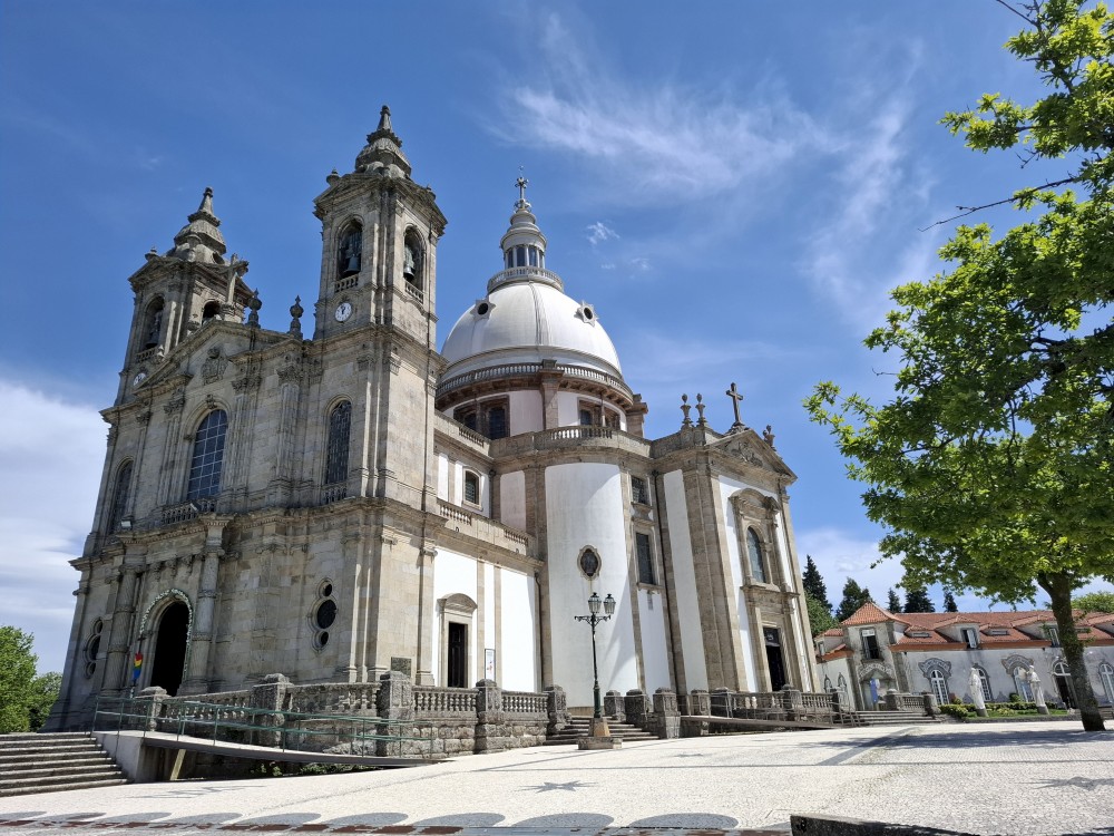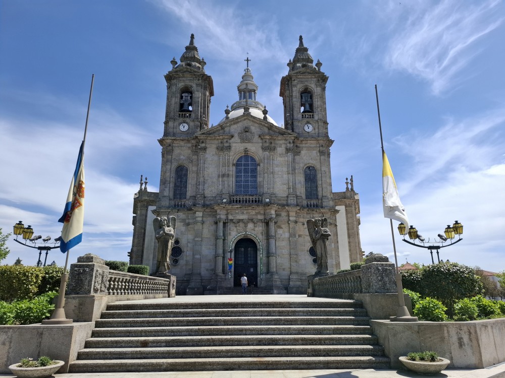 Chvíli sedíme v kostele, pak se jdeme rozhlédnout na přilehlou vyhlídku. Pak klesáme po schodech zpět k autu. Přejíždíme na nedaleké druhé poutní místo Sanctuary of Our Lady of Sameiro. Zde je úplně prázdno. Je to znovu impozantní stavba, i když trochu ve stínu slavnějšího Bom Jesus. Vlaje zde vatikánská vlajka na půl žerdi pro připomínku nedávno zeslulého papeže Františka.