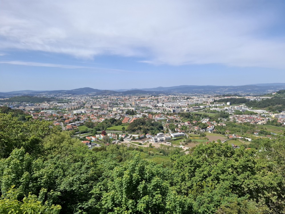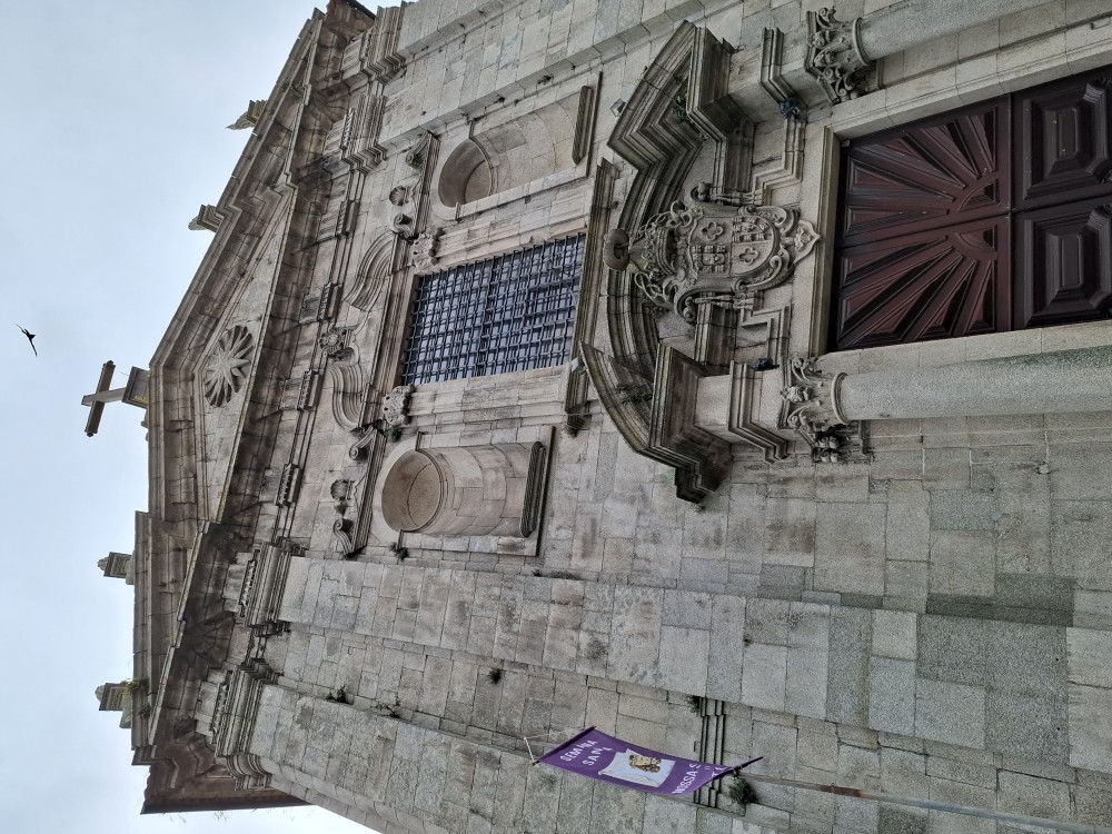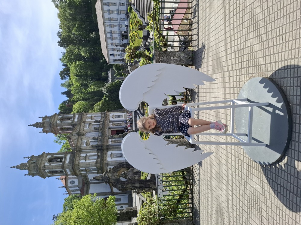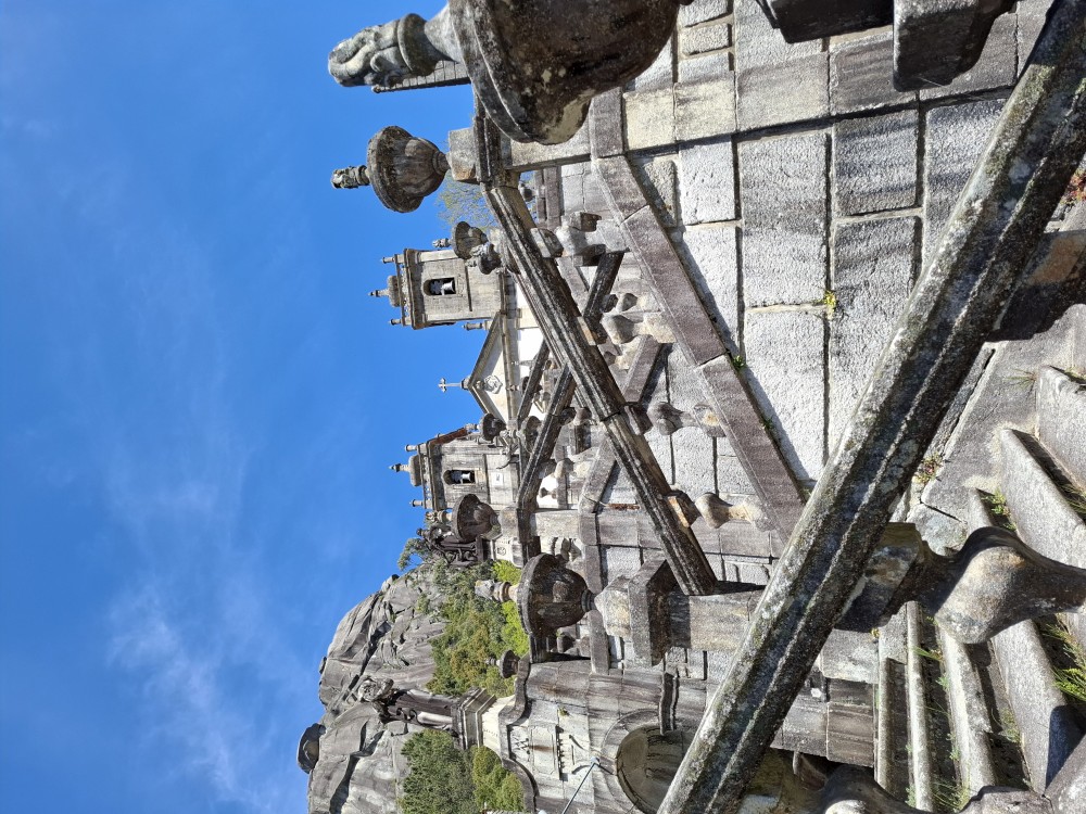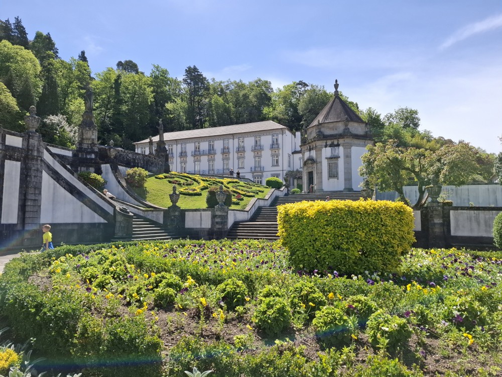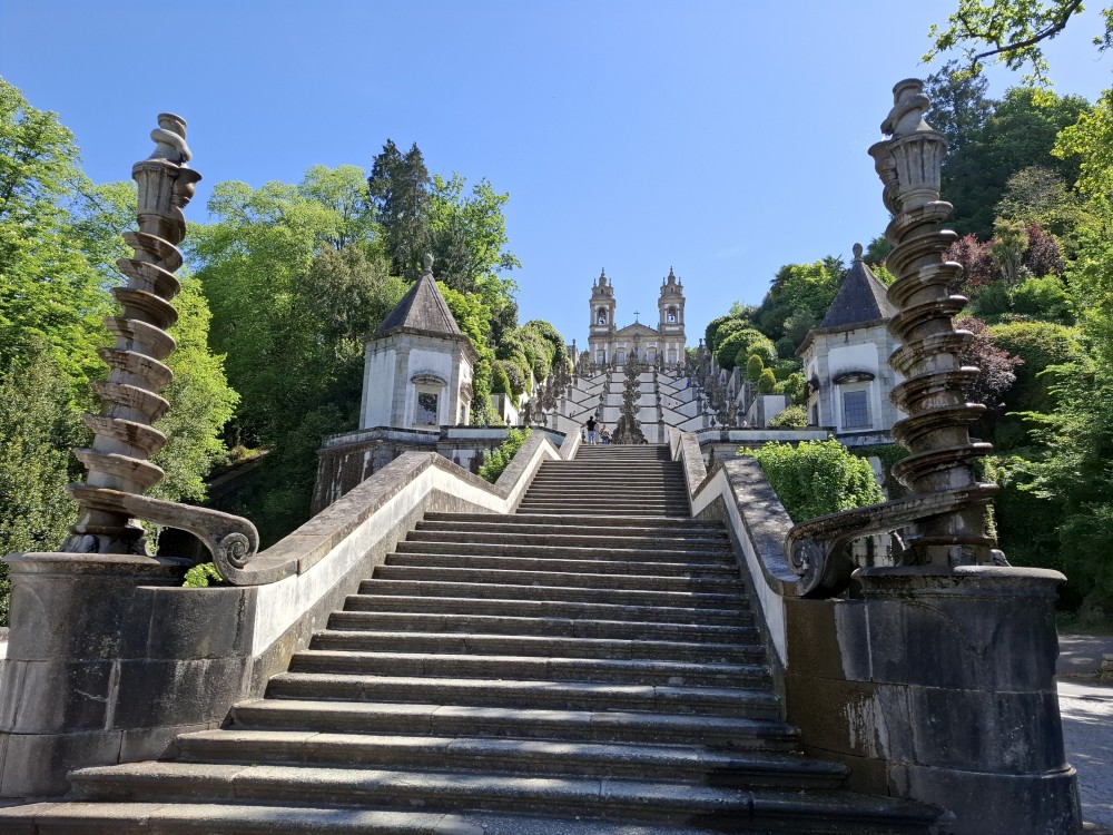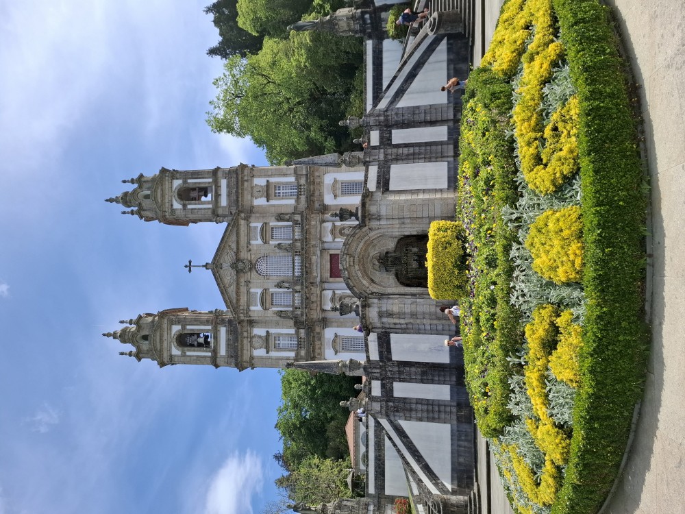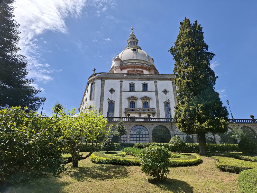 Chvíli sedíme v kostele, pak se jdeme rozhlédnout na přilehlou vyhlídku. Pak klesáme po schodech zpět k autu. Přejíždíme na nedaleké druhé poutní místo Sanctuary of Our Lady of Sameiro. Zde je úplně prázdno. Je to znovu impozantní stavba, i když trochu ve stínu slavnějšího Bom Jesus. Vlaje zde vatikánská vlajka na půl žerdi pro připomínku nedávno zeslulého papeže Františka.