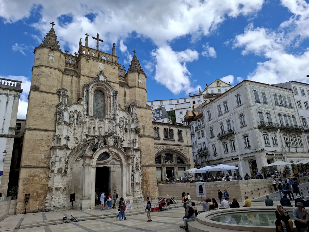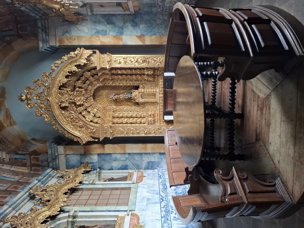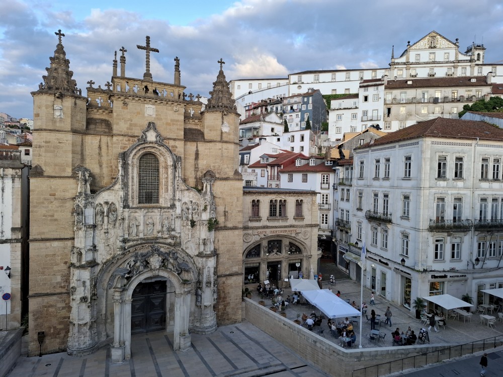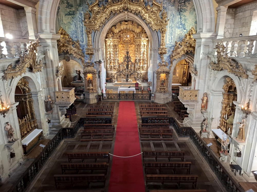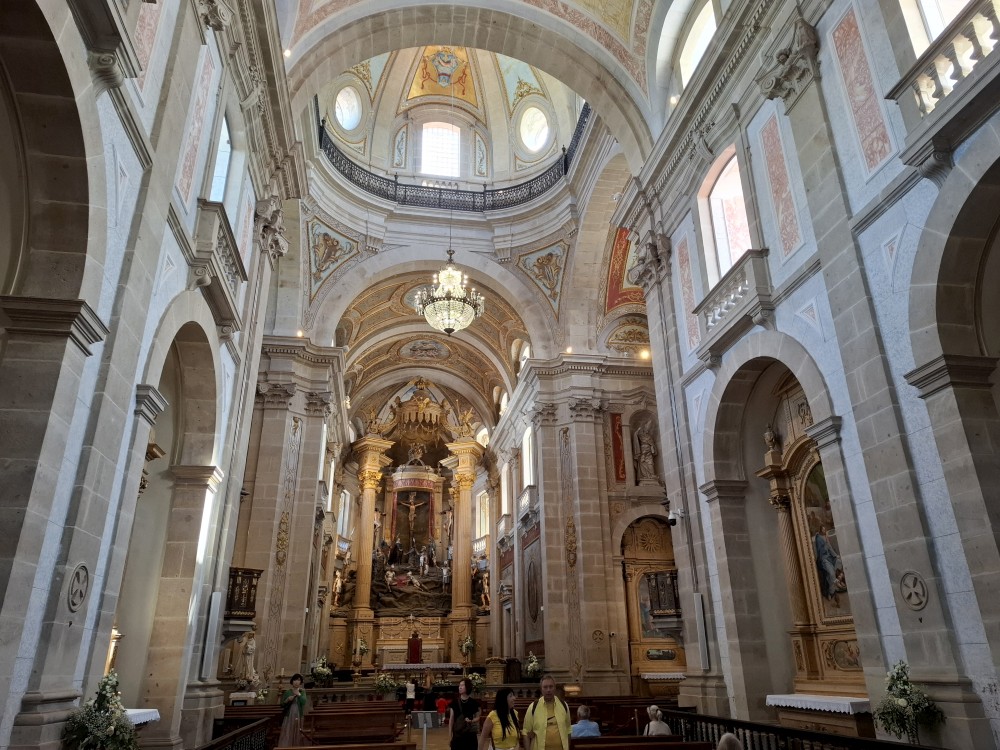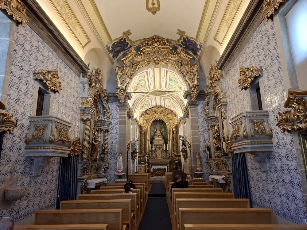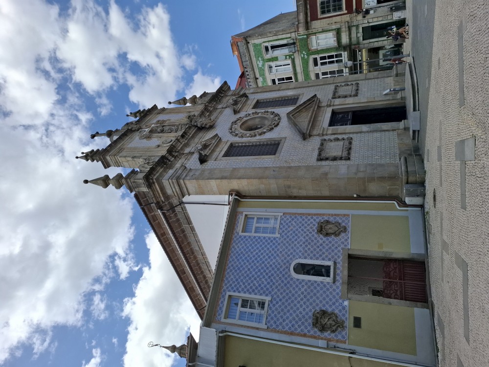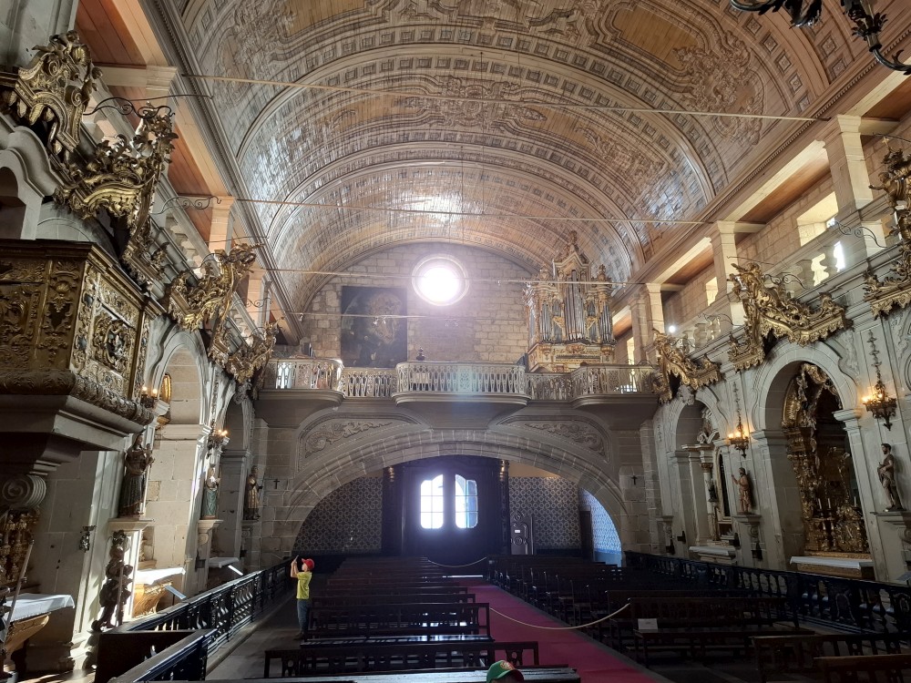 Pokračujeme kolem zahrady do centra na náměstí s kostelem Igreja de Nossa Senhora da Oliveira. Je tu hodně lidí sedících v restauracích. Pak se proplétáme uličkami starého města až ke klášteru Convento e Igreja de São Francisco. Ten je zvenku velmi malebný a je tomu tak i uvnitř. Tady za to drobný poplatek stál. Jdeme se podívat i do patra na varhany a také do zrcadlové zlaté místnosti.