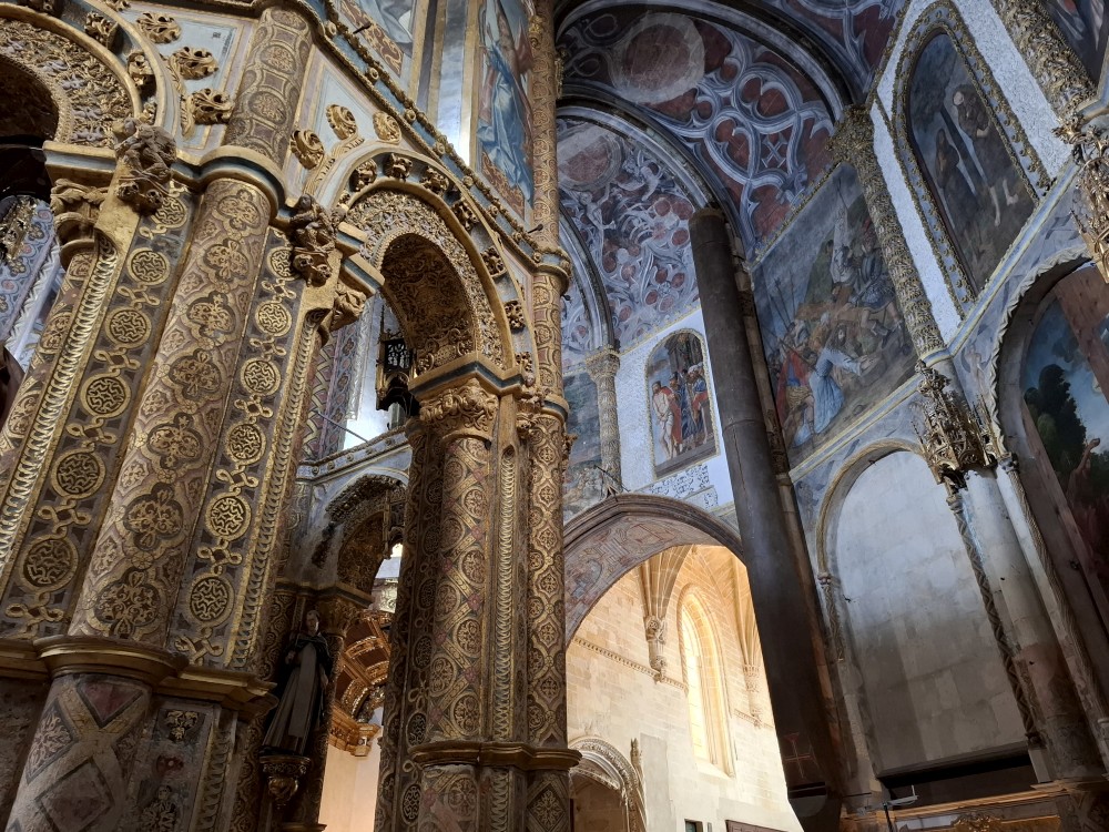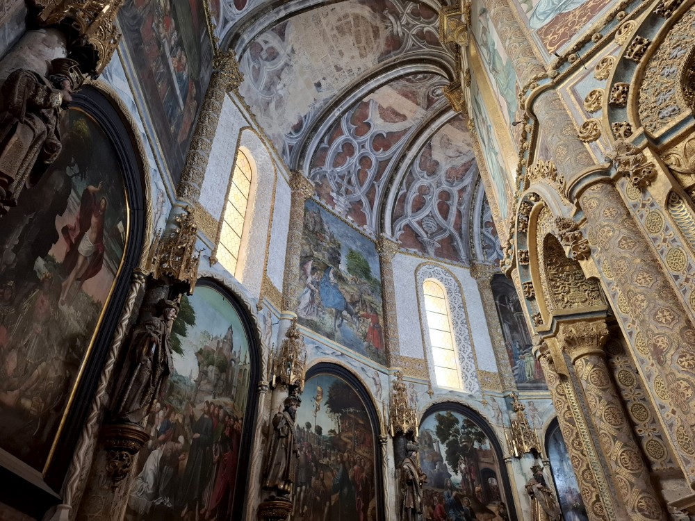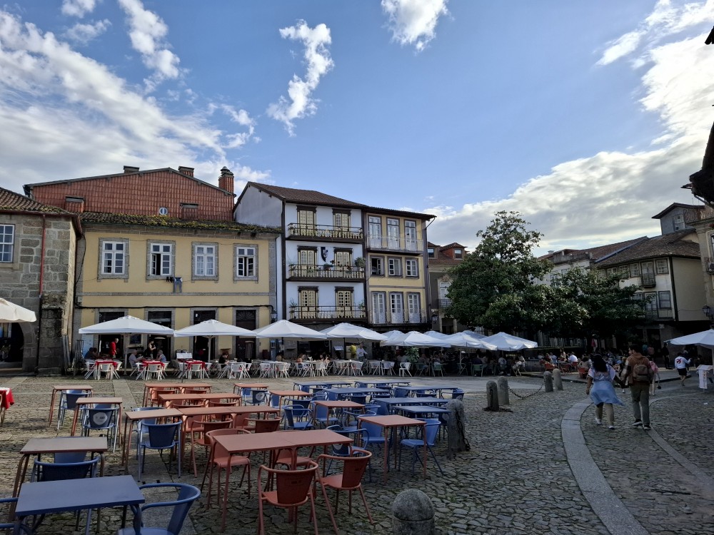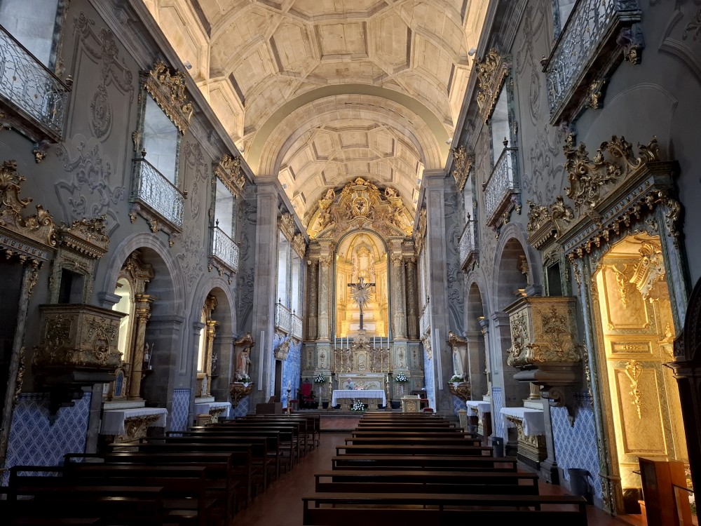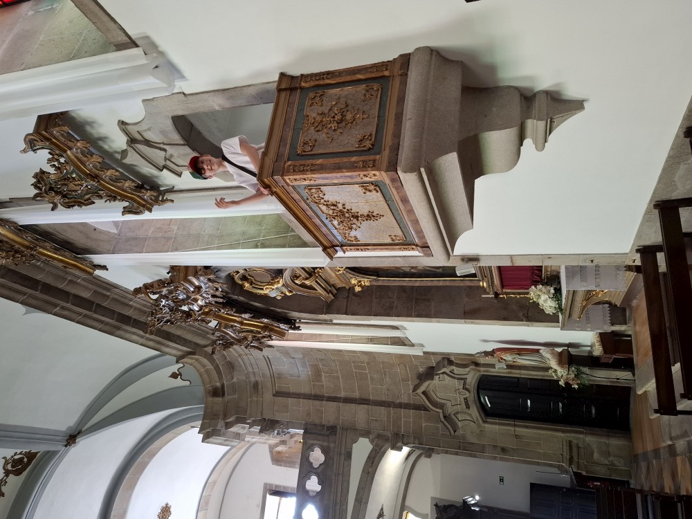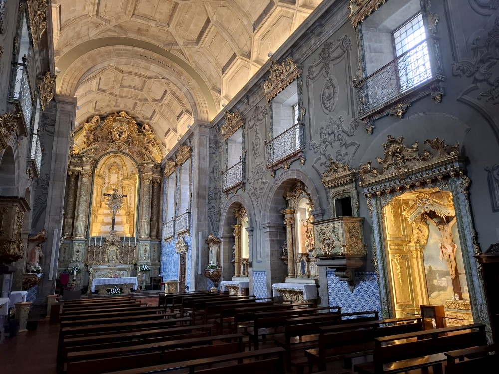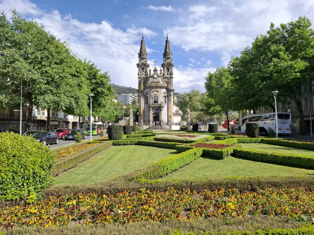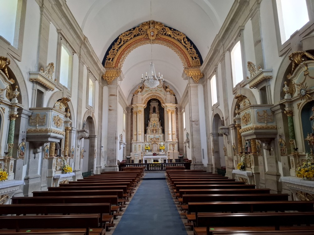 Pokračujeme kolem zahrady do centra na náměstí s kostelem Igreja de Nossa Senhora da Oliveira. Je tu hodně lidí sedících v restauracích. Pak se proplétáme uličkami starého města až ke klášteru Convento e Igreja de São Francisco. Ten je zvenku velmi malebný a je tomu tak i uvnitř. Tady za to drobný poplatek stál. Jdeme se podívat i do patra na varhany a také do zrcadlové zlaté místnosti.