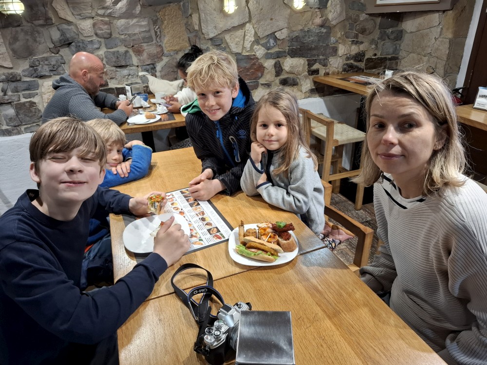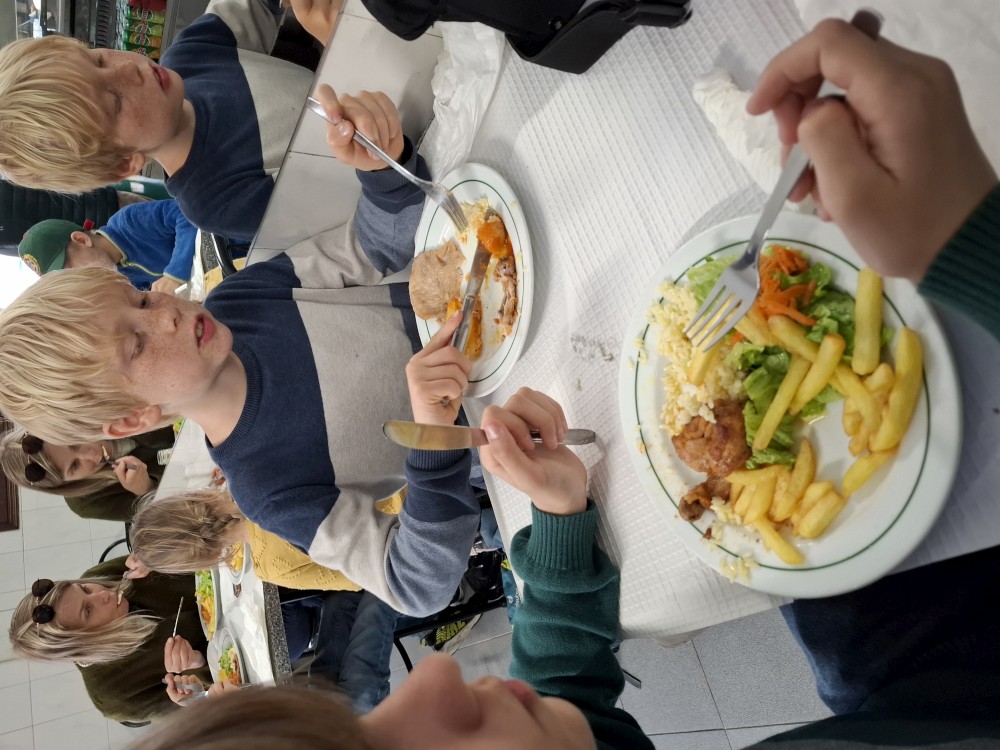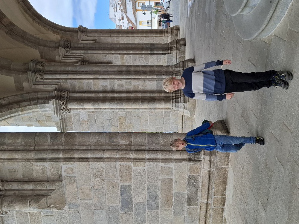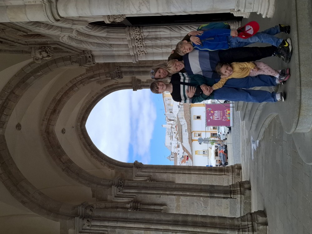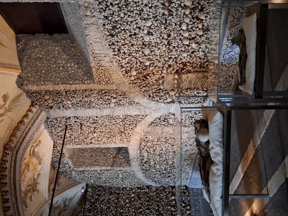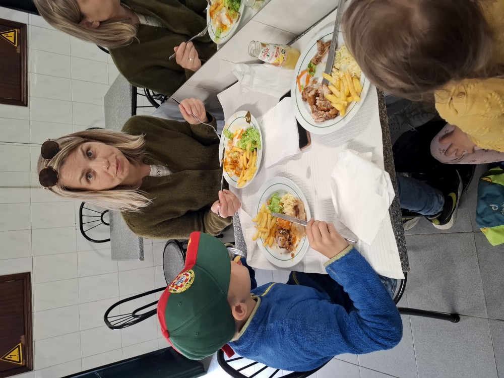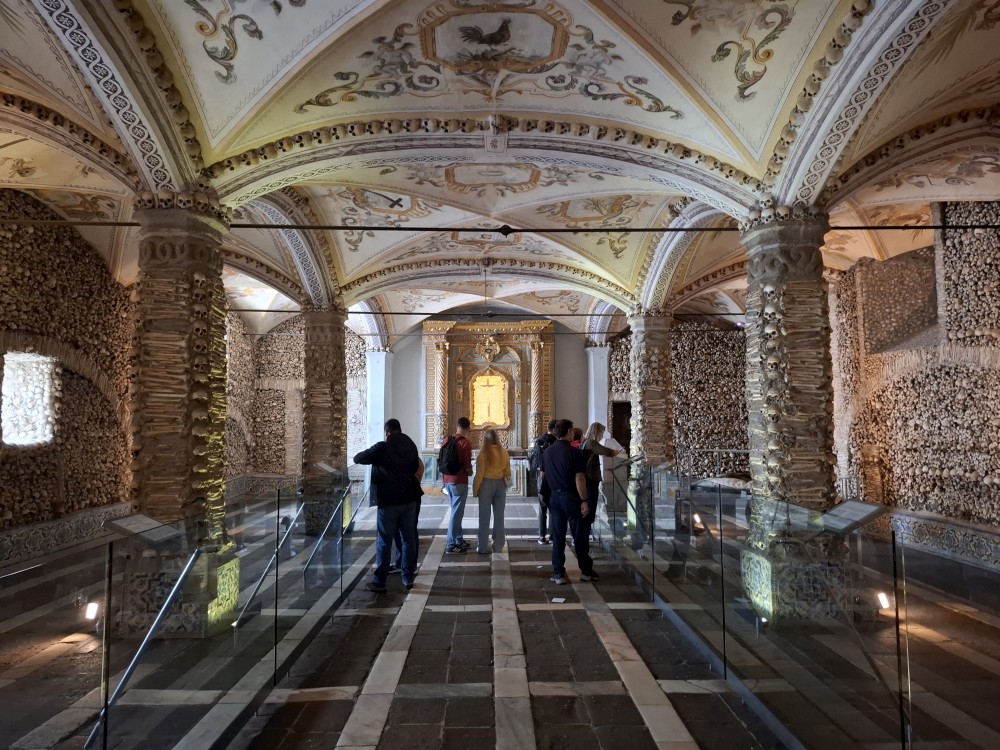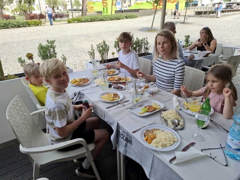 Do kostela můžeme zdarma, do kaple si kupujeme vstupné za 15 EUR pro celou rodinu. Kaple je zajímavá. Stěny jsou vyskládány z kostí a lebek. V patře je pak ještě místní muzeum, děti jezdí proskleným výtahem. Hned vedle kostela vidíme restauraci. Je to restaurace pro místní, ne turistická. Mají tu klasická portugalská jídla za velmi přiznivé ceny (8 EUR velká porce). Objednáváme 3 velká jídla a polévku a společně to sníme. Všichni jsme najezeni do syta. Měli jsme jídlo s kuřetem, jídlo s krůtou a jídlo s vepřovým.