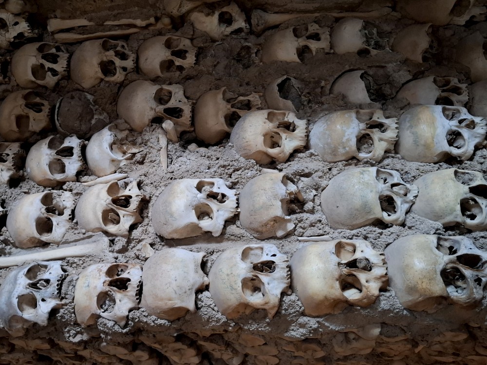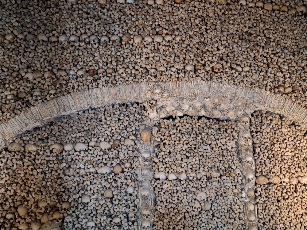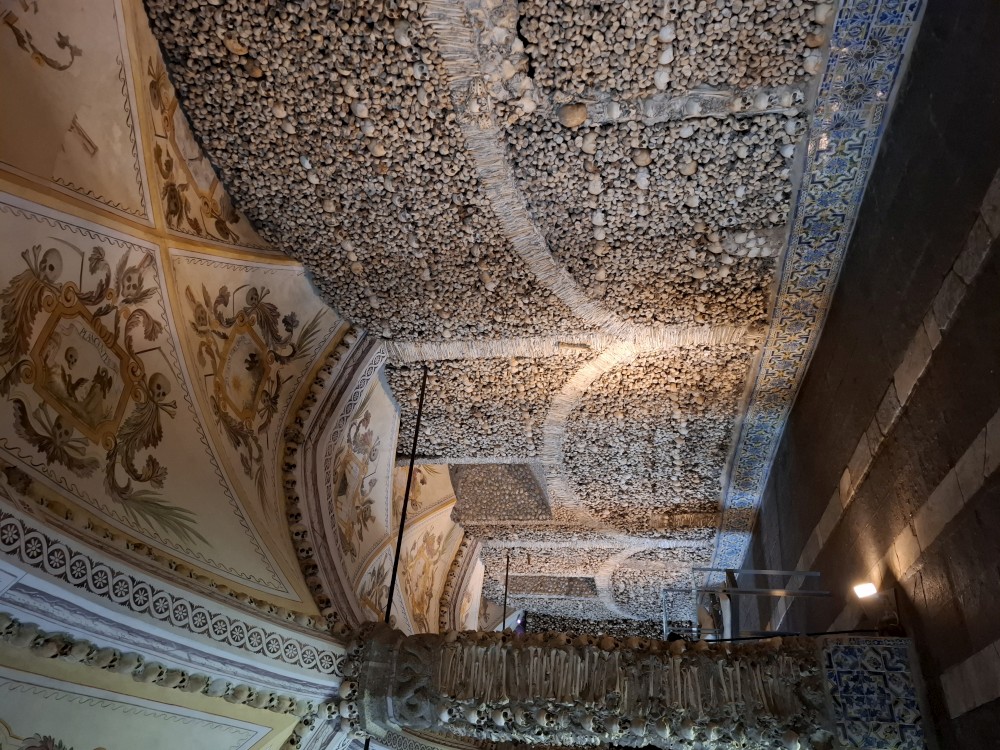 Vyjíždím z garáže a zastavuji u ostatních. Nasazujeme rakev, nandaváme kufry, opouštíme Lisabon. Jedeme pře most 25.dubra přes řeku Tajo a pak dál po dálnici do Évory. V Évoře parkujeme na velkém odstavném parkovišti nedaleko centra. Jdeme přes zahradu kolem Palácio de Dom Manuel k římským ruinám Ruínas Fingidas. Pak pokračujeme ke kostelu Igreja de São Francisco, kde je Chapel of Bones, tedy kaple z kostí.