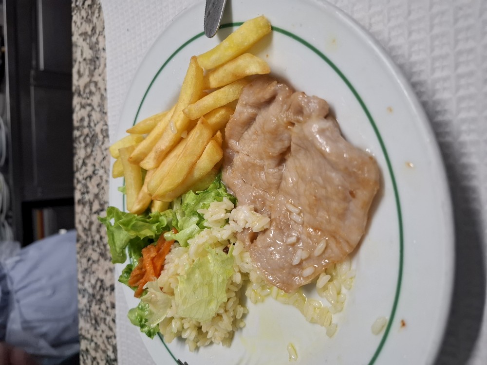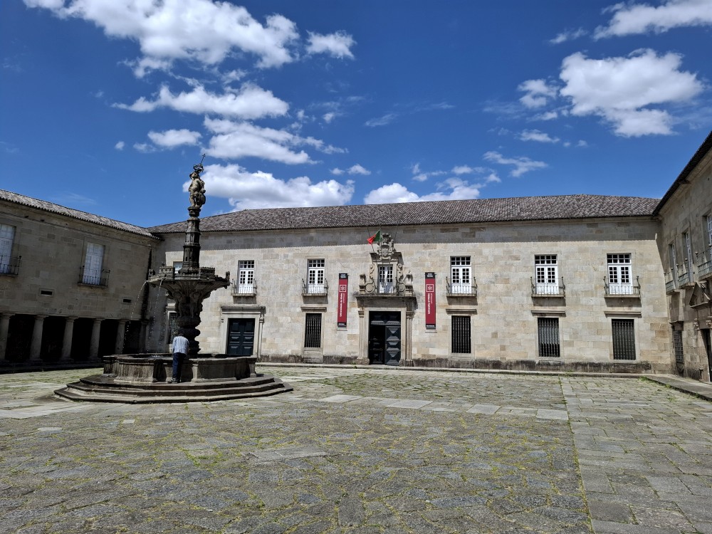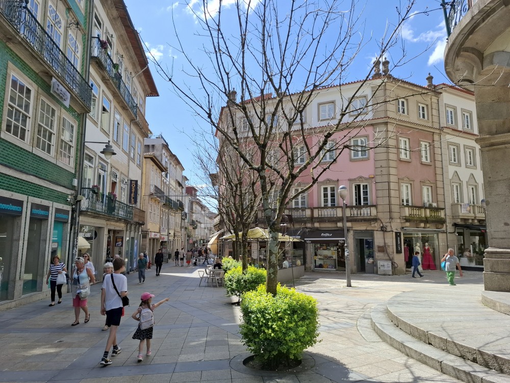 Sedáme zase do auta a přejíždíme do Bragy. Parkujeme v podzemním parkovišti hned u centra. Hledáme restauraci, kde bychom si dali pozdní oběd. Po krátkém okruhu centrem se dostáváme do restaurace, která je hned vedle našeho parkoviště. Sedíme na terase. Dáváme so pečené vepřové, smažené telecí řízečky, brambory, hranolky, rýži. Jsou to 2 velká jídla s hromadou příloh. Všichni se najíme do syta.