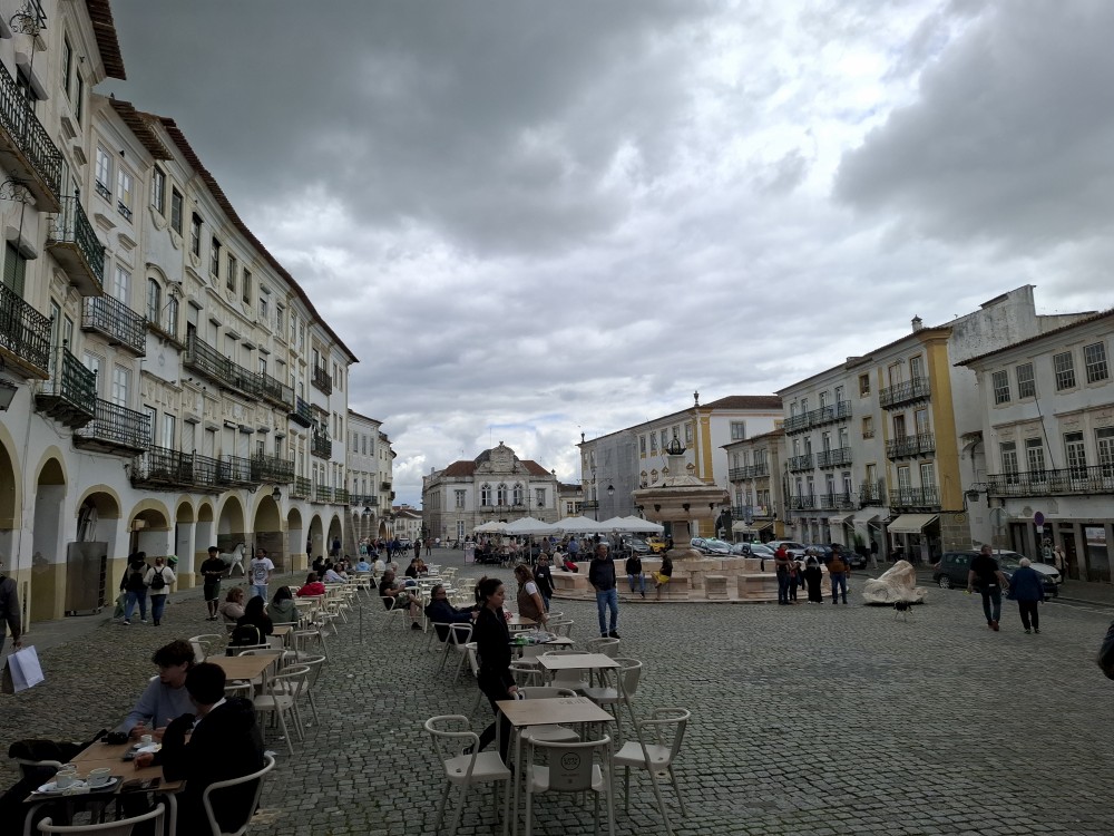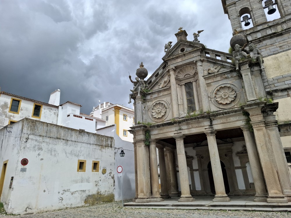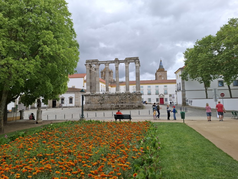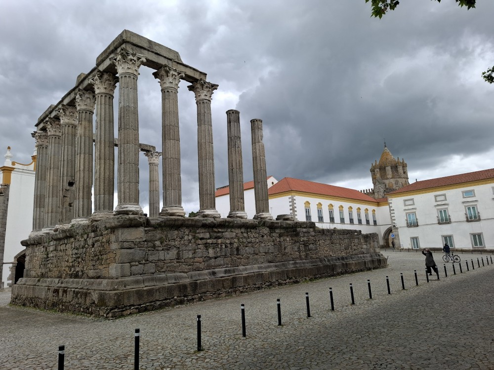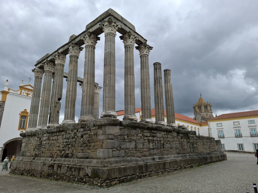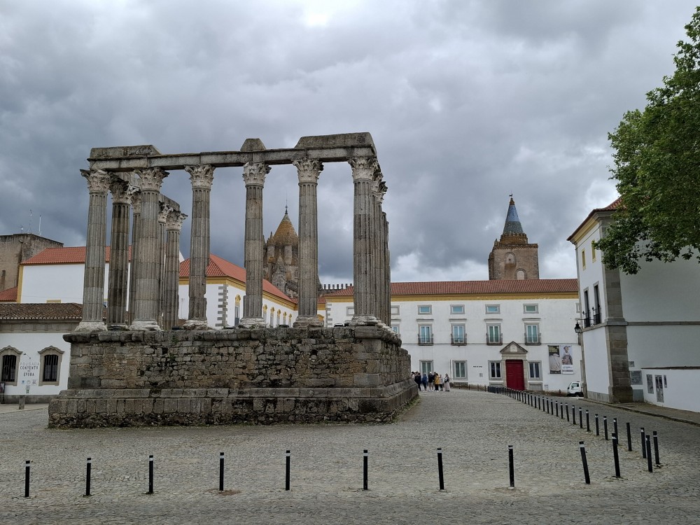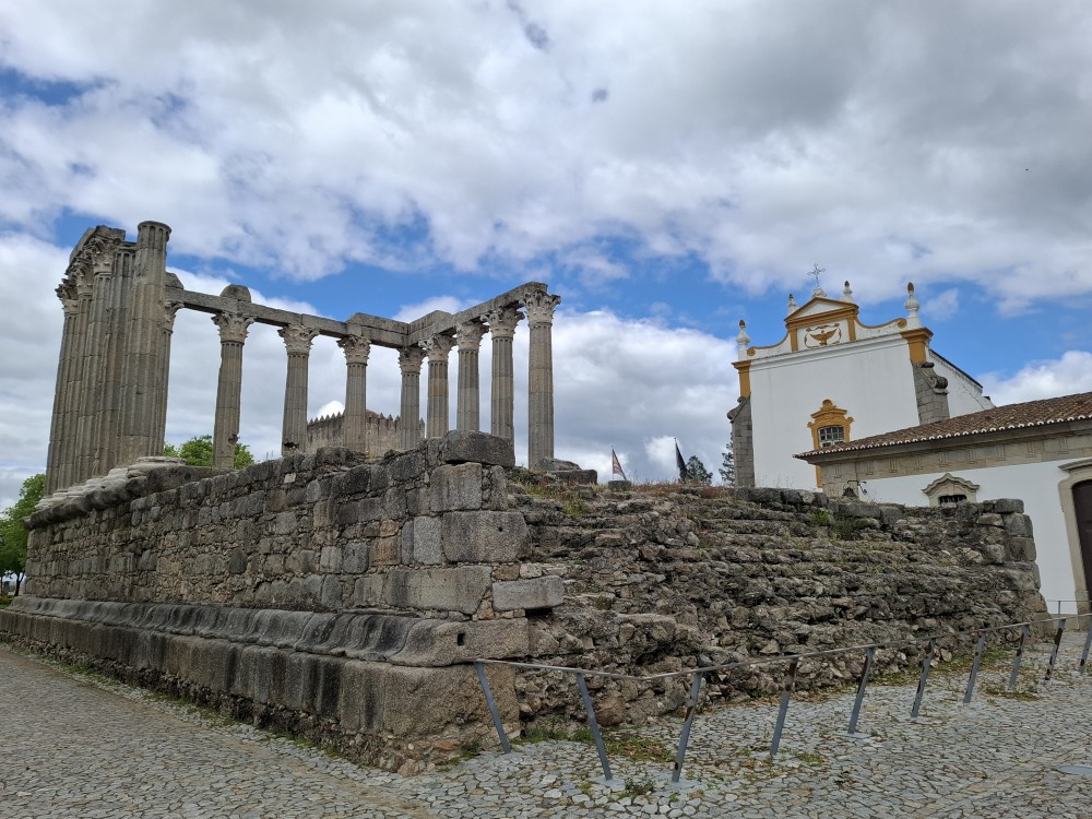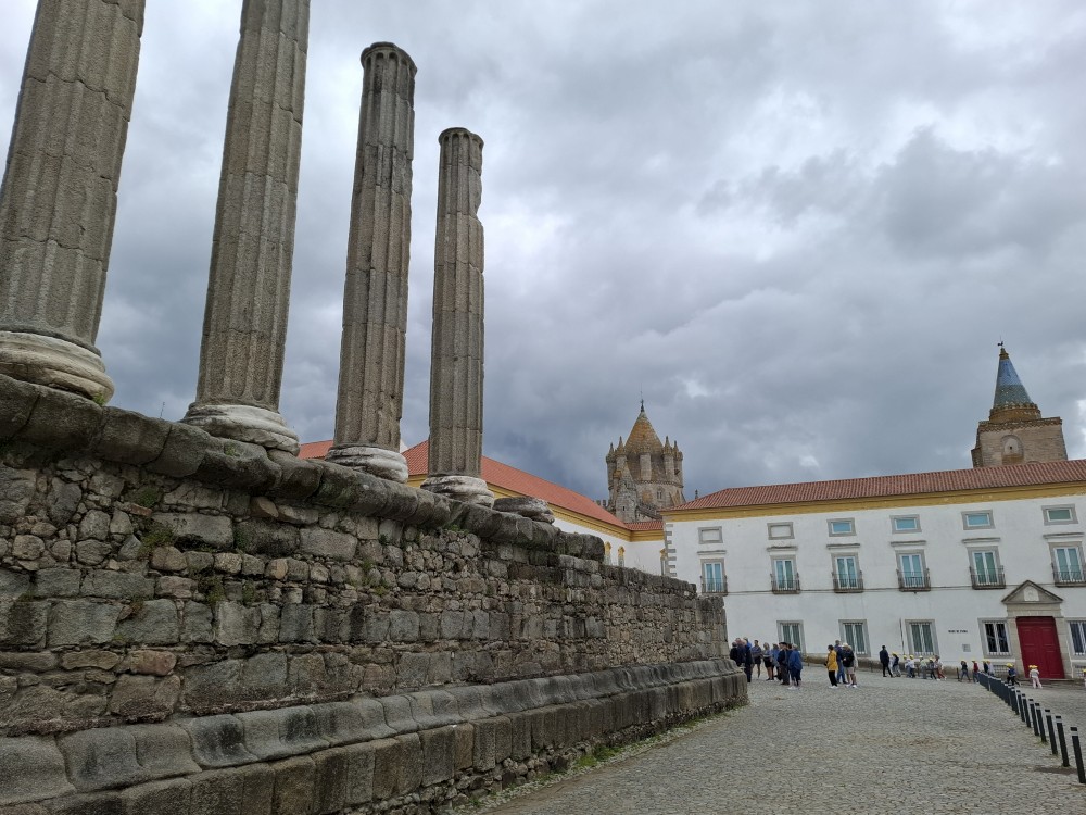 Jdeme dále Évorou, kolem Church of Nossa Senhora da Graça, Igreja de São Vicente na hlavní náměstí Praça do Giraldo, kde je kostel Igreja de Santo Antão. Pak pokračujeme k Římskému chrámu v Évoře. Stojí na malebném náměstí. Na pozadí sloupů římského chrámu stojí National Museum Frei Manuel do Cenáculo a také katedrála Sé.
