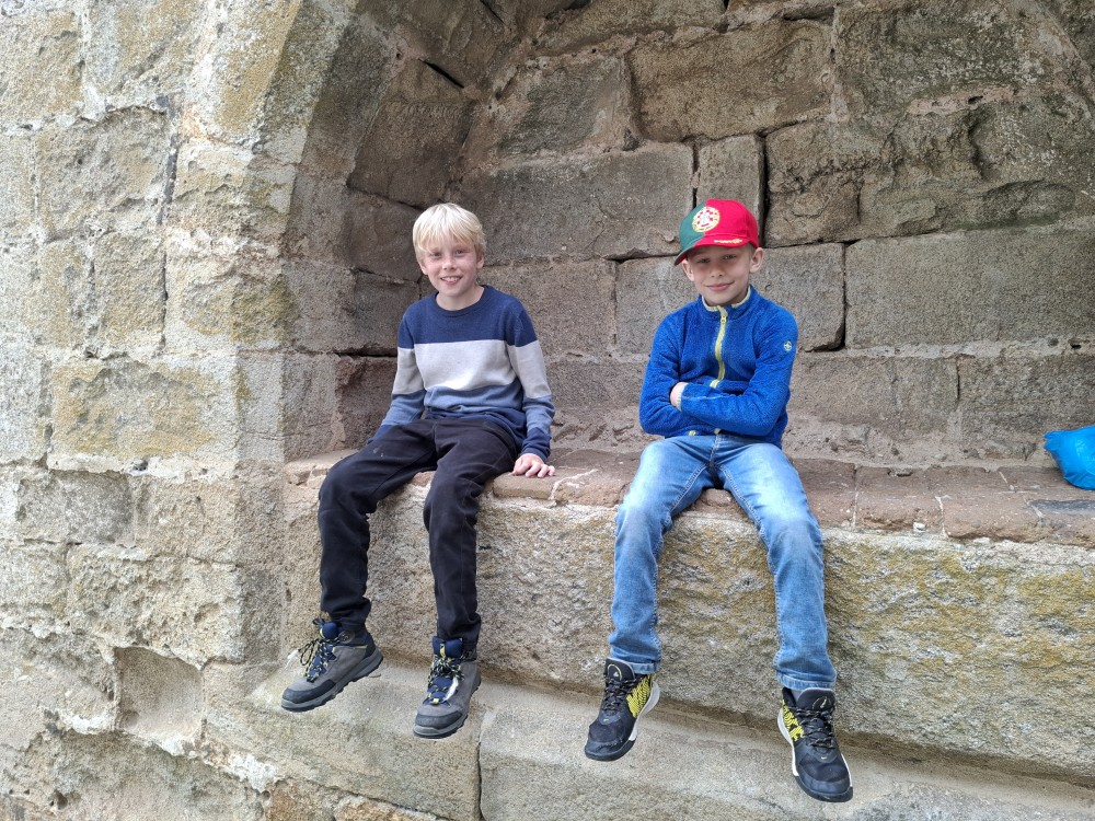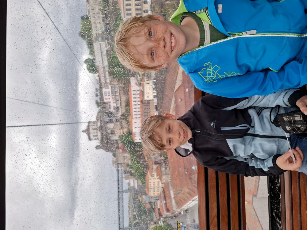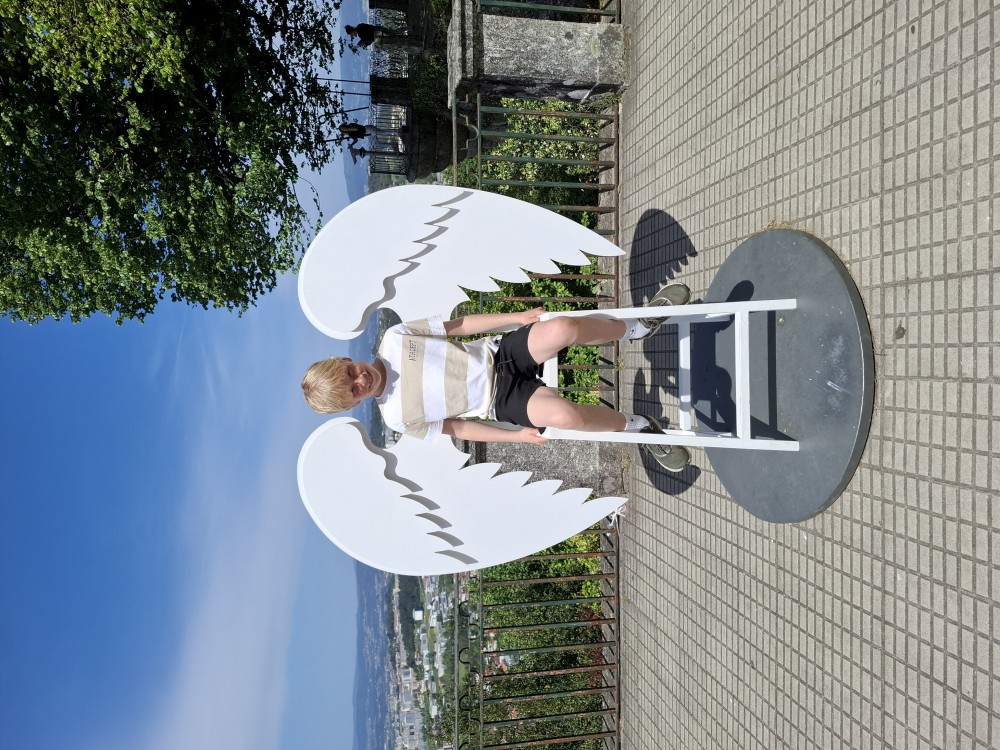 Jdeme s kufříkama asi 400 m do kopce. Přes automatický check-in se dostáváme na apartmán. Vybalujeme, kluci se už celkem tradičně hádají, kde kdo bude spát. Pak už vyrážíme na prohlídku města. Začínáme na hradě. Platíme vstupné (asi 30 EUR celkem). Jsou zde krásné výhledy na celé město. Dáváme si u stánku kávu a já pivo. Pak jdeme na samotný hrad, kde chodíme po hradbách a kocháme se výhledy. Bětuška hledá paní v růžovém, kterou viděla na hradbách, když jsme byli dole.