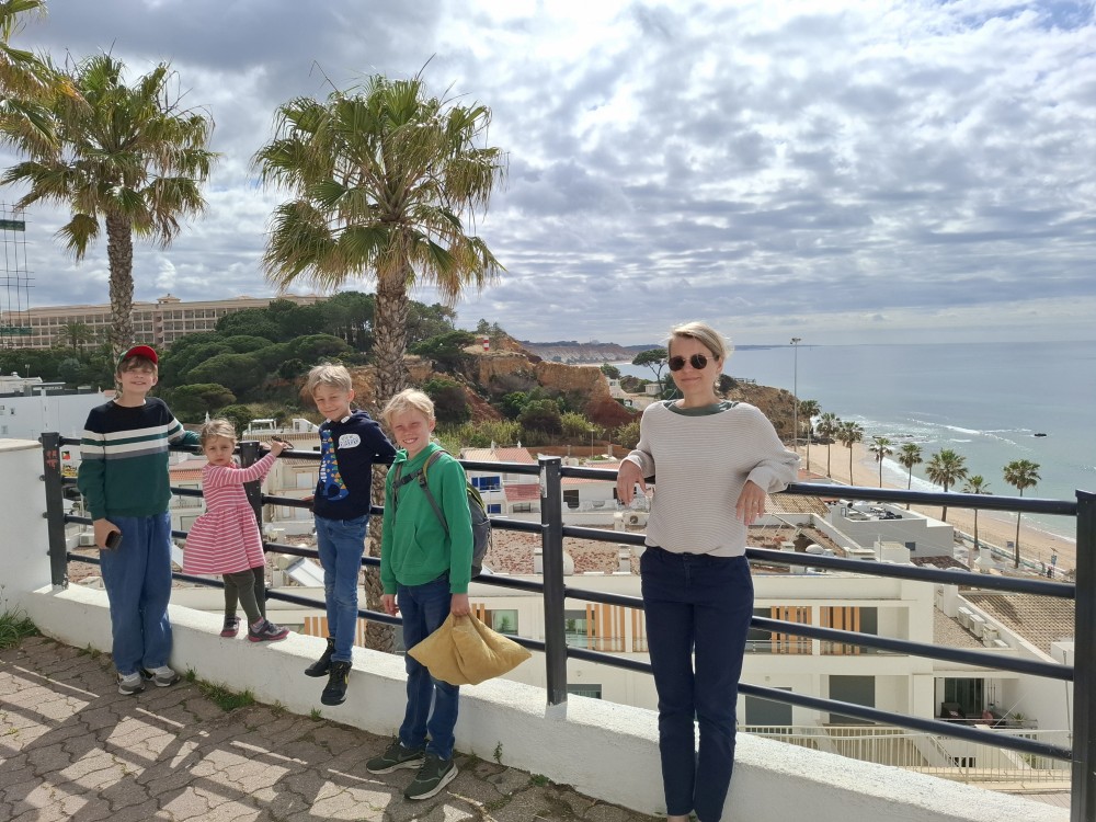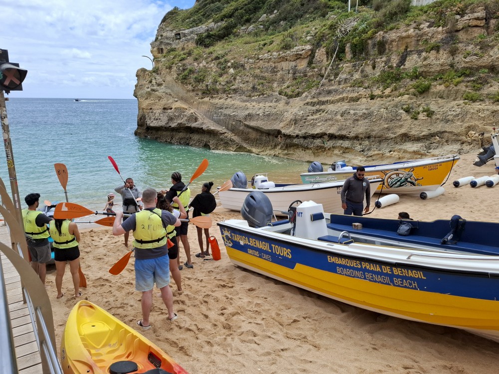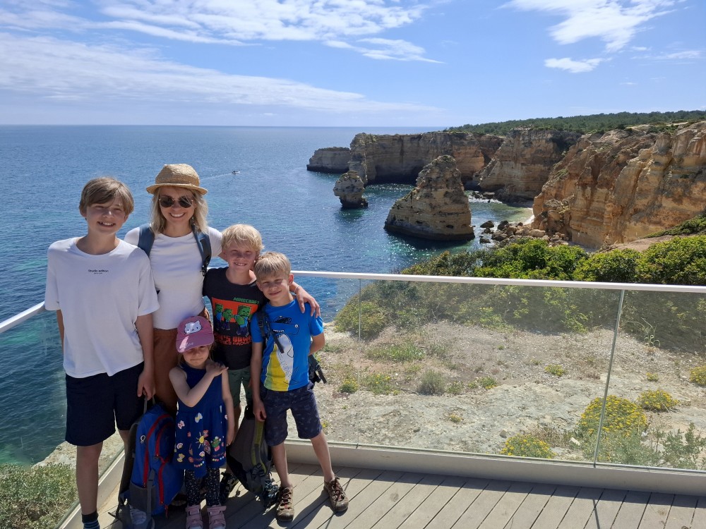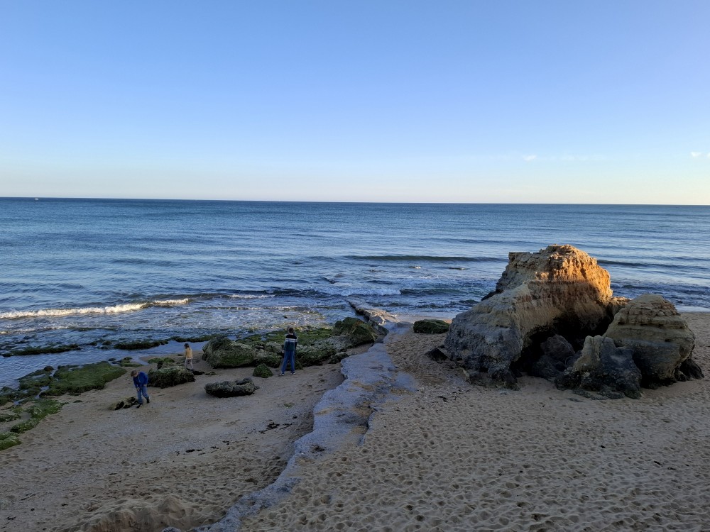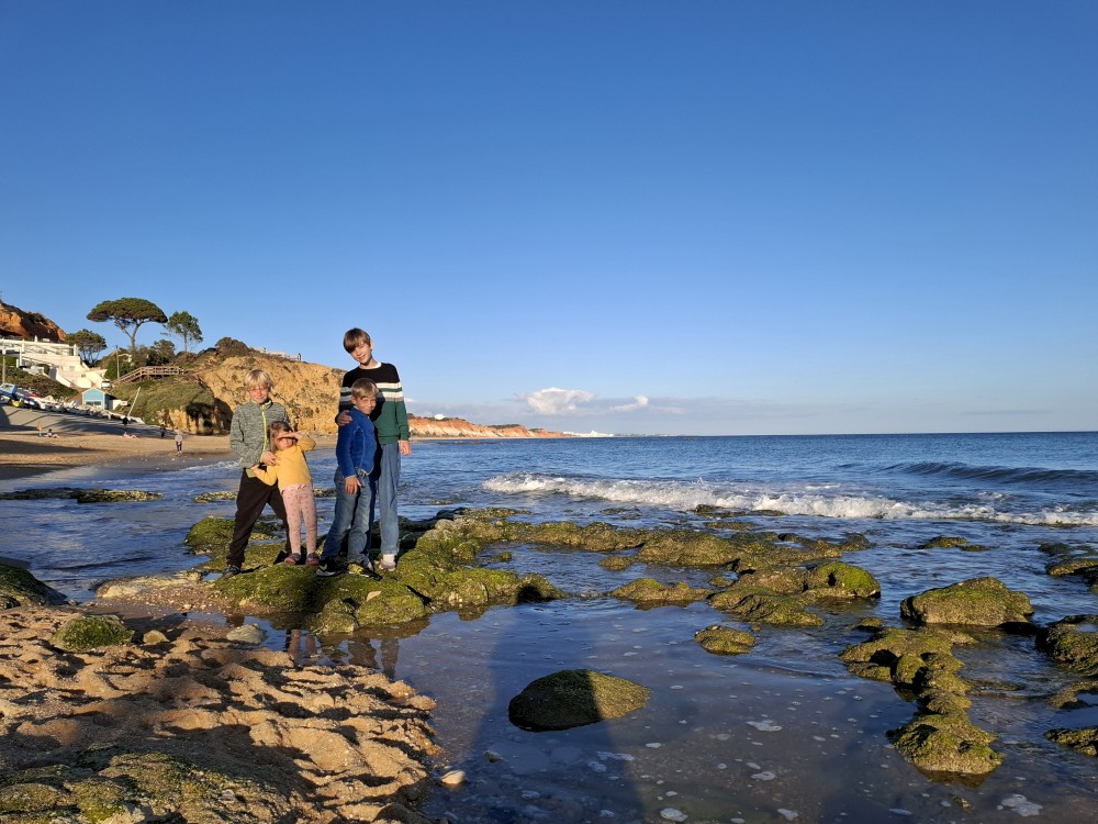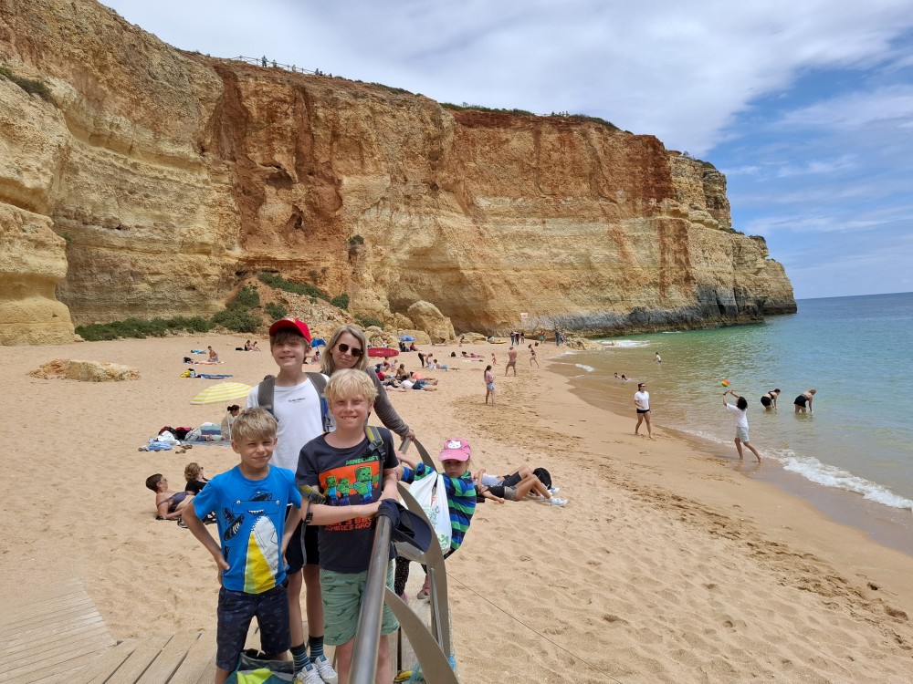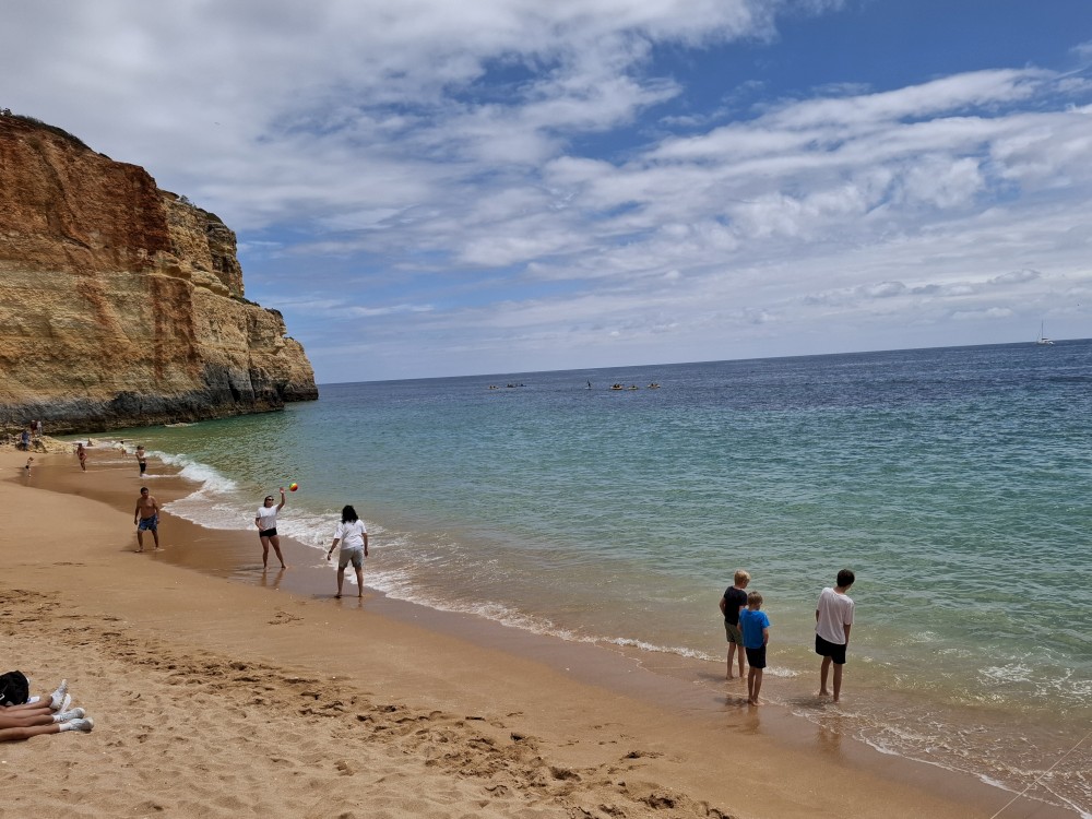 Snídáme. Pak doháníme školu. Kluci dělají zadané úkoly ze školy skoro celé dopoledne. Pak se jdou děti koupat do bazénu. Na výlet vyrážíme až kolem 13 hodiny. Jedeme na pláž Benagil. Tam si kupujeme lístky na koď, na projížďku po místních jeskyních, hlavně na jeskyni Benagil, která je ikonická svým otvorem ve stropě.