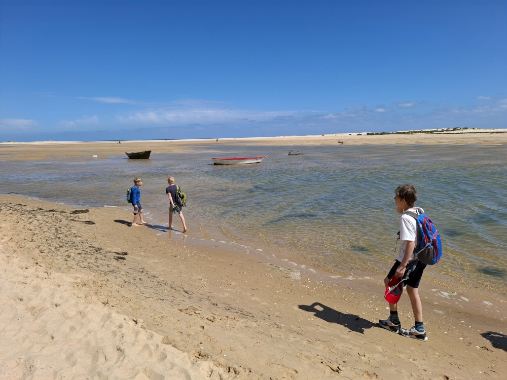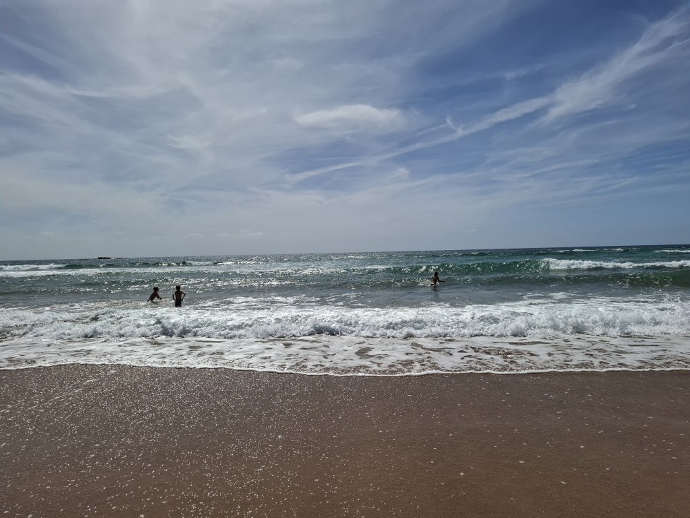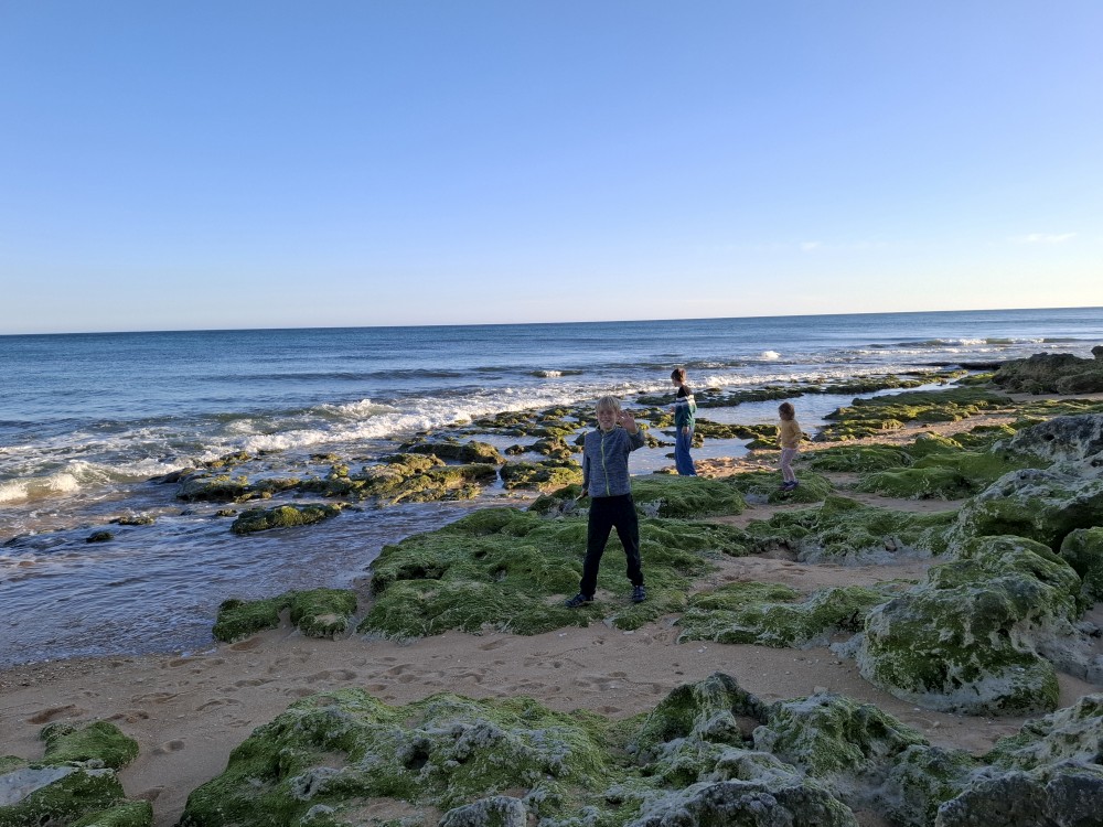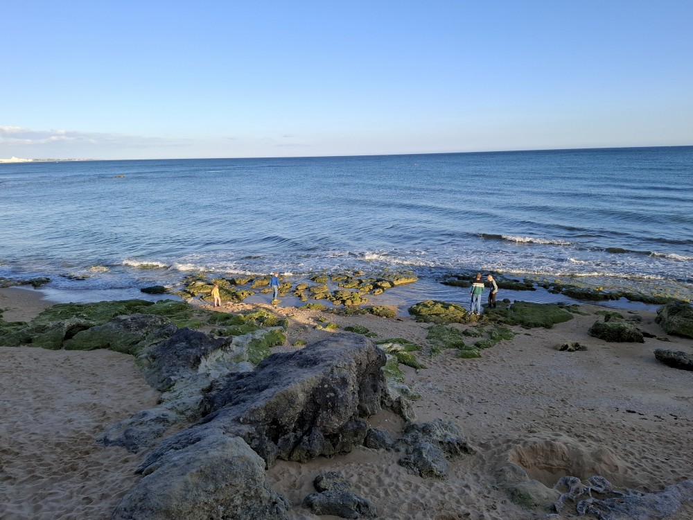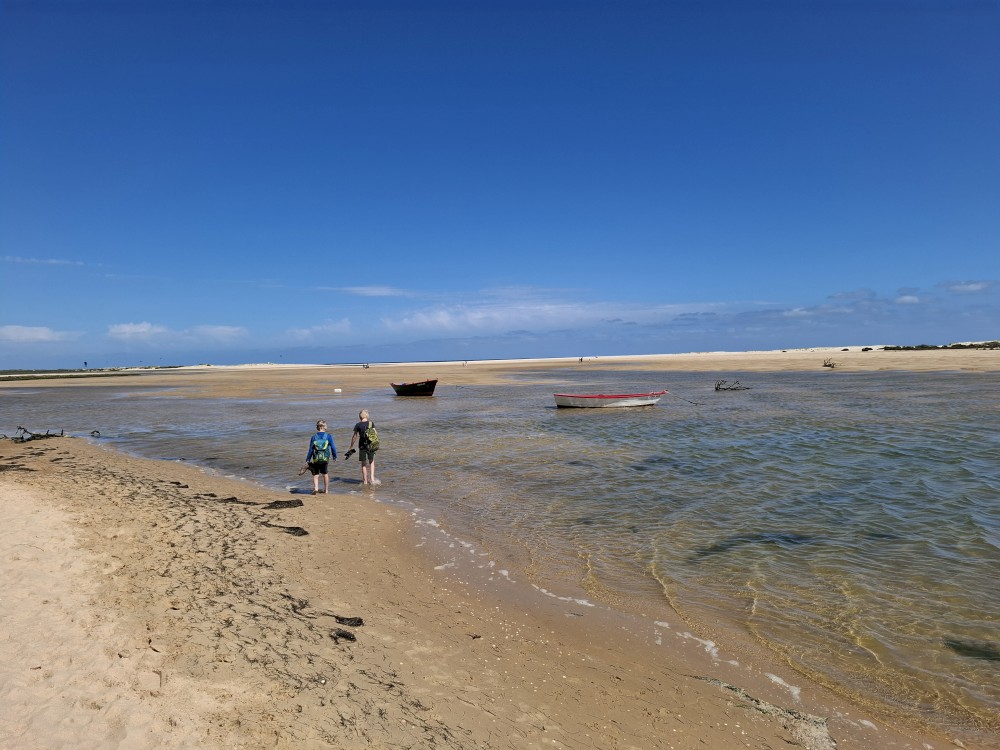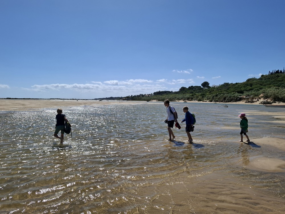 Scházíme dolů, prodíme se bosky lagunou, děti nahánějí ryby. Pokračujeme až k oceánu. Jsme tu úplně sami, koupeme se nazí v oceánu. Je to nádhera a svoboda. Už ale musíme spěchat zpět k autu, protože máme domluvený sraz s Ťoupalíky v Huelvě. Sedáme do auta, přejíždíme po velkém mostě do Španělska a za chvíli jsme v Huelvě.