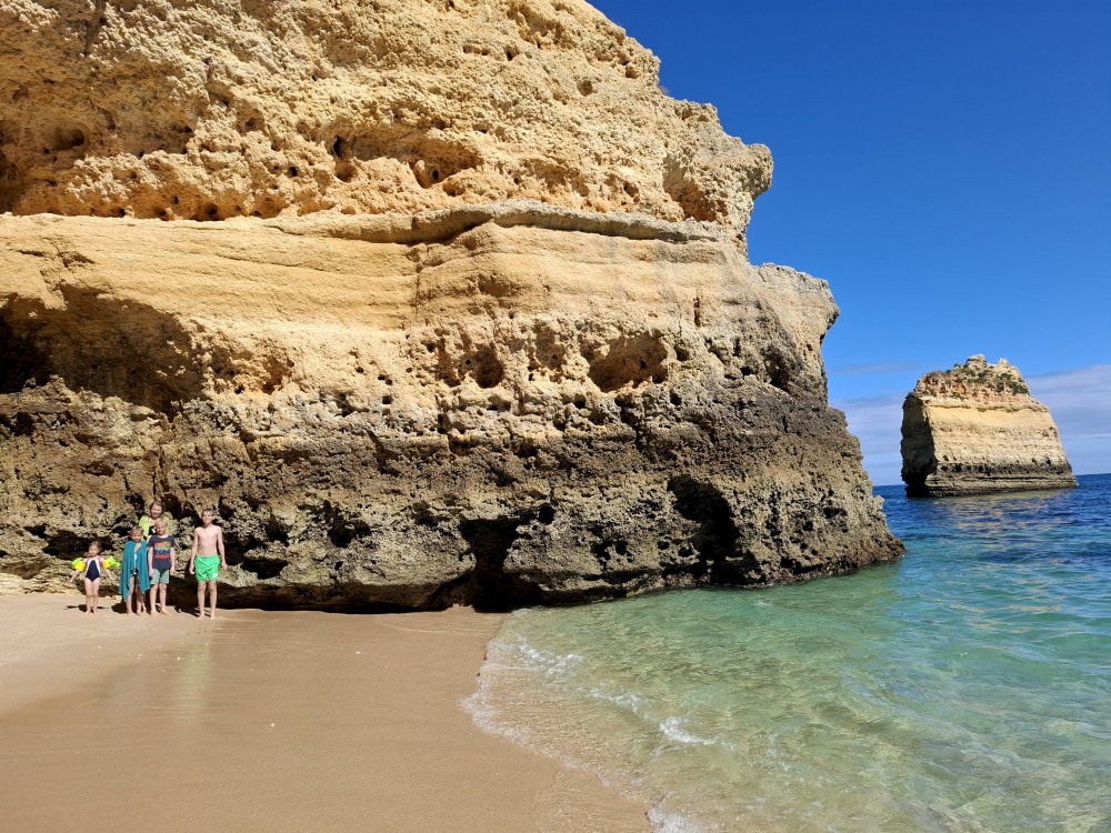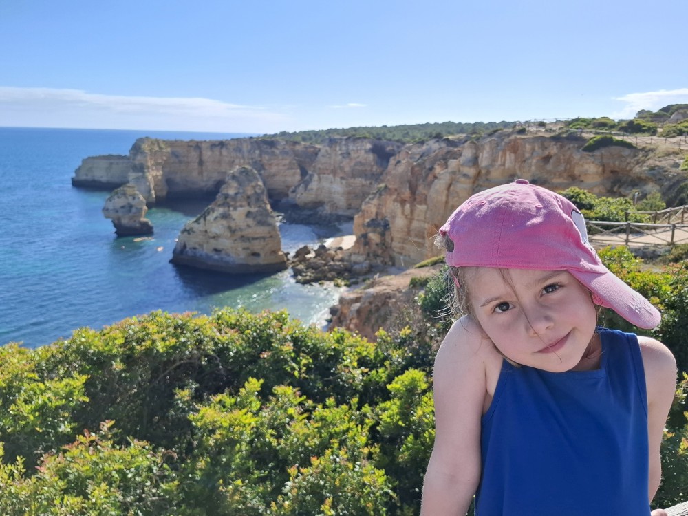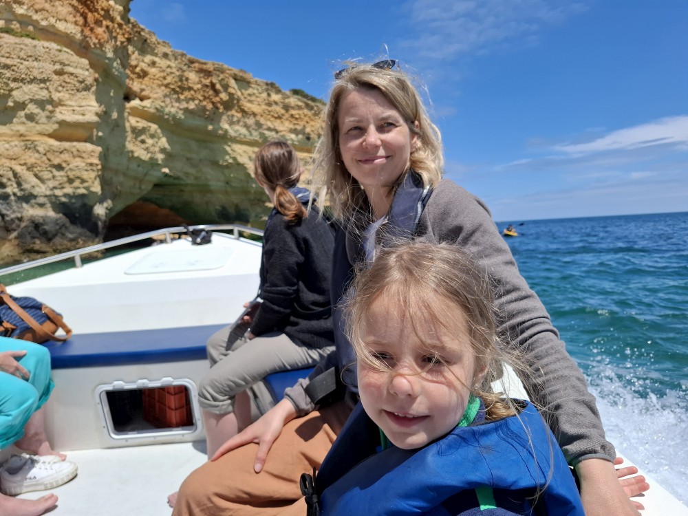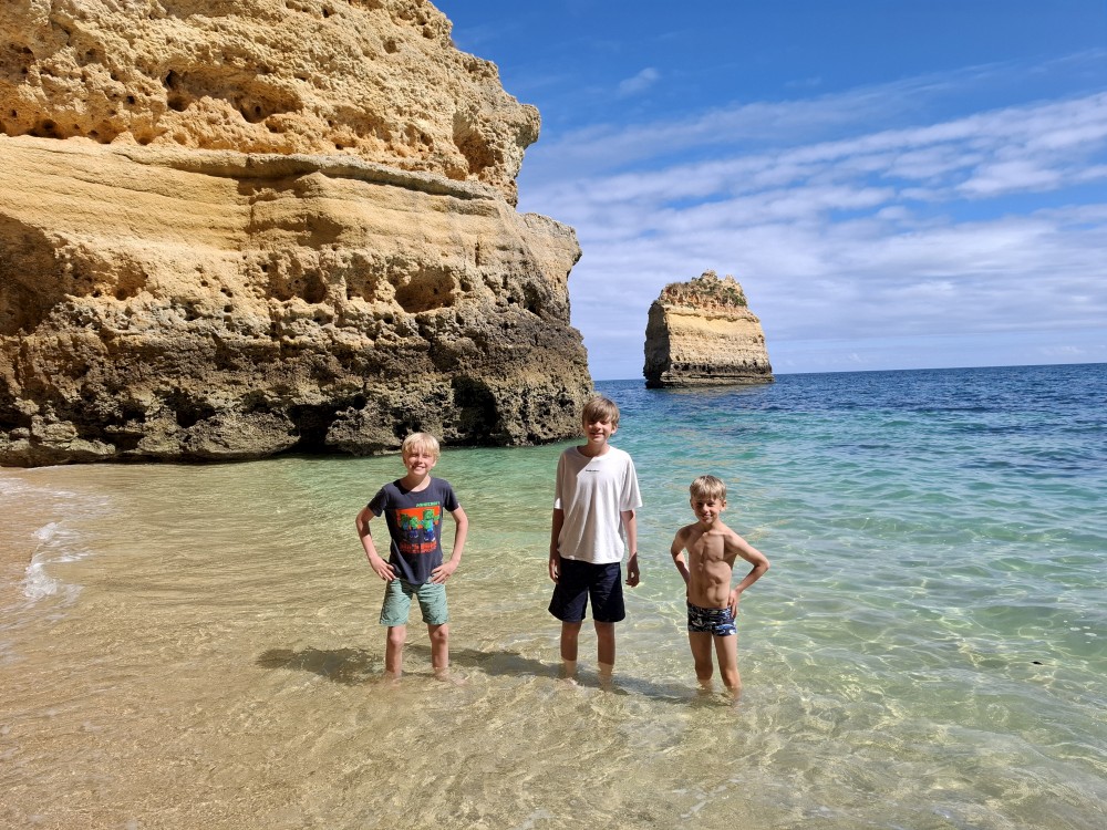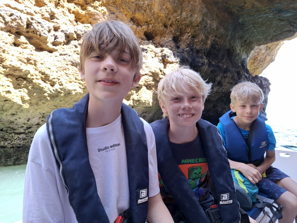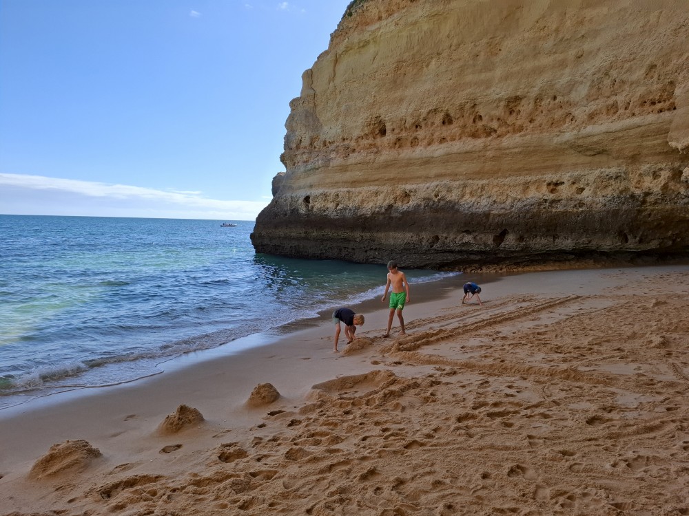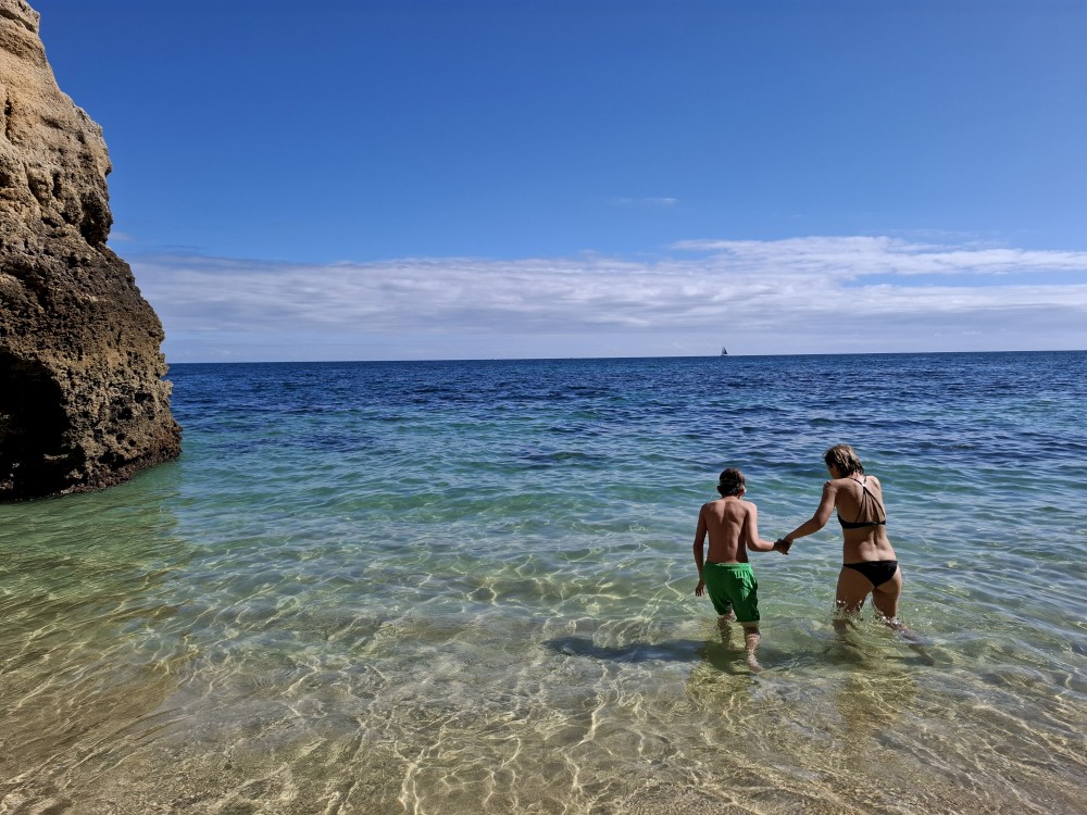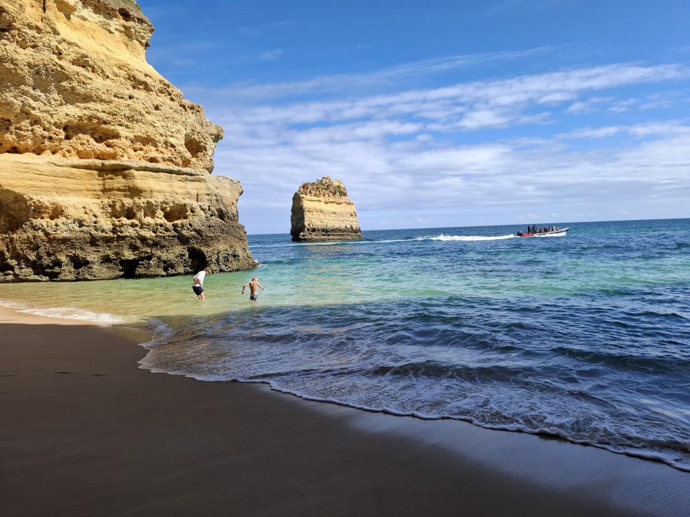 Průvodce, který s námi sedí na lodi a umí dobře anglicky nám poradil a ukázal, kde je tajný vstup na pláž, která přiléhá přes útes k pláži Marinha. U pláše Marinha děláme rychlé kolo člunem jedoucím na plný plyn. Ve stejném tempu pokračujeme zpět na pláž Benagil, je to docela adrenalin, děti jsou nadšené.