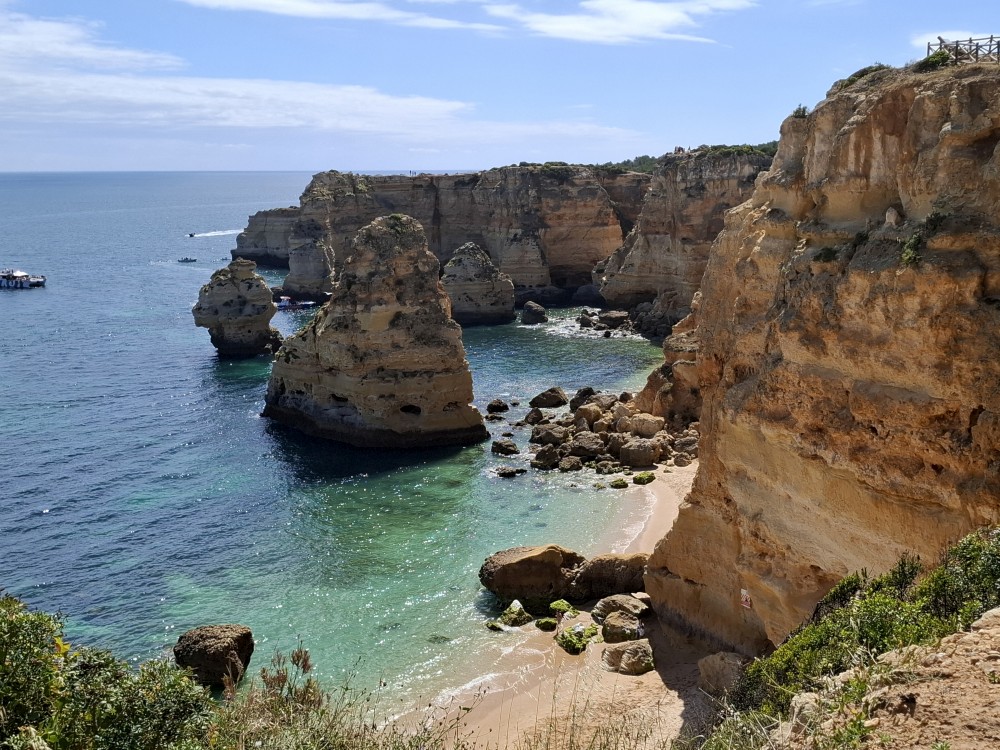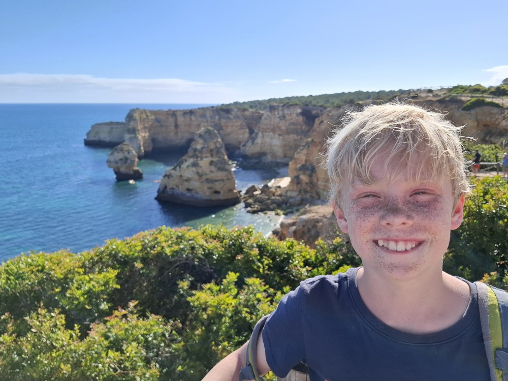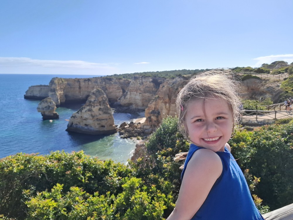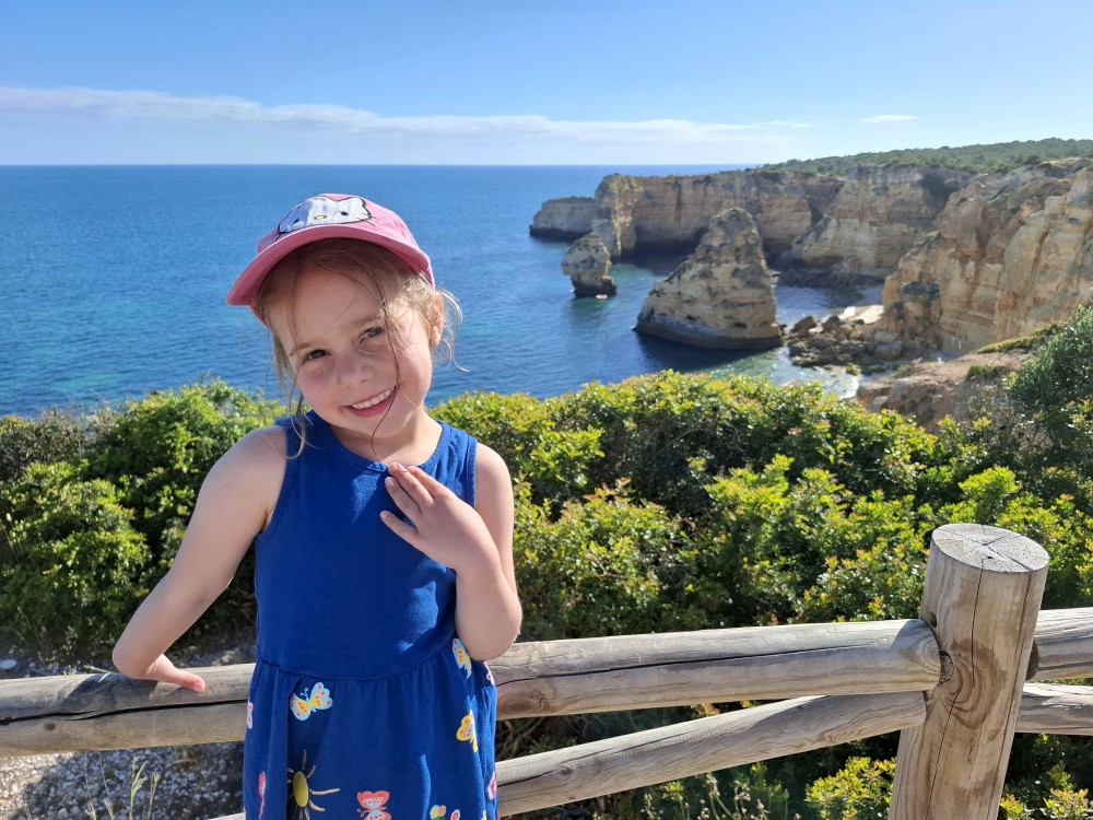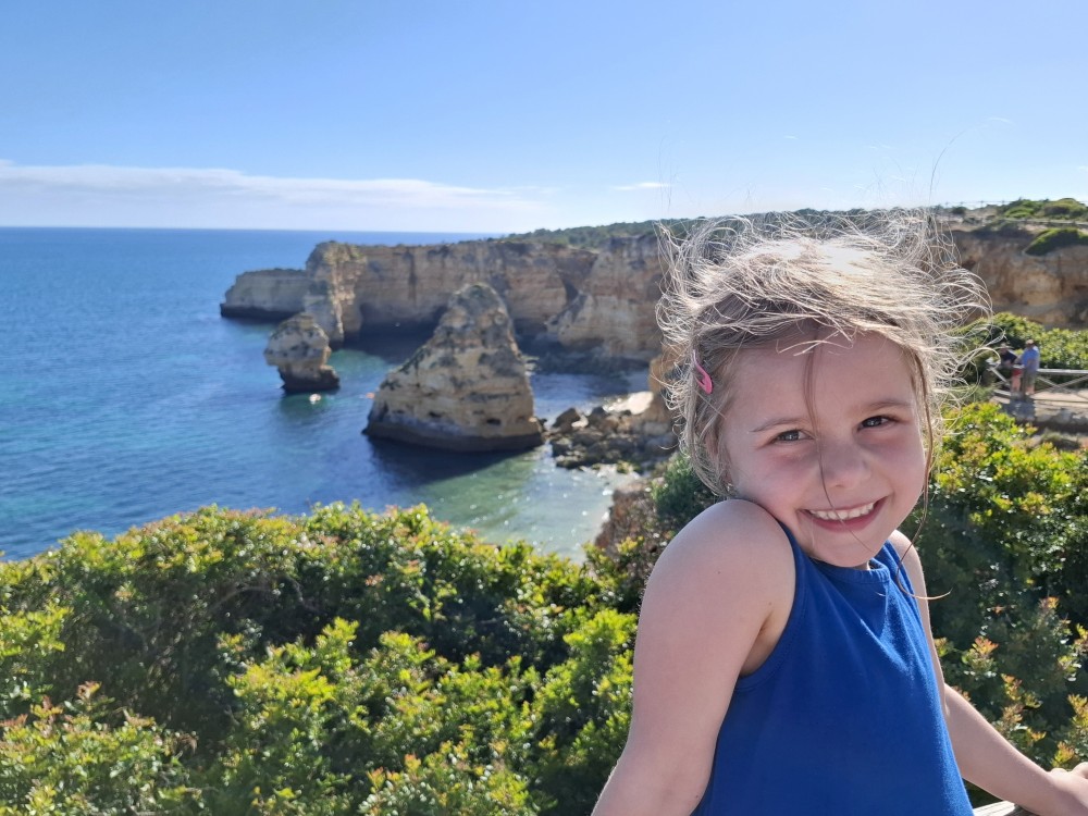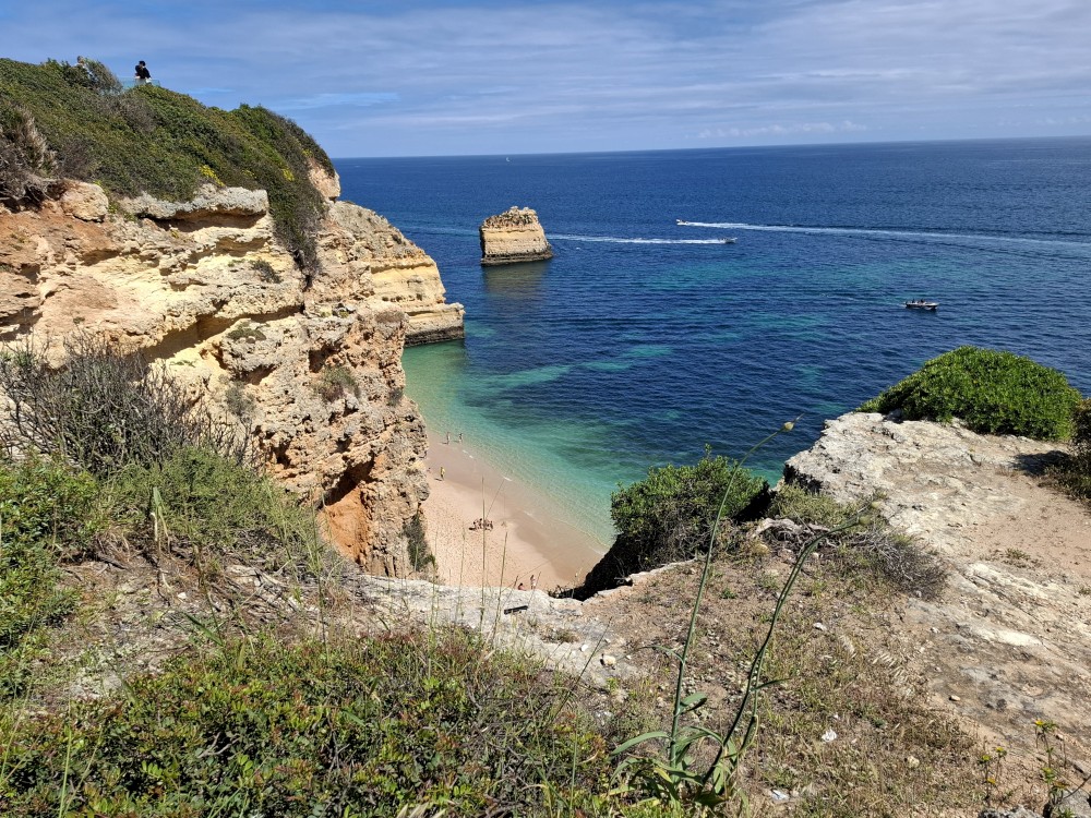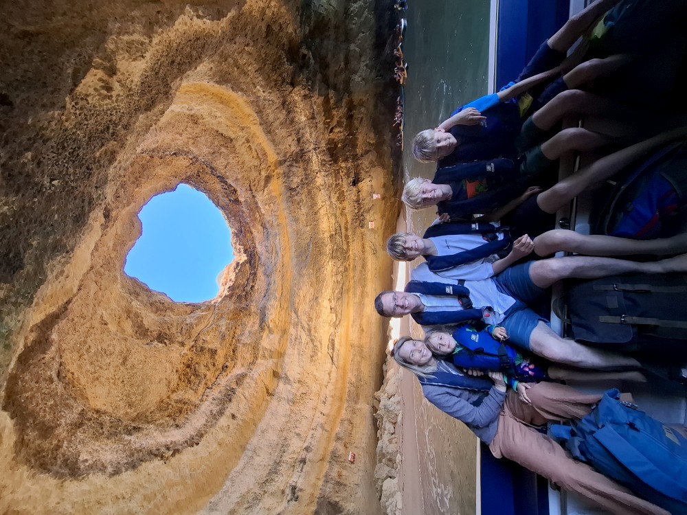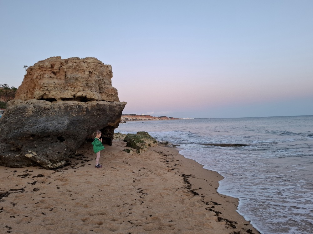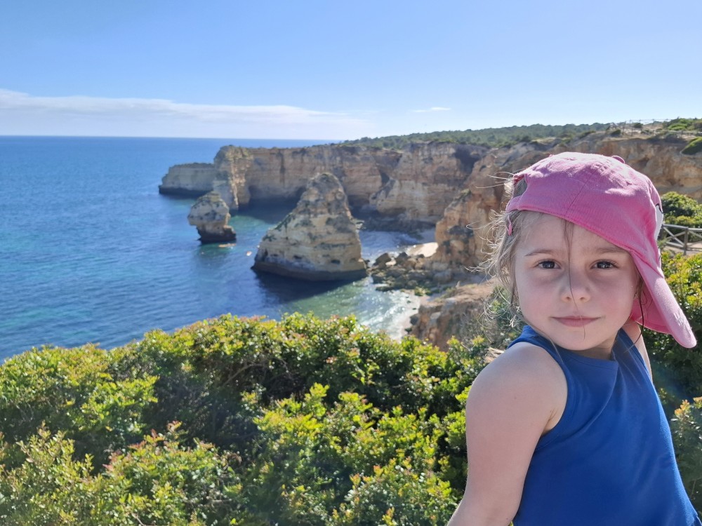 Průvodce, který s námi sedí na lodi a umí dobře anglicky nám poradil a ukázal, kde je tajný vstup na pláž, která přiléhá přes útes k pláži Marinha. U pláše Marinha děláme rychlé kolo člunem jedoucím na plný plyn. Ve stejném tempu pokračujeme zpět na pláž Benagil, je to docela adrenalin, děti jsou nadšené.