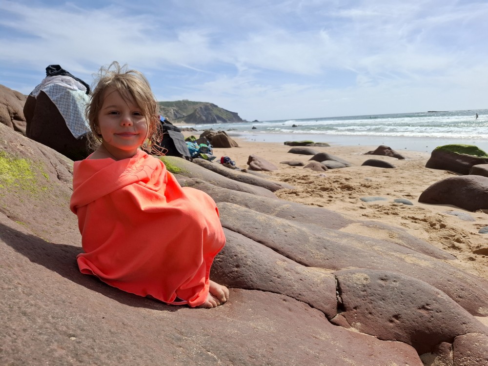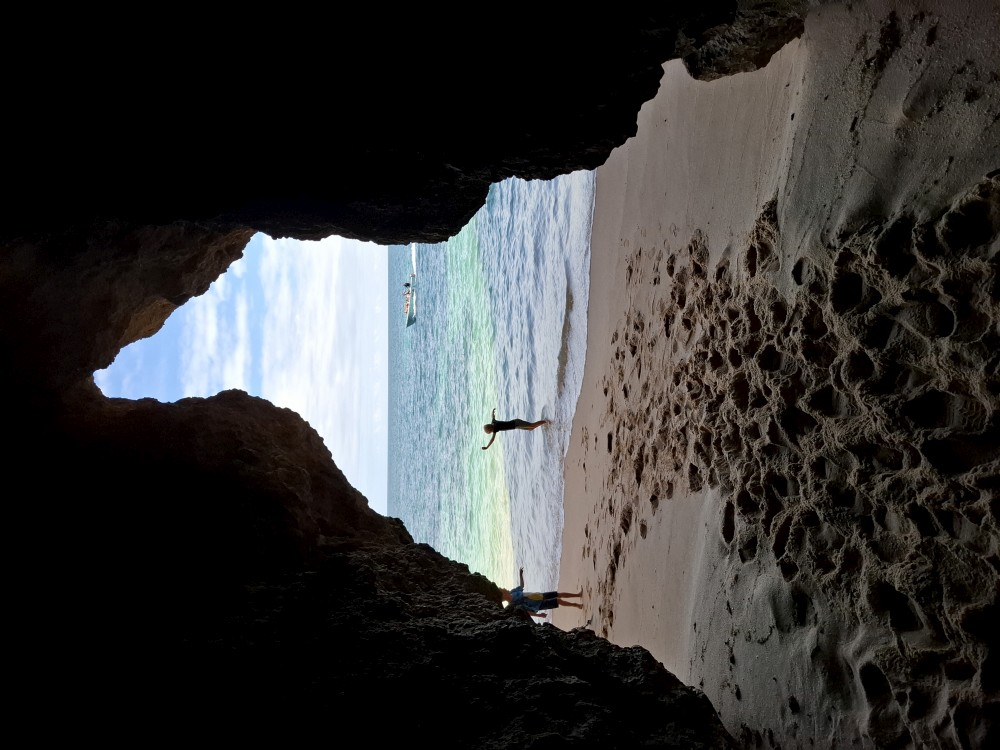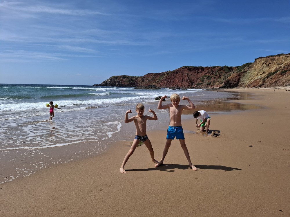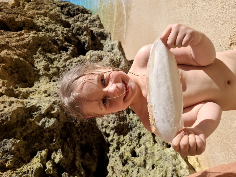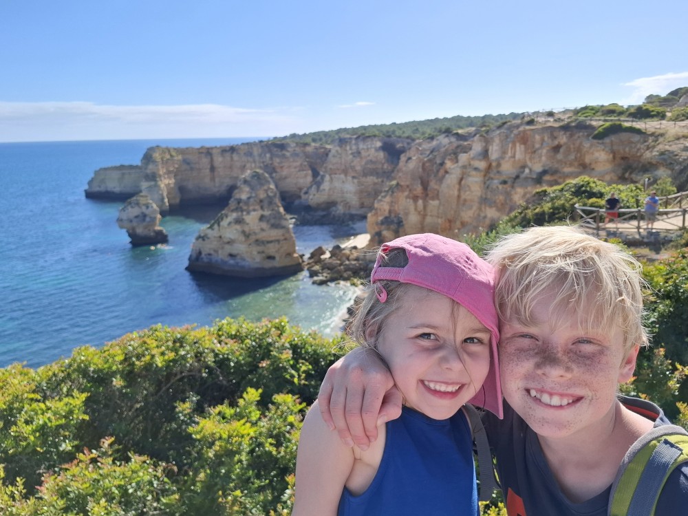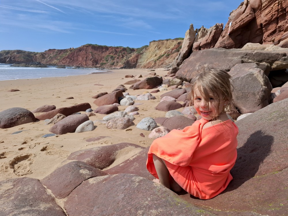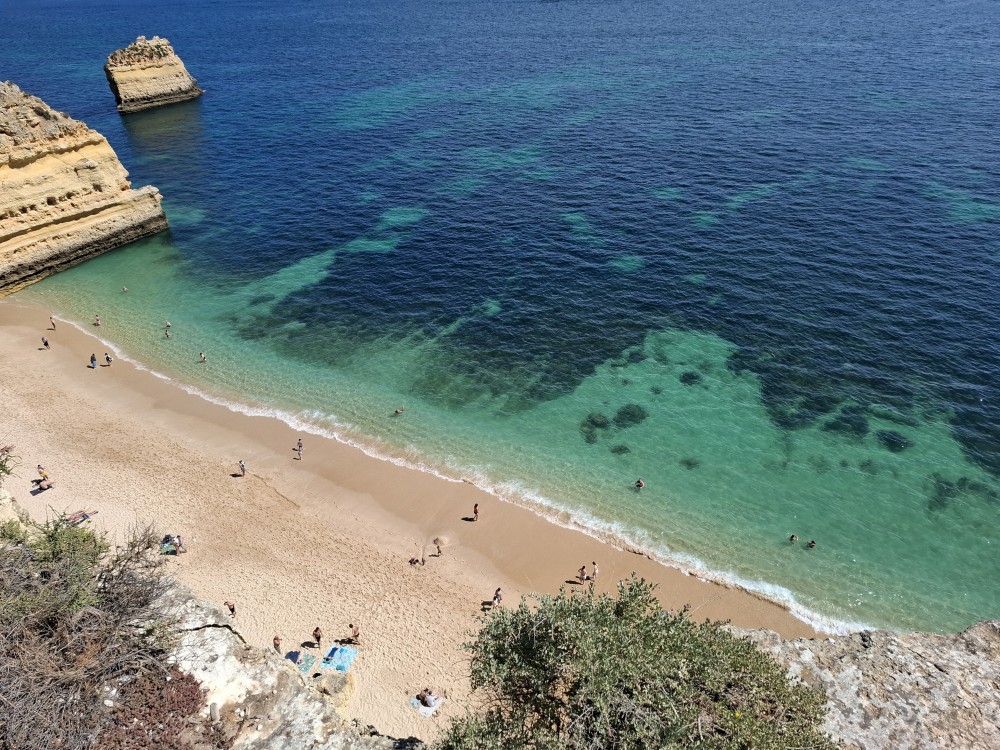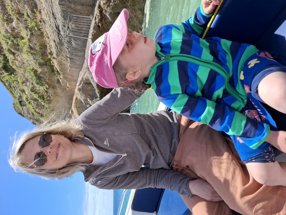Průvodce, který s námi sedí na lodi a umí dobře anglicky nám poradil a ukázal, kde je tajný vstup na pláž, která přiléhá přes útes k pláži Marinha. U pláše Marinha děláme rychlé kolo člunem jedoucím na plný plyn. Ve stejném tempu pokračujeme zpět na pláž Benagil, je to docela adrenalin, děti jsou nadšené.