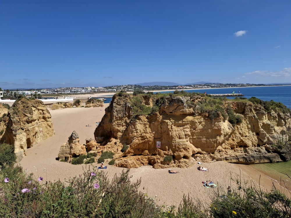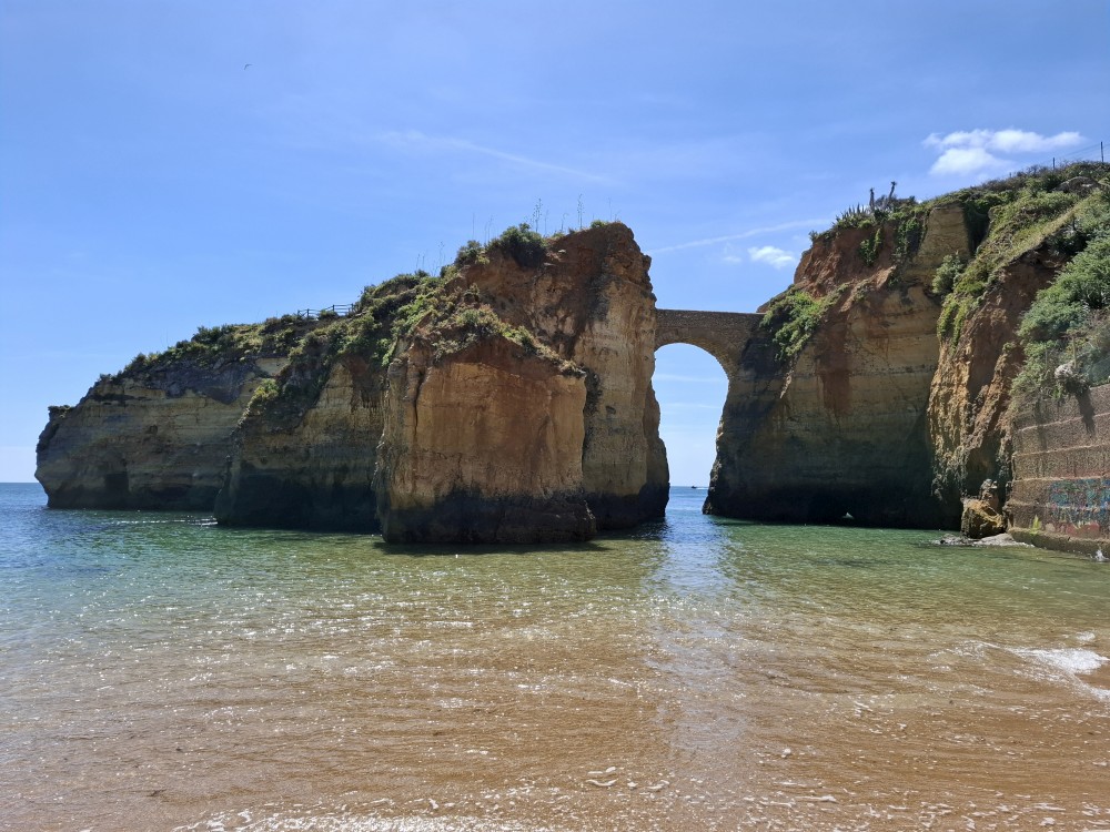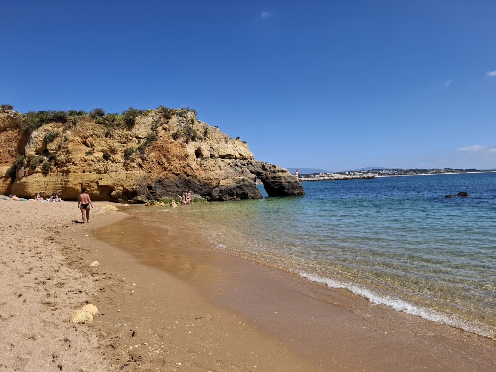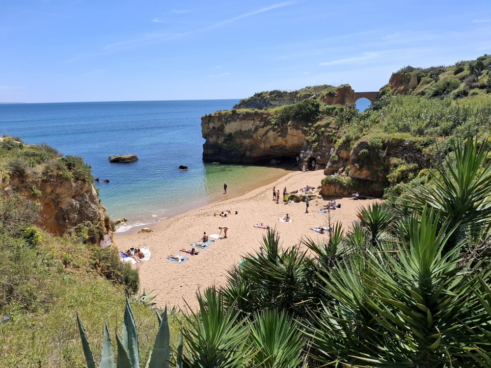 První zastávku dáváme v Lagosu. Parkujeme na velkém parkovišti poblíž pláží a jdeme pěšky na pláž Praia dos Estudantes. Je to pěkná malá pláž mezi skalisky s průchodem na vedlejší pláž tunelem vytesaným ve skále. Koupeme se. Pak se vydáváme po schodech na hlavní ulici a jdeme po ní ještě k pláži Pinhao. Ta je ale zavřená, kvůli nestabilním útesům nad ní.