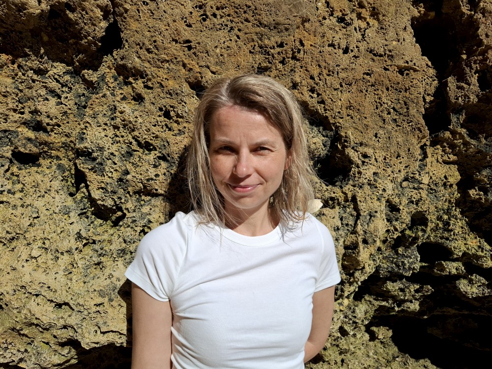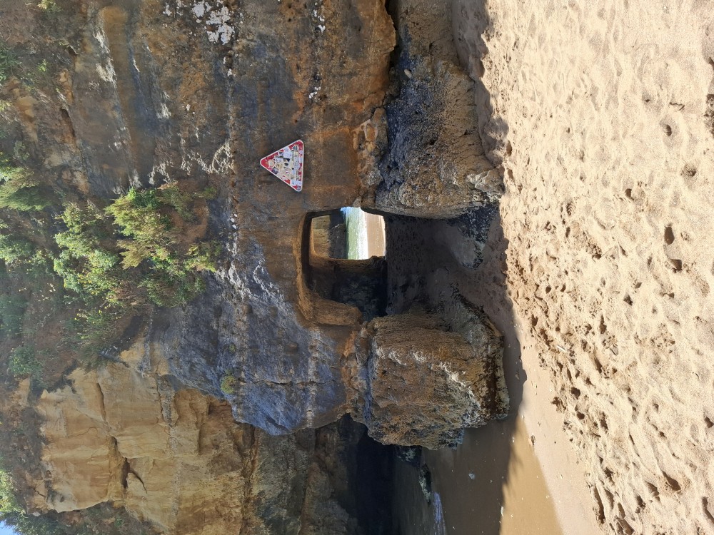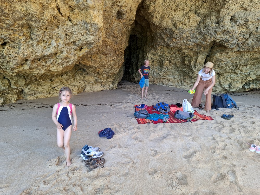 Po projížďce si dáváme v restauraci Arroz de něco, prostě chobotnici s nějakou speciální rýží. Bylo to dobré, ale děti to moc nechtěly. Dávají si alespoň Coca Colu a Bětuška zmrzlinu. Pak jdeme k autu a přesouváme se k pláži Marinha. Nacházíme tajný vchod na vedlejší pláž. Musíme překonávat překážky, musíme projít křivolakou úzkou jeskyní. To už se nám otevírá výhled na naši soukromou pláž. Úplně sami tu nejsme, je tu ale asi jen 6 lidí.
