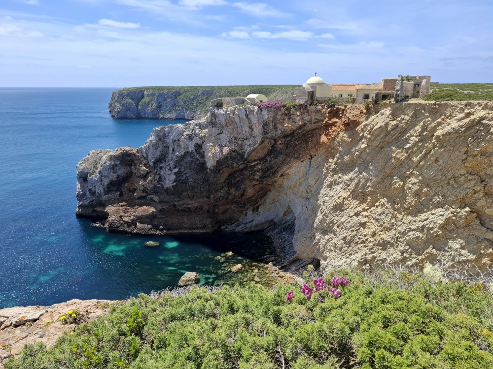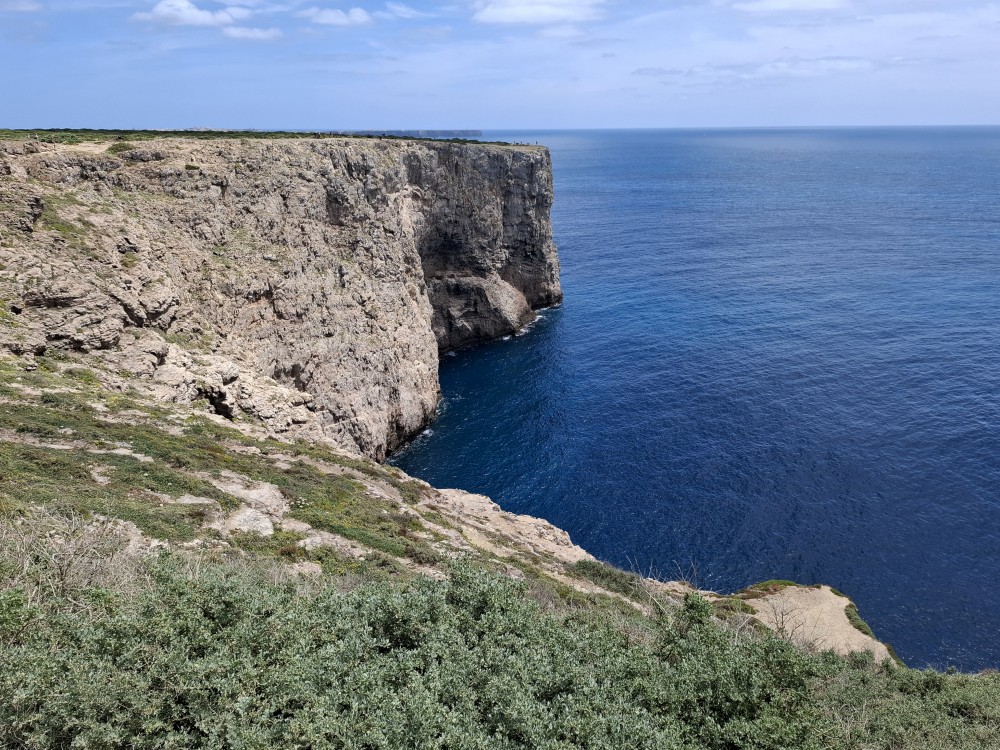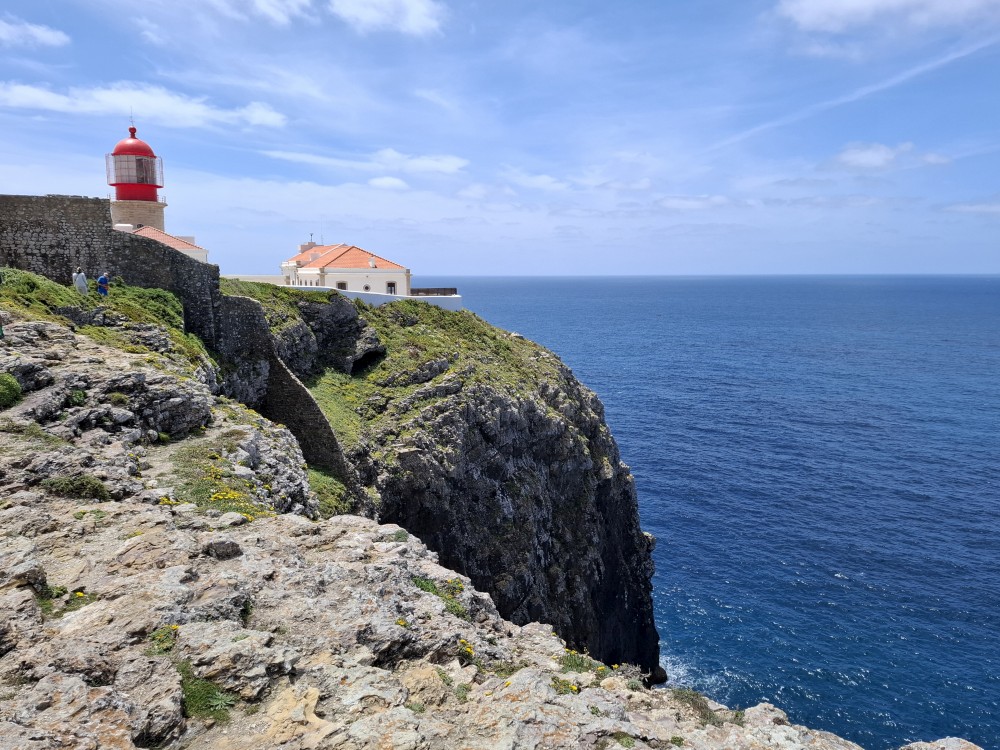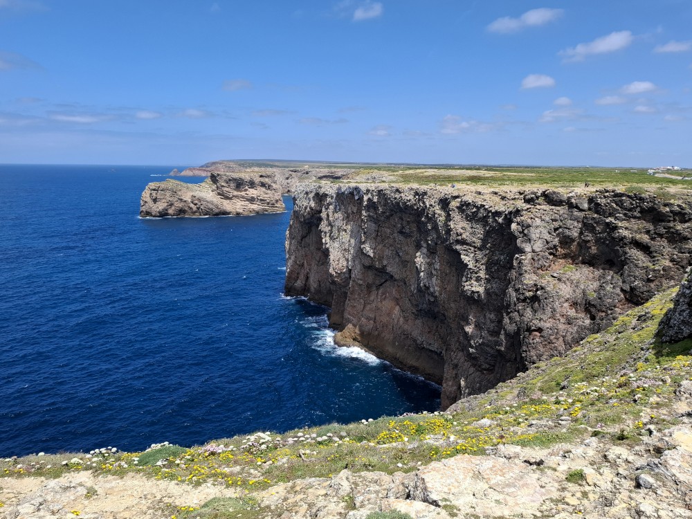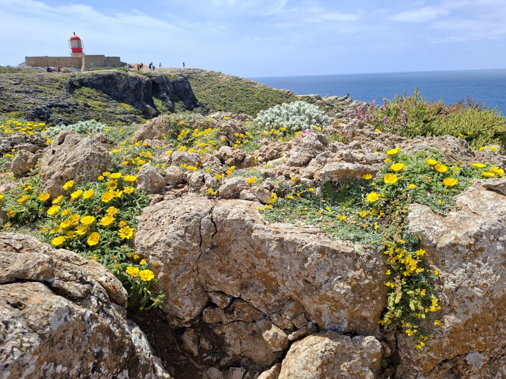 Jdeme tedy zpět k autu a pokračujeme na západ na Mys Cabo de Sao Vicente. Zastavujeme asi dva kilometry před samotným mysem a kocháme se na výhledy na skalnaté útesy, které se tyčí nad oceánem a místní bohatou flórou. Pak už přejíždíme k samotnému mysu. Je tu hodně lidí a také stánky s občerstvením. Útesy jsou úchvatné. Trochu nás mrzí, že nemůžeme až na konec mysu. Cestě sem brání plotem obehnané budovy u majáku.