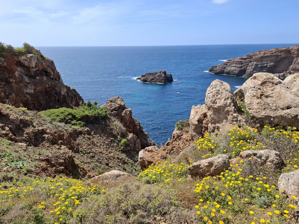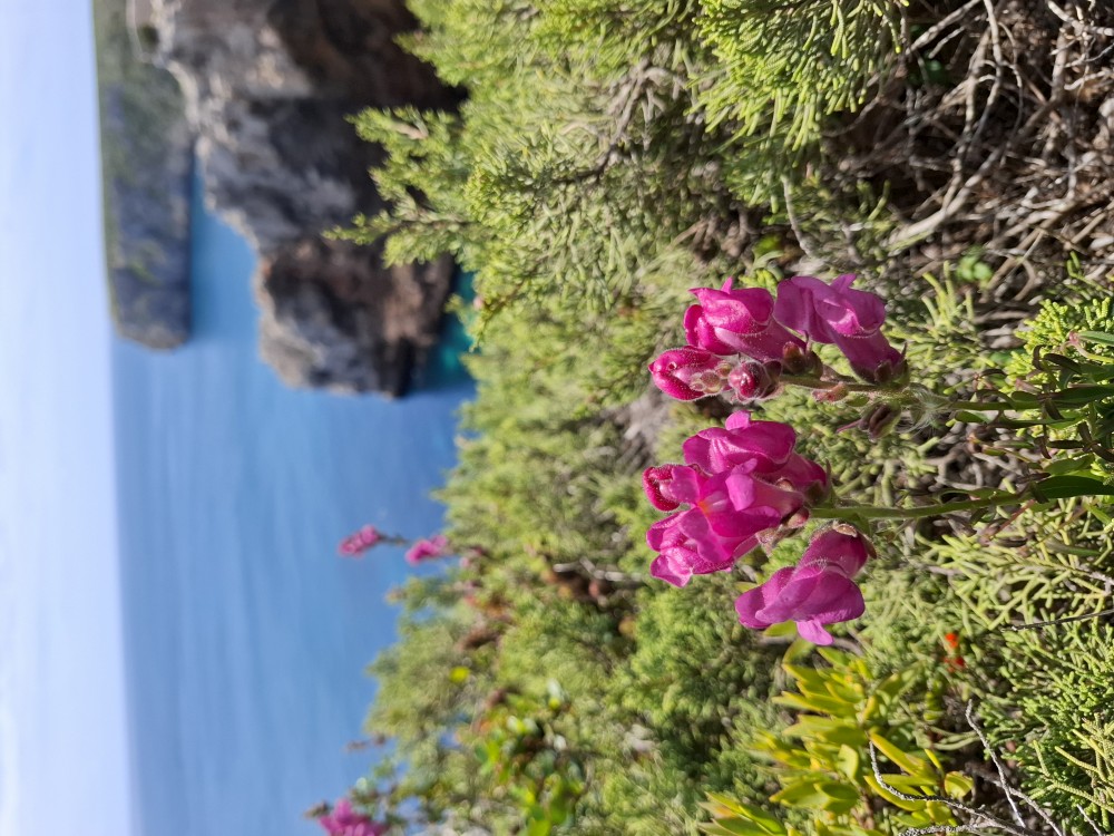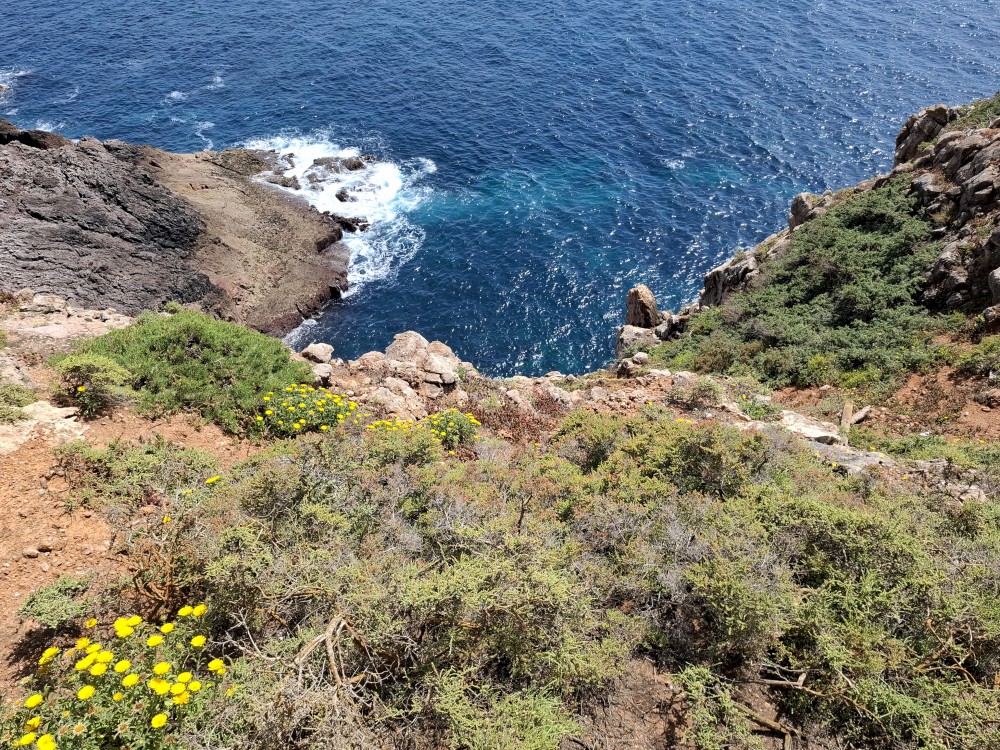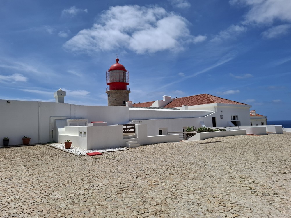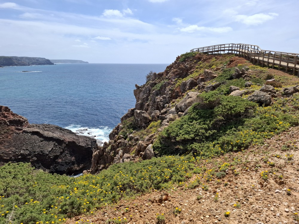 Jdeme tedy zpět k autu a pokračujeme na západ na Mys Cabo de Sao Vicente. Zastavujeme asi dva kilometry před samotným mysem a kocháme se na výhledy na skalnaté útesy, které se tyčí nad oceánem a místní bohatou flórou. Pak už přejíždíme k samotnému mysu. Je tu hodně lidí a také stánky s občerstvením. Útesy jsou úchvatné. Trochu nás mrzí, že nemůžeme až na konec mysu. Cestě sem brání plotem obehnané budovy u majáku.