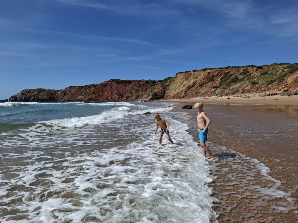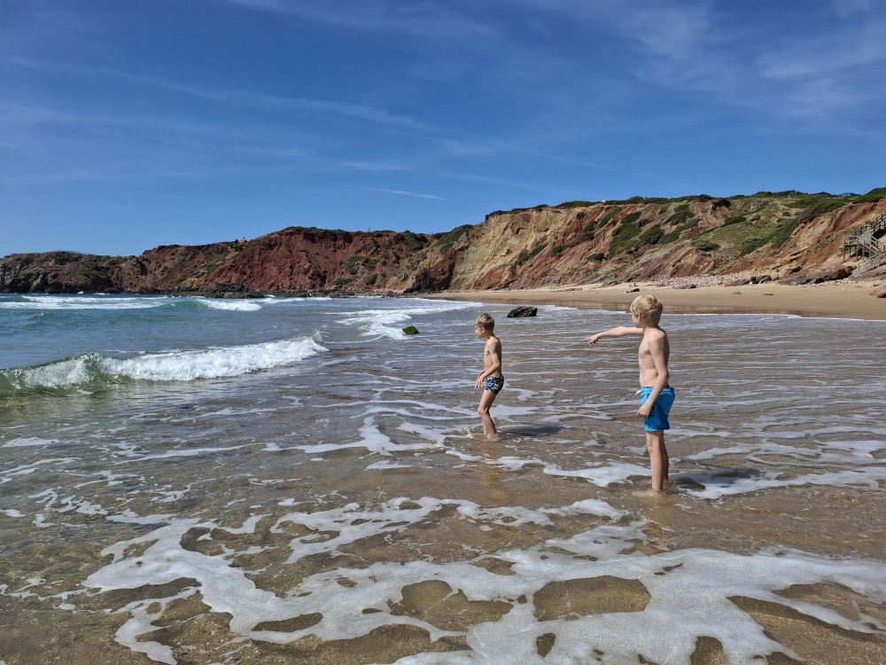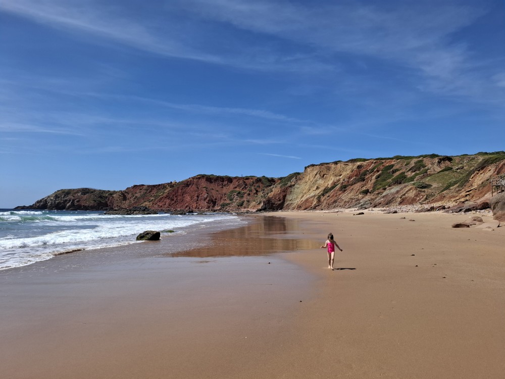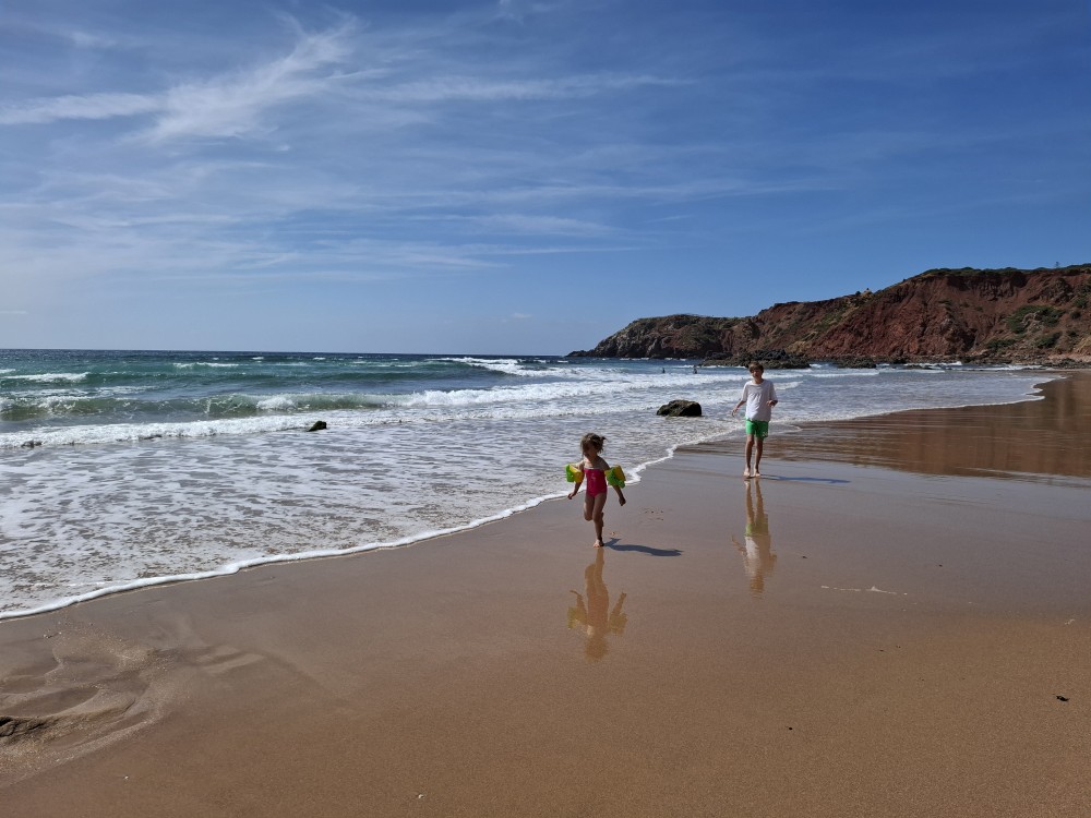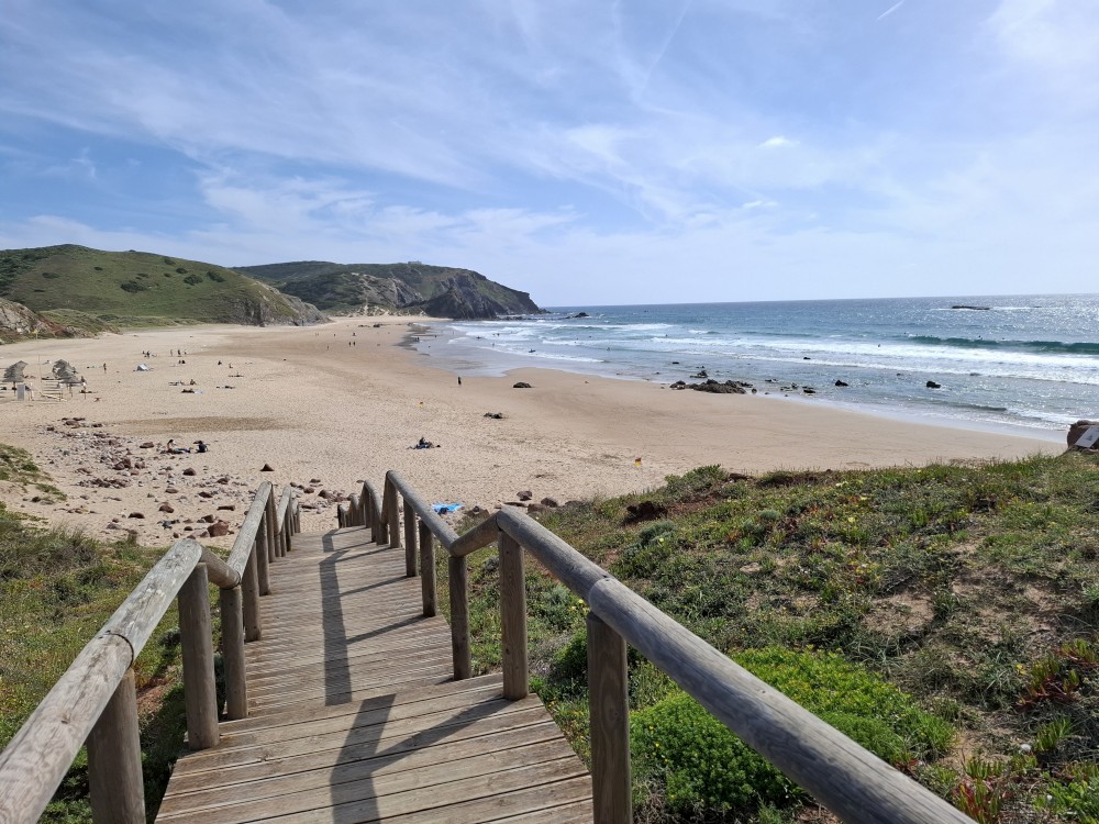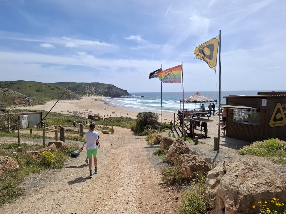 Jdeme si koupit nějaké jídlo do stánku, dáváme si Biffane - maso v housce a burgra s hranolkama. Děti jí u stolků před stánkem, my jdeme s Janou jíst na na útesy s výhedem na oceán. Pak sedáme do auta a jedeme na sever, do obce Carrapateira a odtud na jihozápad na krásný výhled na oceán Ponta de Castelo. Vidíme odtud surfaře na úchvatné pláži Praia do Amado. Vyrážíme tam.