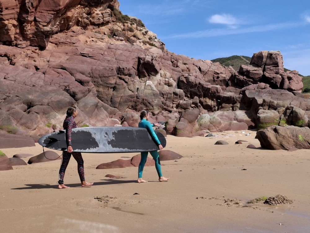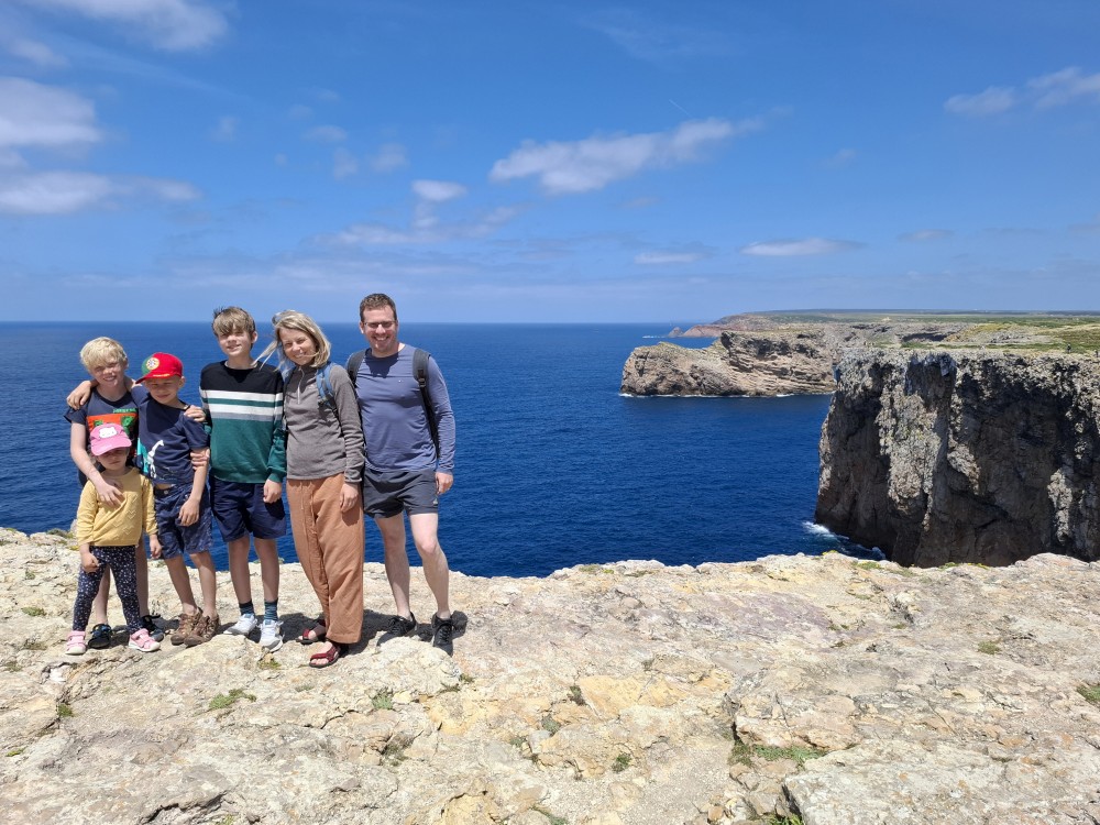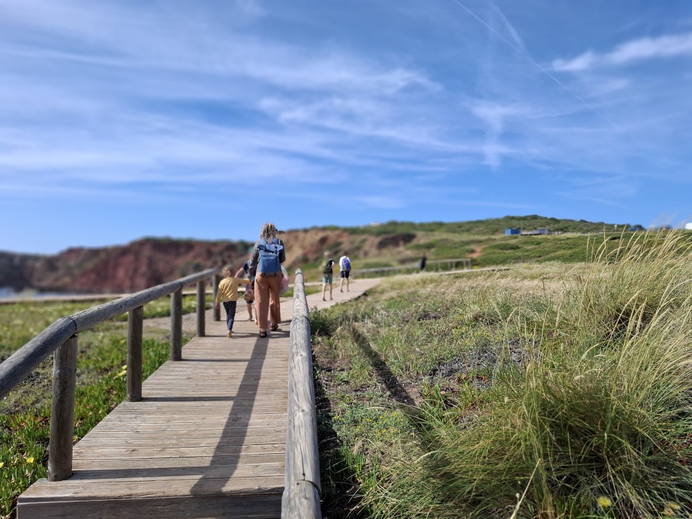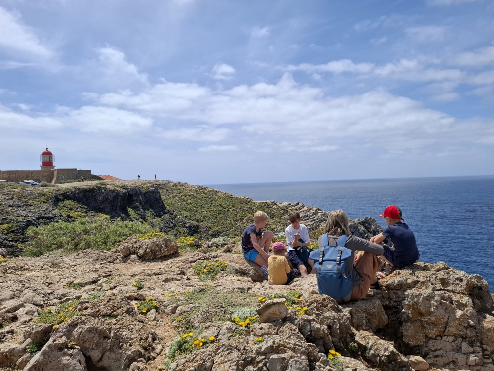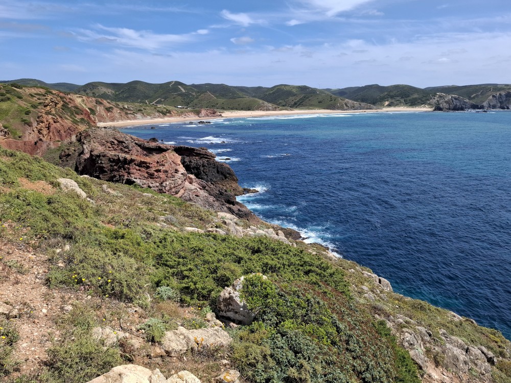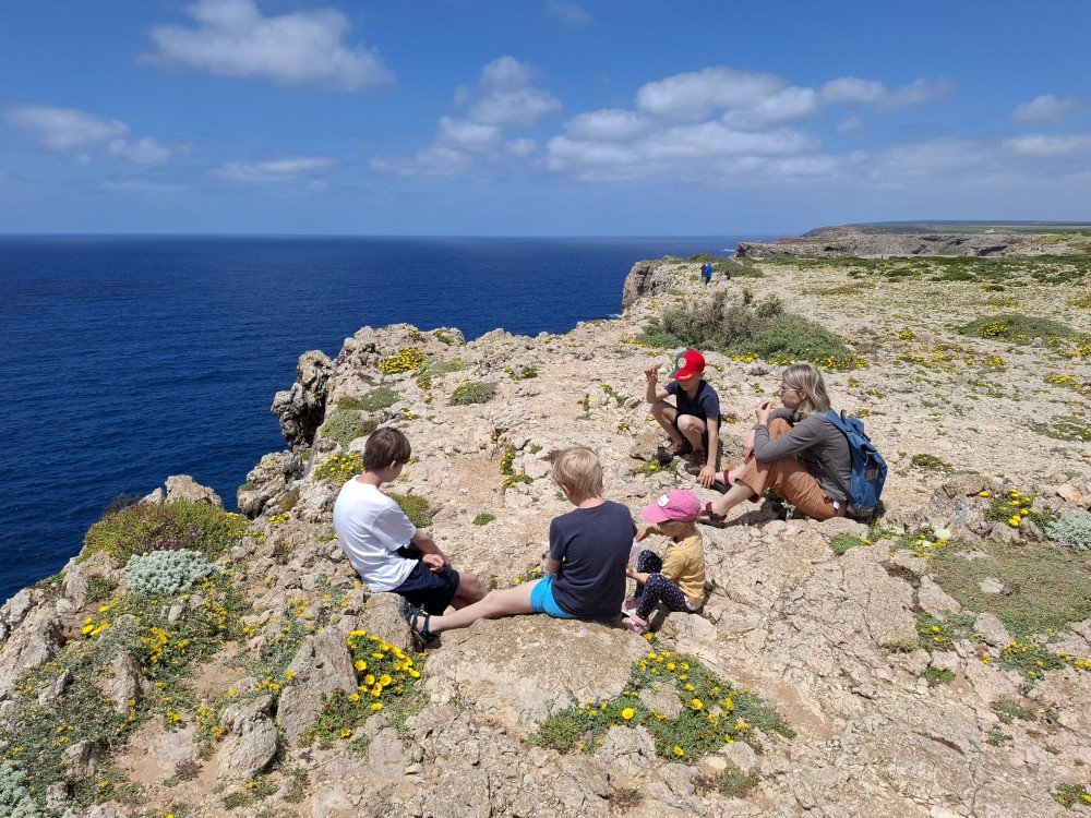 Jdeme si koupit nějaké jídlo do stánku, dáváme si Biffane - maso v housce a burgra s hranolkama. Děti jí u stolků před stánkem, my jdeme s Janou jíst na na útesy s výhedem na oceán. Pak sedáme do auta a jedeme na sever, do obce Carrapateira a odtud na jihozápad na krásný výhled na oceán Ponta de Castelo. Vidíme odtud surfaře na úchvatné pláži Praia do Amado. Vyrážíme tam.