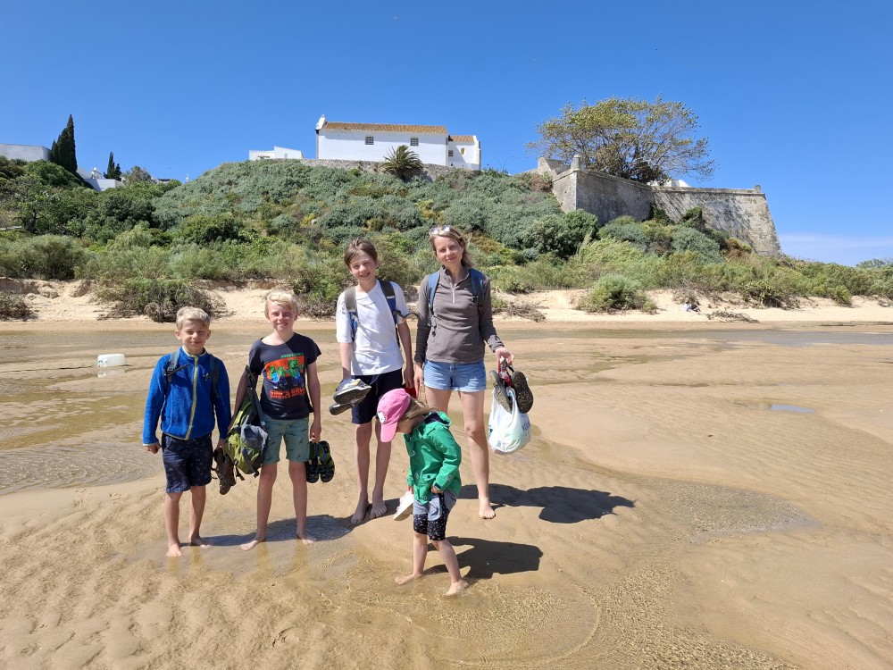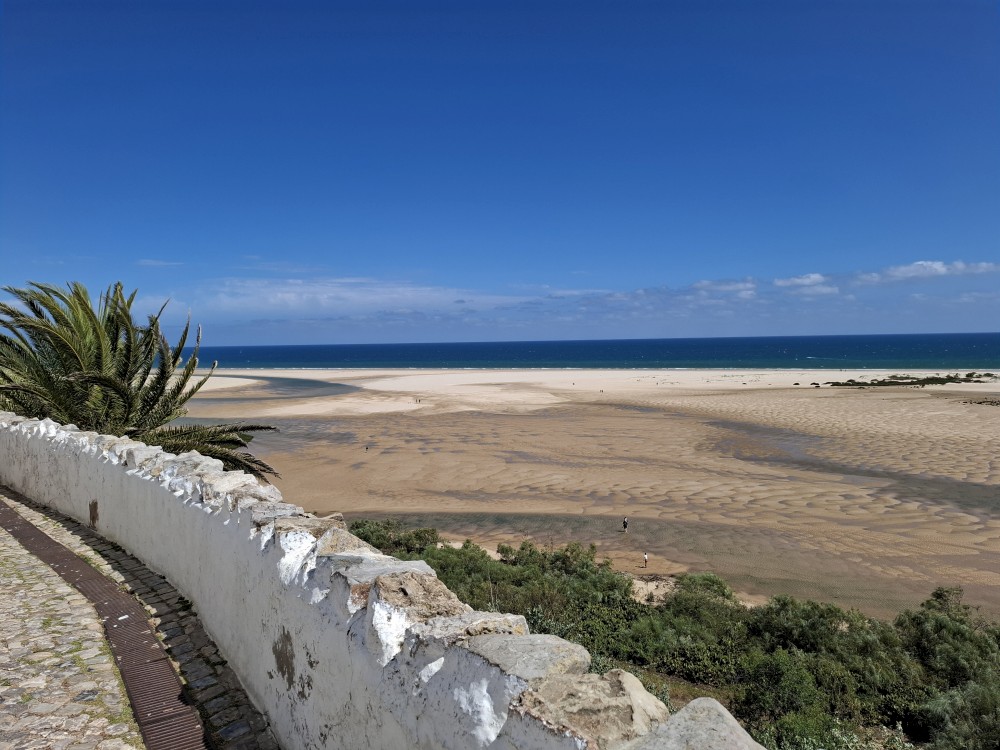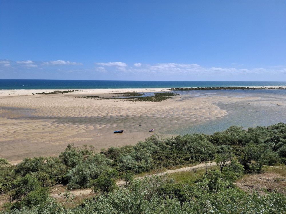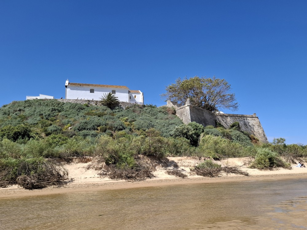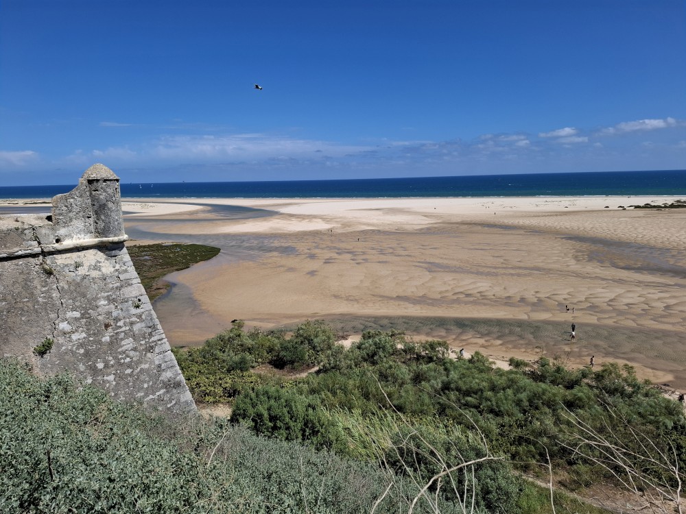 Po krátkém posezení jdeme k řece a na starý most. Děti jdou pak do obchdu se suvenýry, já jdu místo toho na rychlou procházku městem a zmrzlinu. Znovu se setkáváme, jdeme k autu a přejíždíme do Cacela Velha. Z tohoto místa jsme nadšeni. Z místní pevnosti jsou krásné výhledy na mokřady Ria Formosa a přilehlý oceán. Je zde písečná laguna s mělkými vodními jezírky.