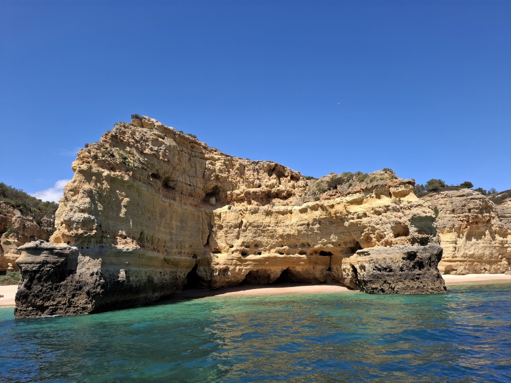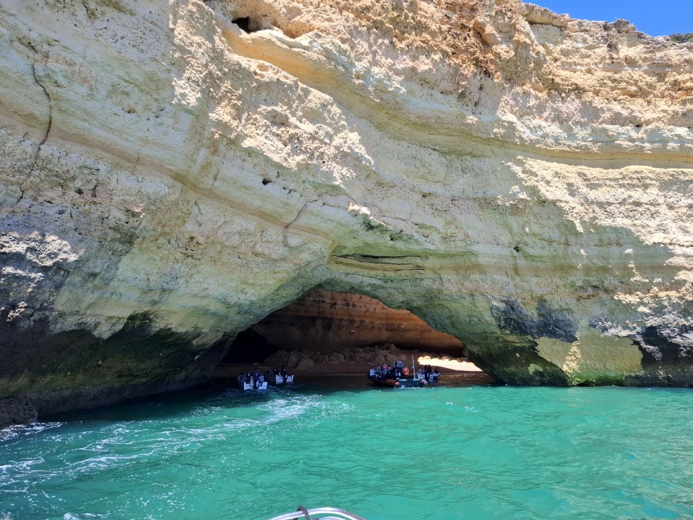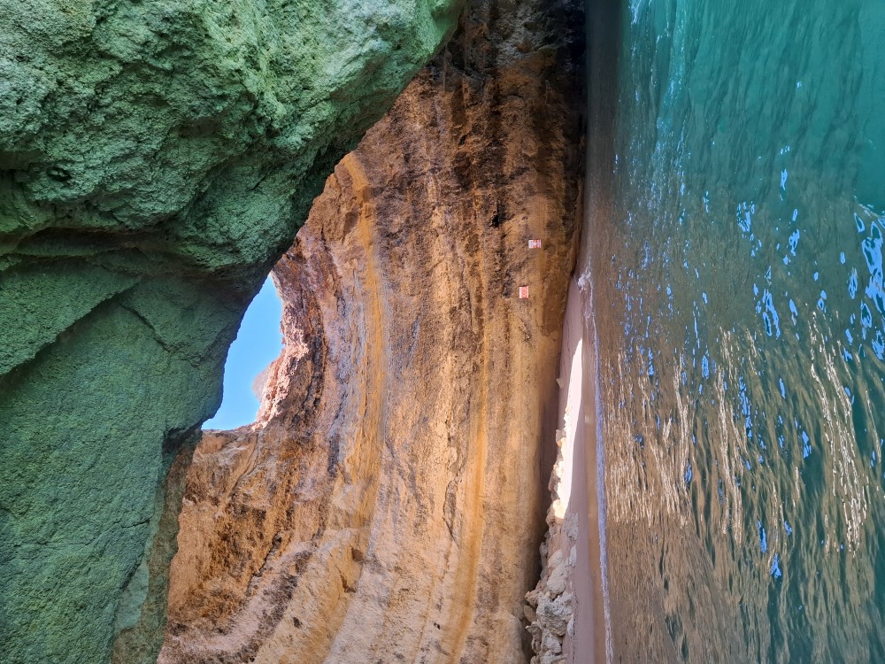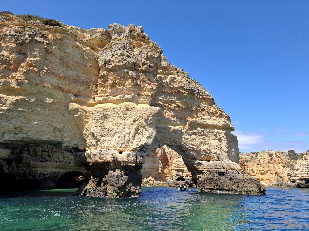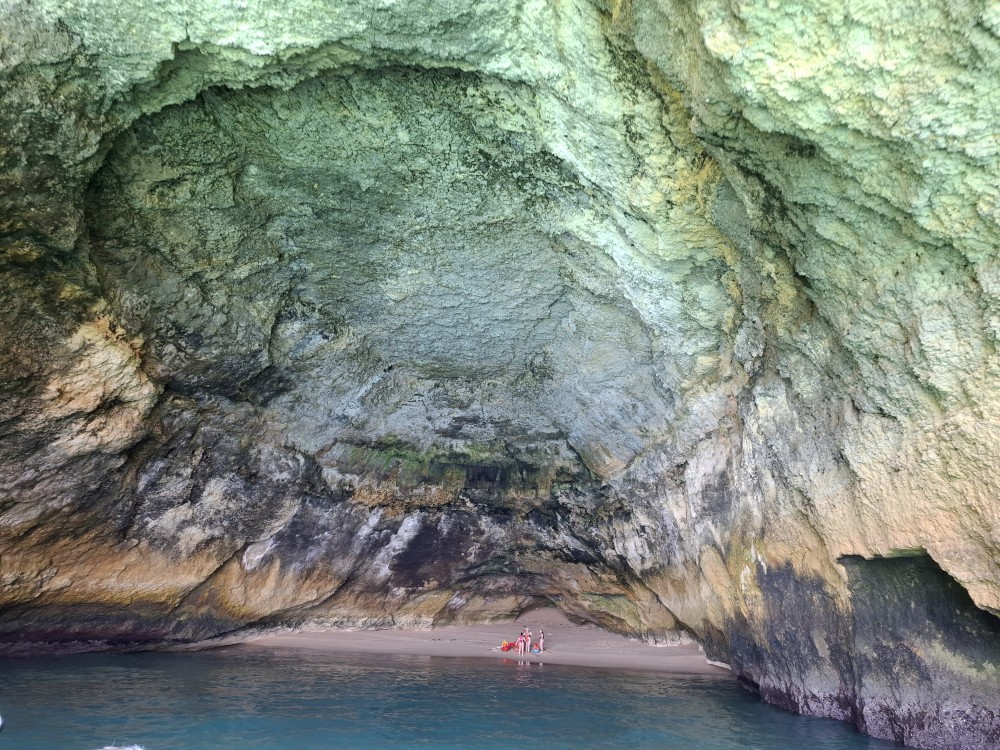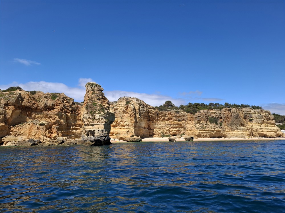 Vyrážíme ve 14:30 a je to velký zážitek. Dostáváme se asi do pěti jeskyní, jeskyně Benagil, jeskyně Krokodýl, jeskyně Paradise, jeskyně Želva atd. Plujeme až k pláži Marinha, prý nejkrásnější pláži v Portugalsku a v TOP 10 evropských pláží dle Nacional Geographic.