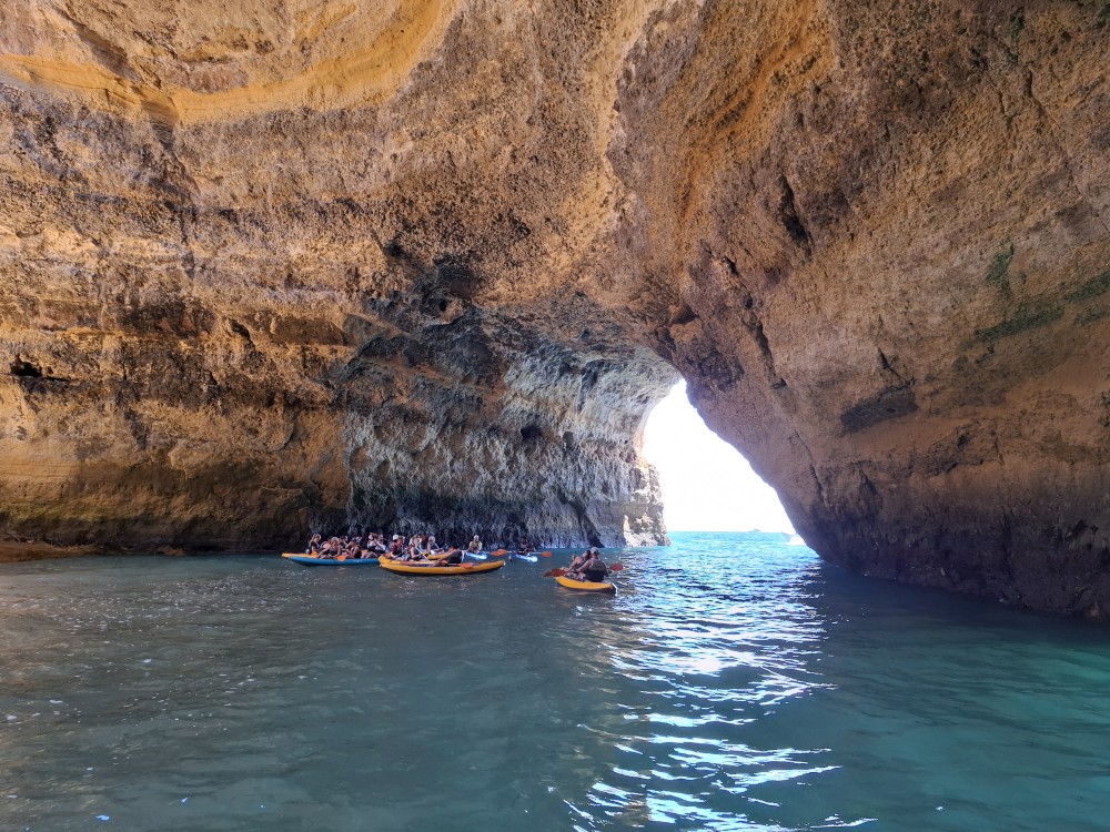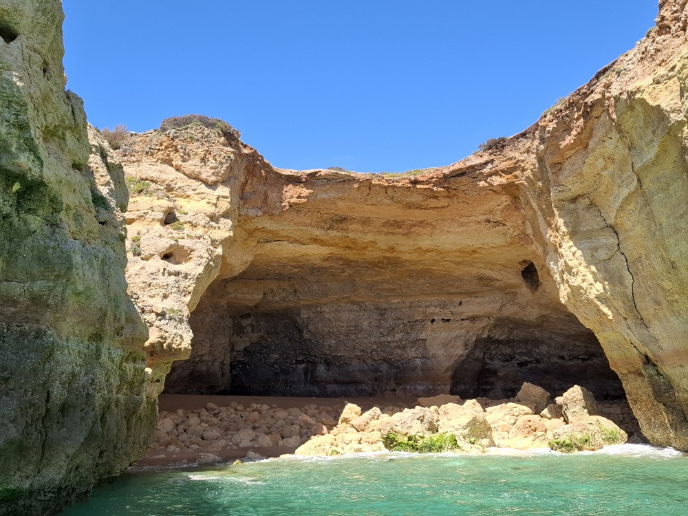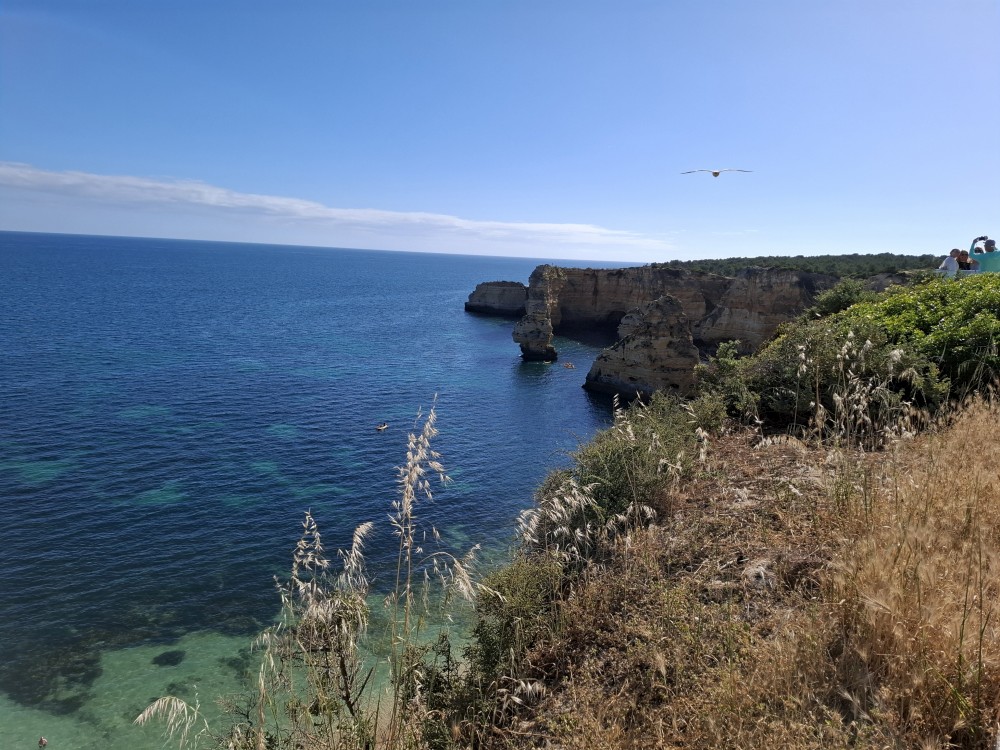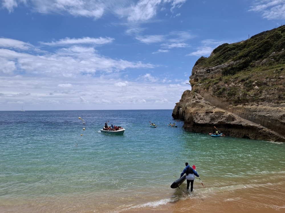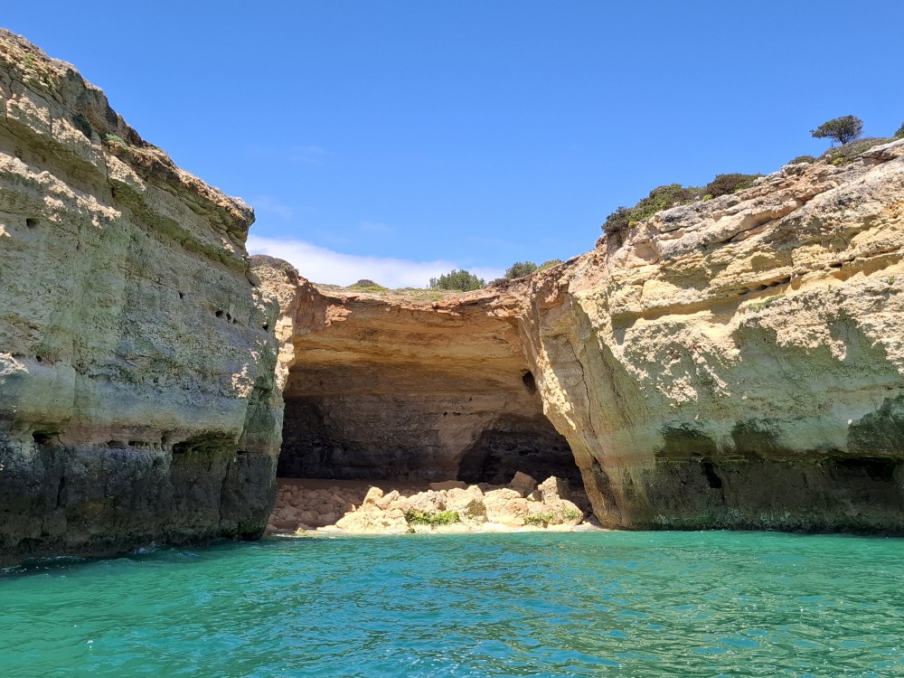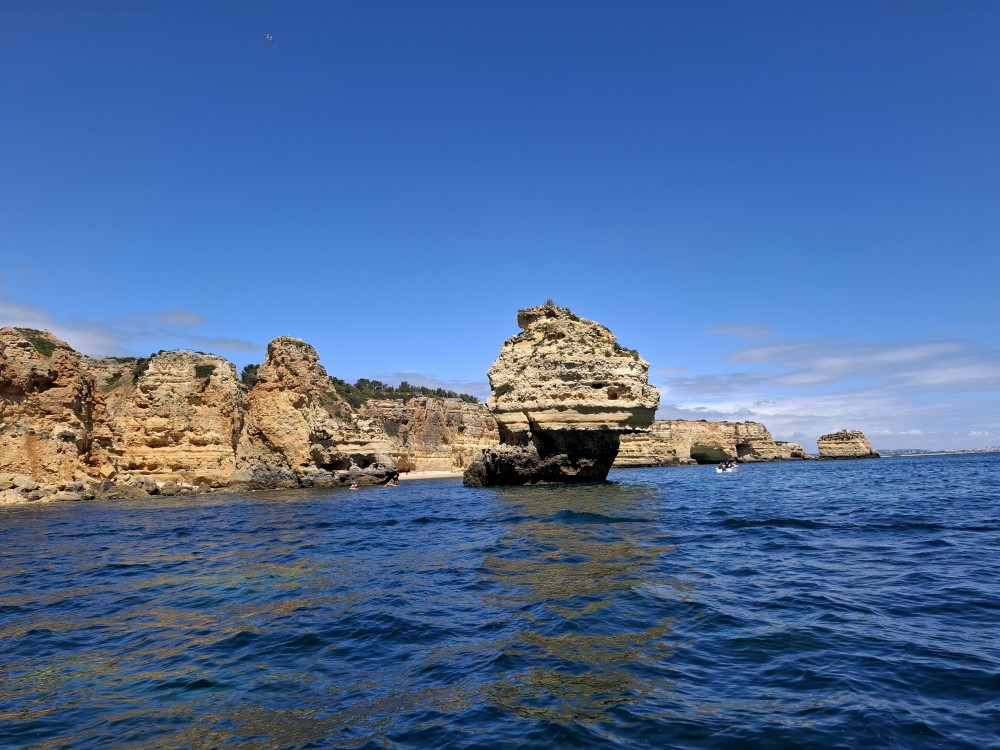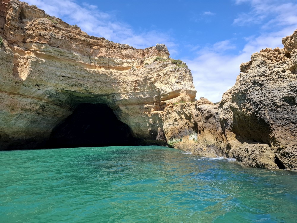 Vyrážíme ve 14:30 a je to velký zážitek. Dostáváme se asi do pěti jeskyní, jeskyně Benagil, jeskyně Krokodýl, jeskyně Paradise, jeskyně Želva atd. Plujeme až k pláži Marinha, prý nejkrásnější pláži v Portugalsku a v TOP 10 evropských pláží dle Nacional Geographic.