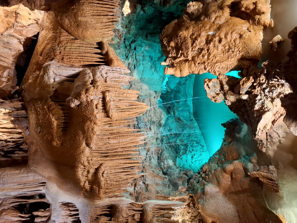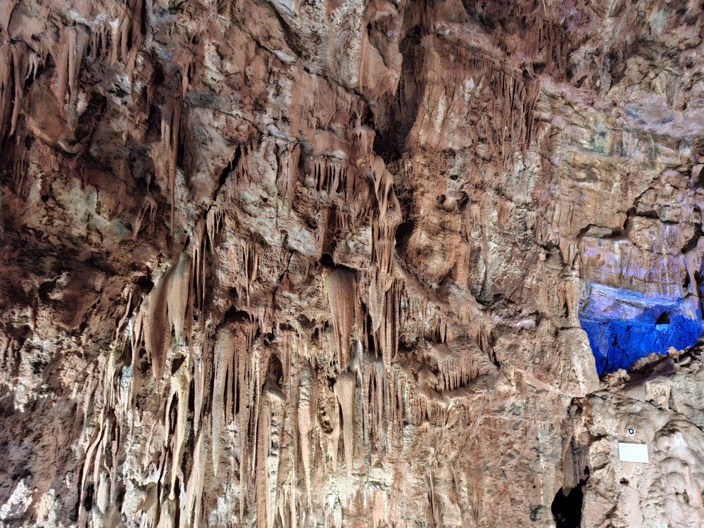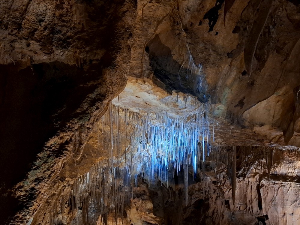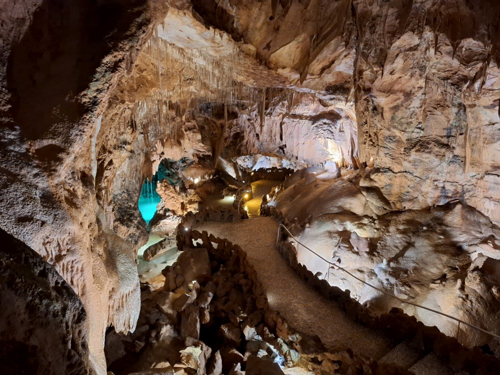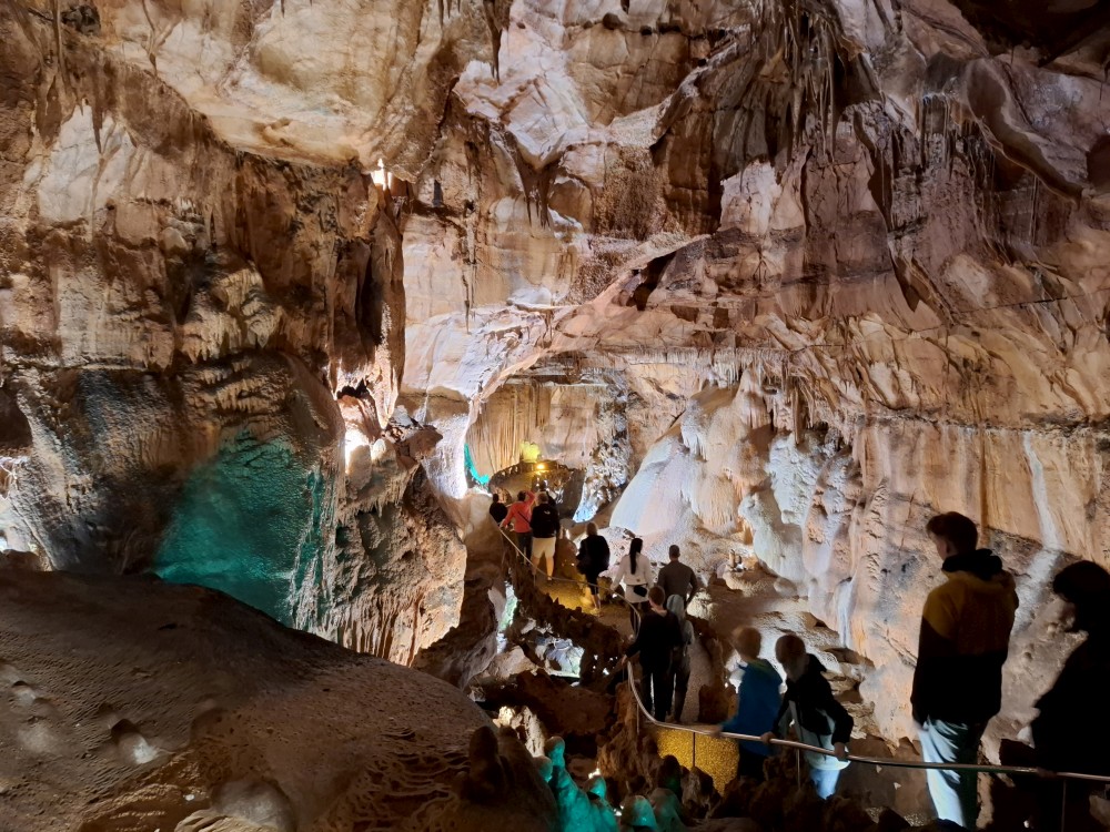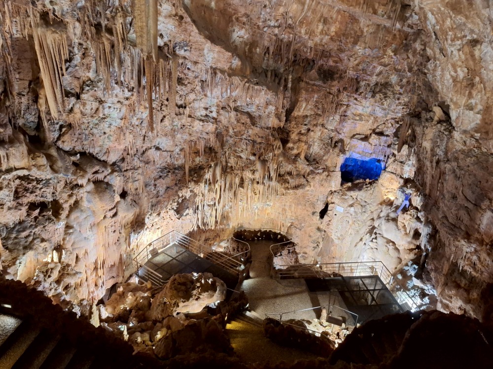 Průvodce nám ukazuje úzký vstup, pomocí kterého byla jeskyně nalezena. Pak už vcházíme do velkého podzemního dómu. Klesáme jím postupně dolů až k podzemní říčce, která jeskyní teče. Asi po hodině se dostáváme k východu z jeskyně. Trasa měla asi 600 m a 700 schodů. Na povrch se dostáváme výtahem. Bodrý průvodce rozděluje skupinku na 2 části, rozděluje zrovna i naší rodinku a natlačí se s první skupinkou do výtahu. Moc se s tím nemaže, mačkáme se jako sardinky a zadržujeme dech, abychom necítili blízký dech bodrého průvodce.