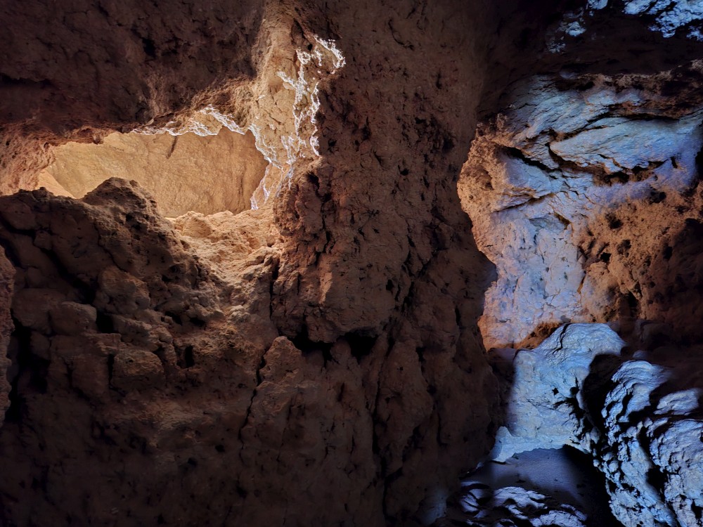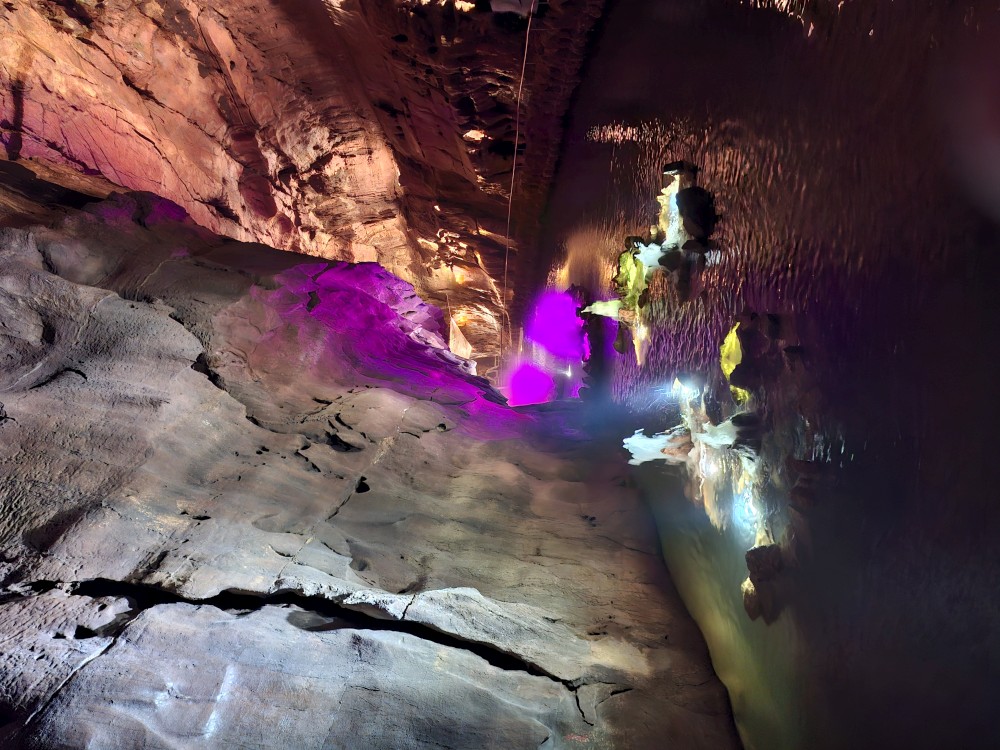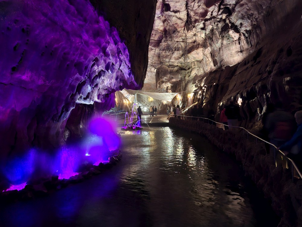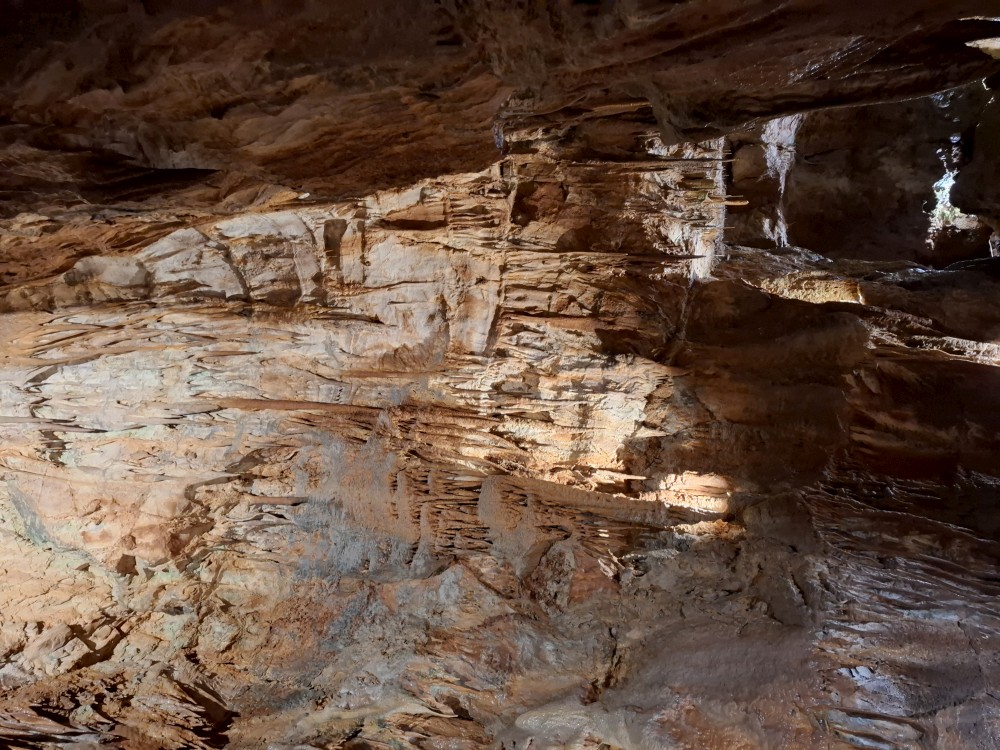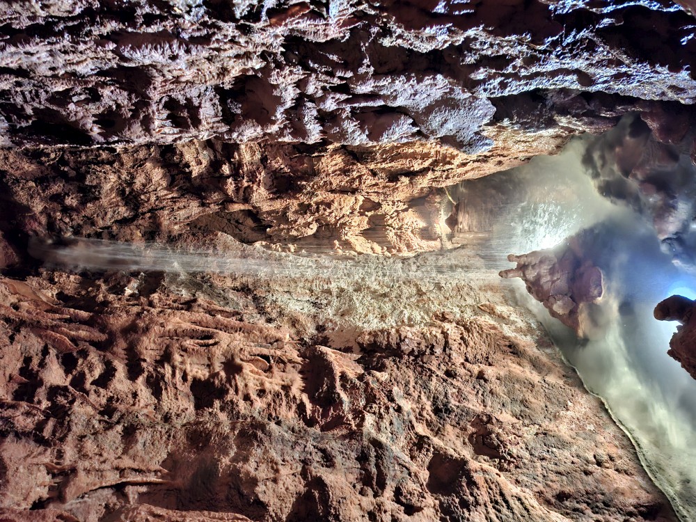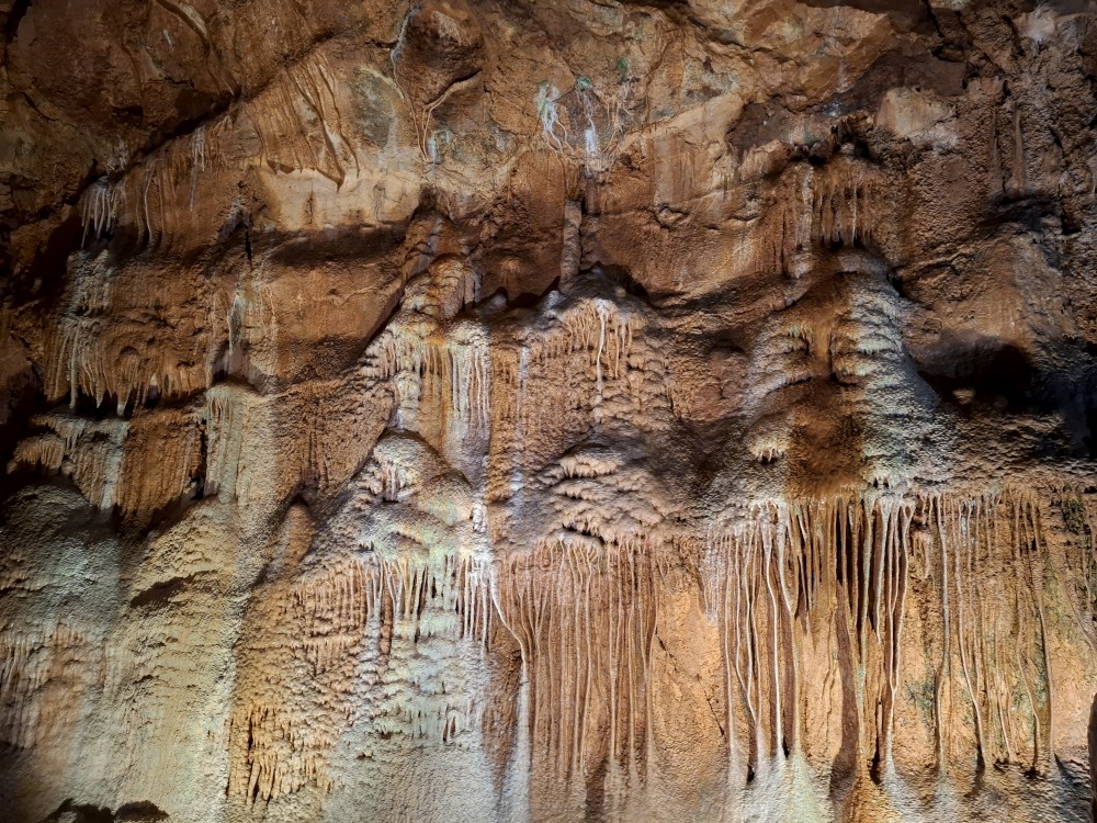 Průvodce nám ukazuje úzký vstup, pomocí kterého byla jeskyně nalezena. Pak už vcházíme do velkého podzemního dómu. Klesáme jím postupně dolů až k podzemní říčce, která jeskyní teče. Asi po hodině se dostáváme k východu z jeskyně. Trasa měla asi 600 m a 700 schodů. Na povrch se dostáváme výtahem. Bodrý průvodce rozděluje skupinku na 2 části, rozděluje zrovna i naší rodinku a natlačí se s první skupinkou do výtahu. Moc se s tím nemaže, mačkáme se jako sardinky a zadržujeme dech, abychom necítili blízký dech bodrého průvodce.