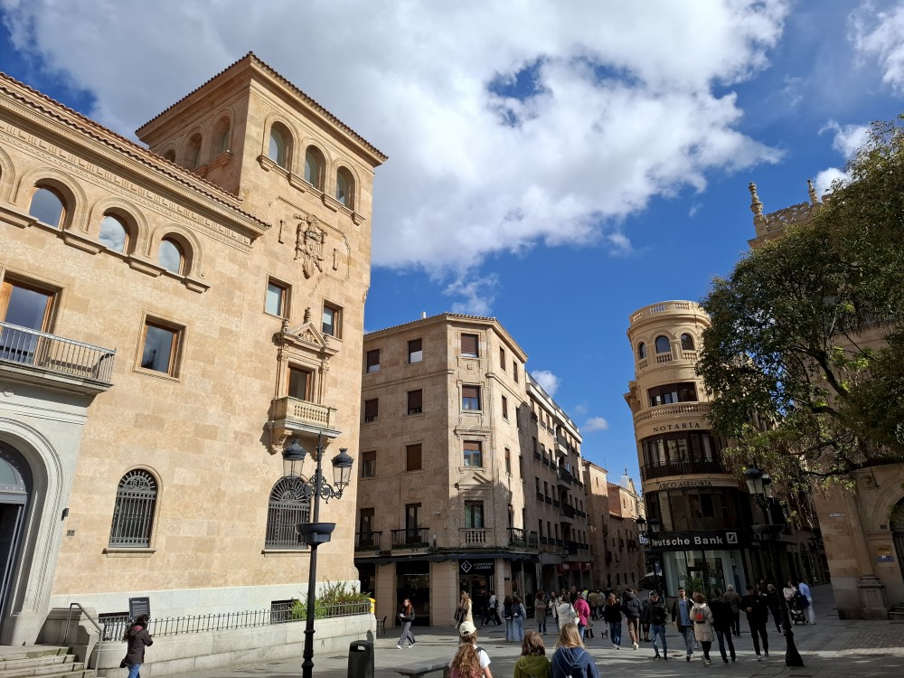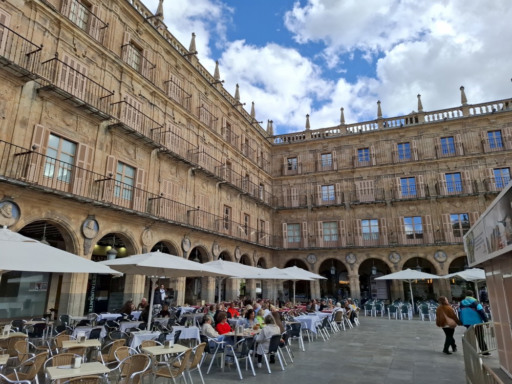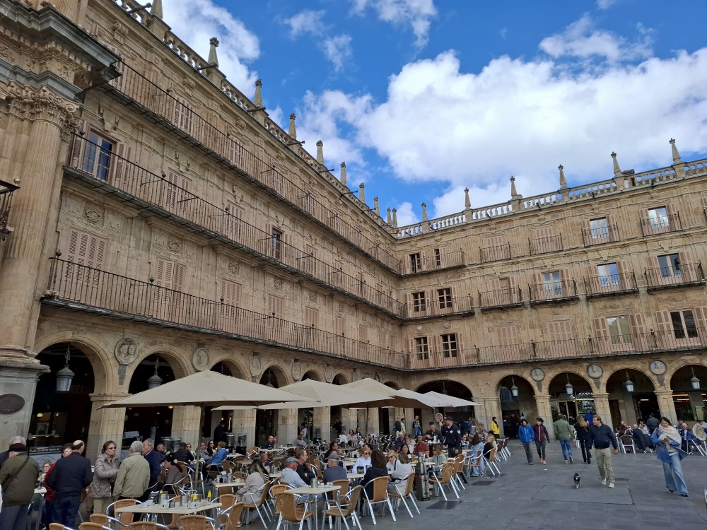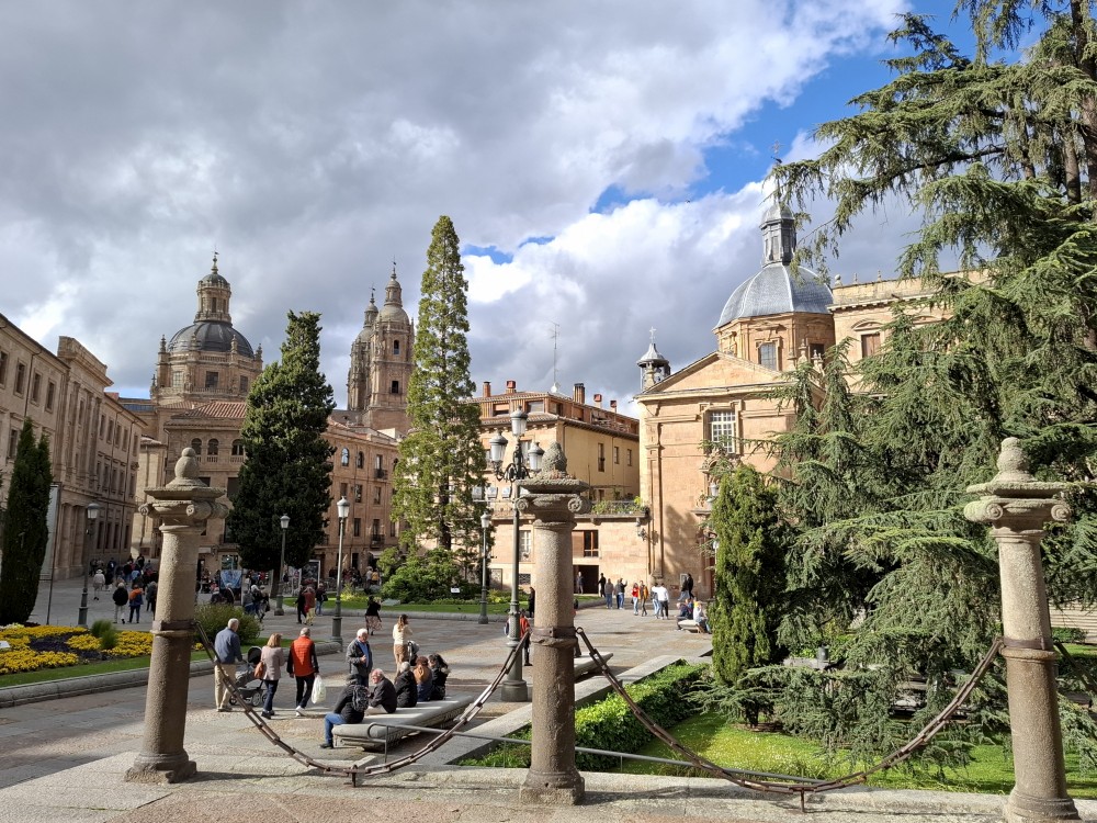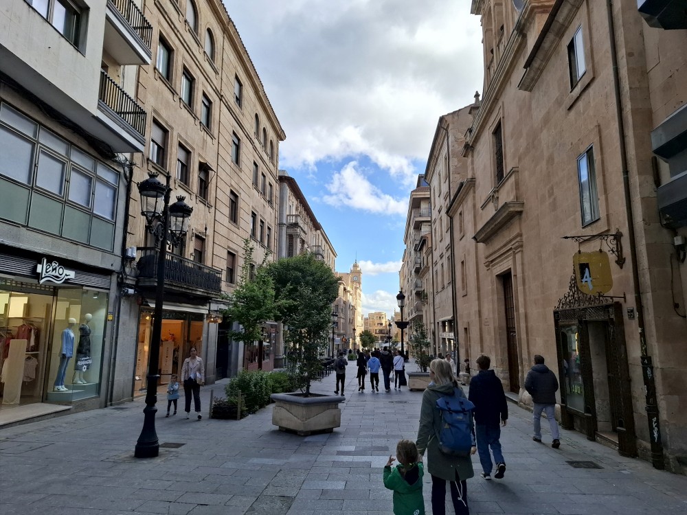 Na apartmánu se moc dlouho nezdržujeme, vyrážíme na průzkum Salamancy. Je zataženo, občas deštivo, ale začíná se to protrhávat a vidíme i slunce, takže ideální. Jdeme nejdříve ke kostelu Iglesia de San Marcos a odtud pokračujeme po pěší třídě Calle de Zamora přes Plaza los Bandos na hlavní náměstí Plaza Mayor.