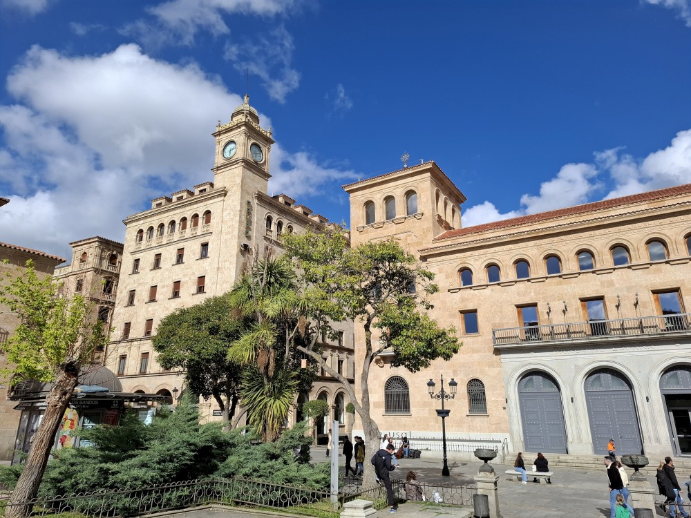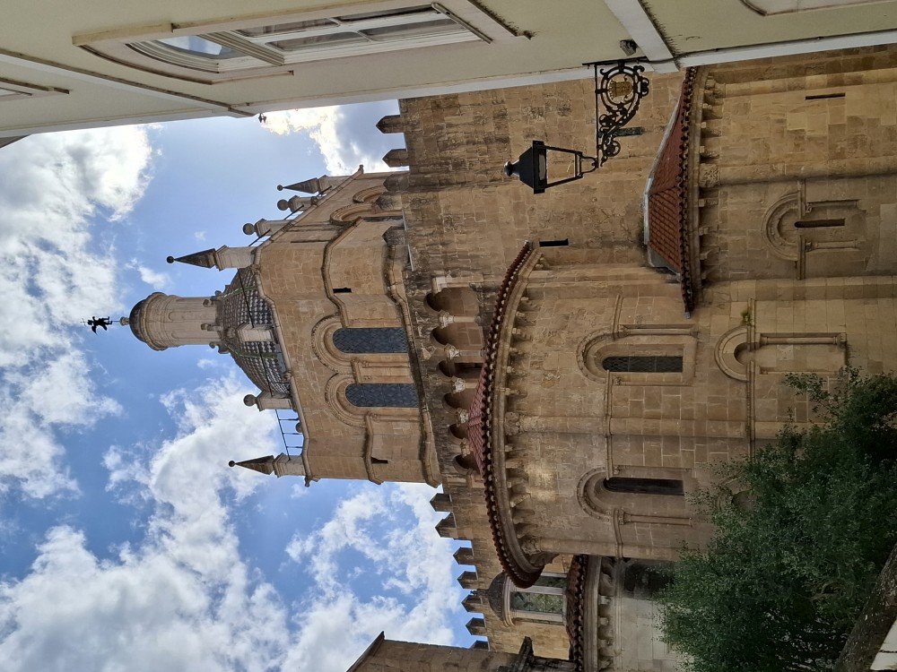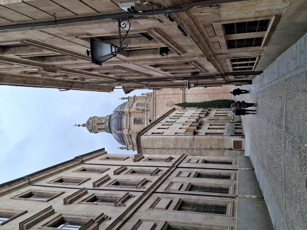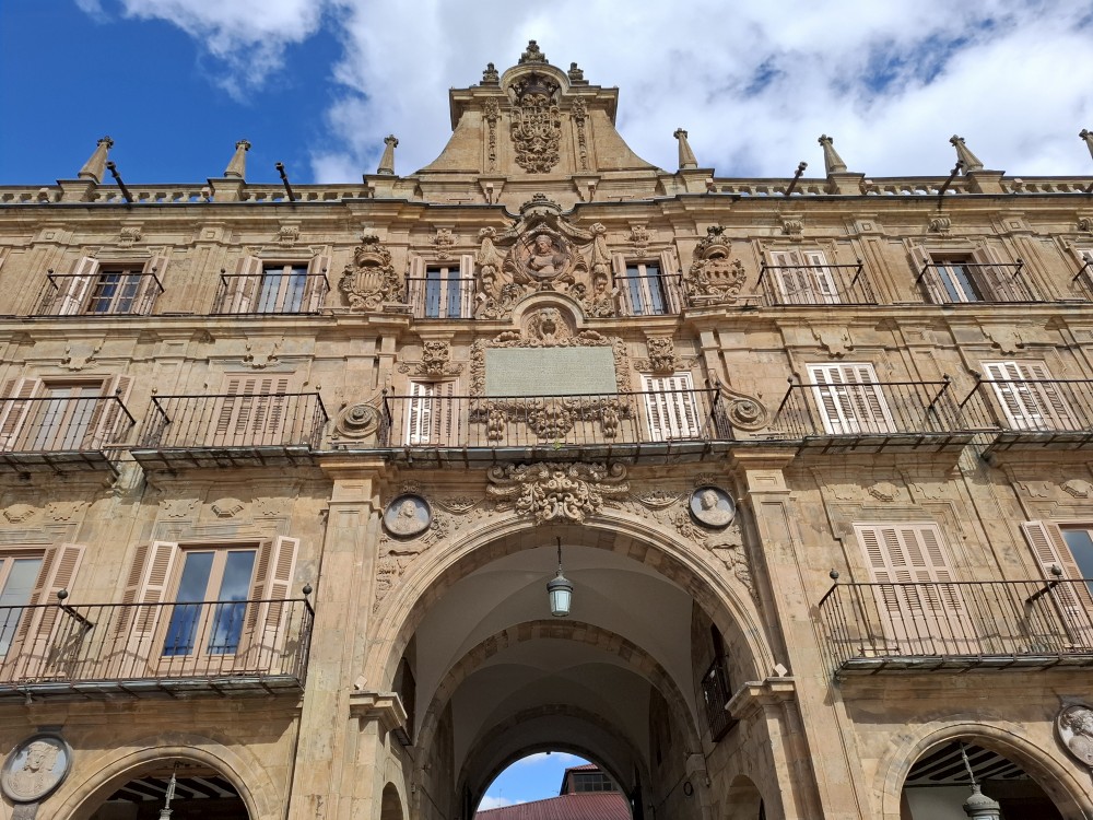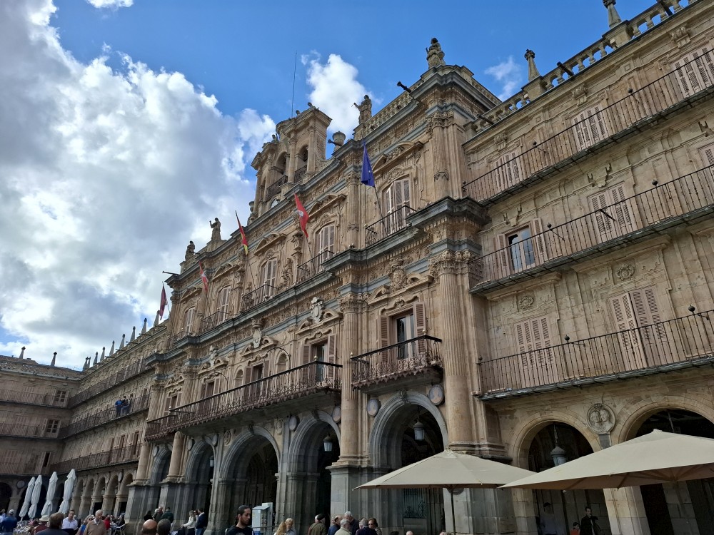 Na apartmánu se moc dlouho nezdržujeme, vyrážíme na průzkum Salamancy. Je zataženo, občas deštivo, ale začíná se to protrhávat a vidíme i slunce, takže ideální. Jdeme nejdříve ke kostelu Iglesia de San Marcos a odtud pokračujeme po pěší třídě Calle de Zamora přes Plaza los Bandos na hlavní náměstí Plaza Mayor.