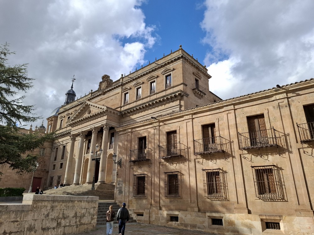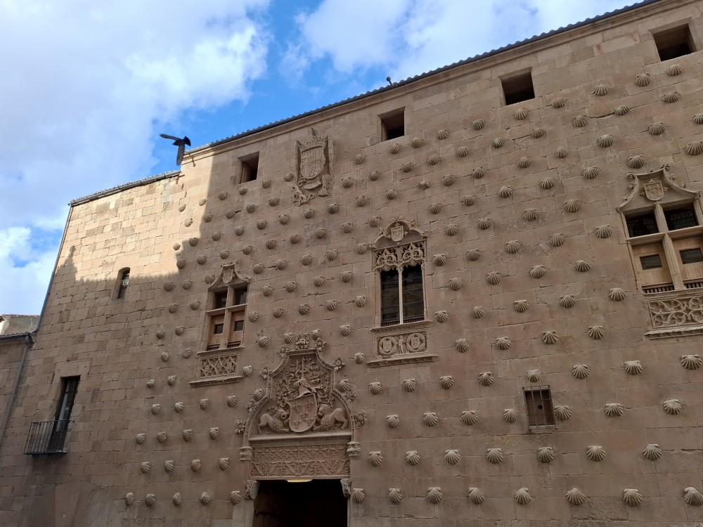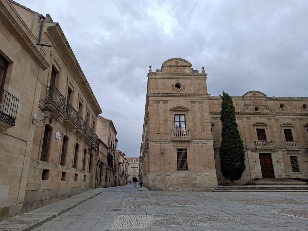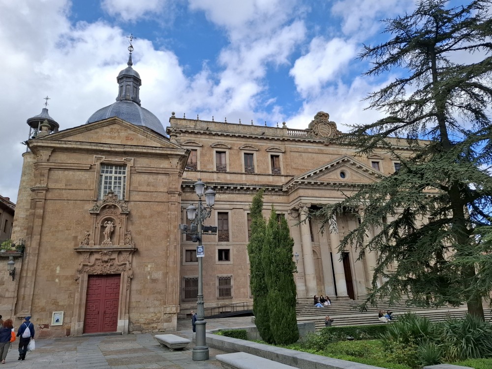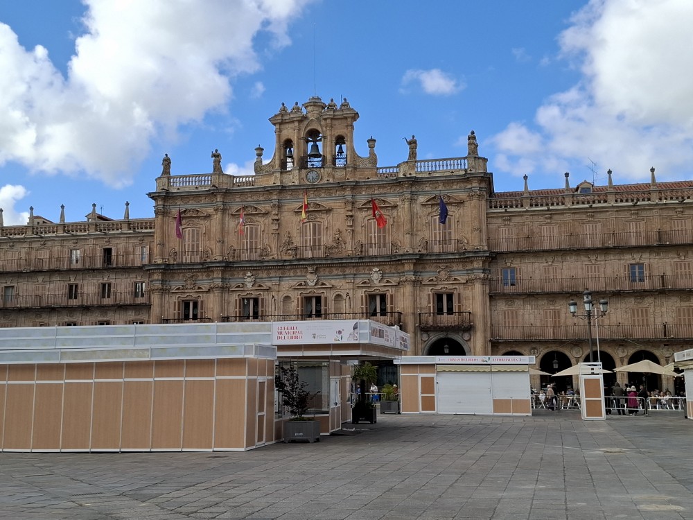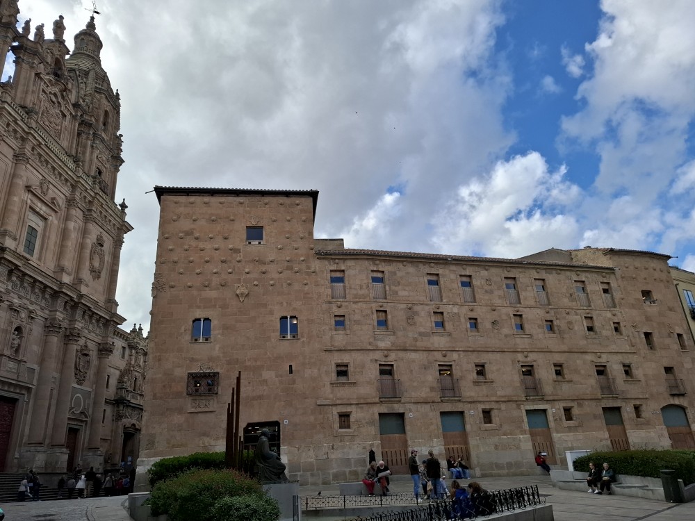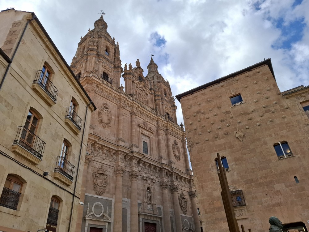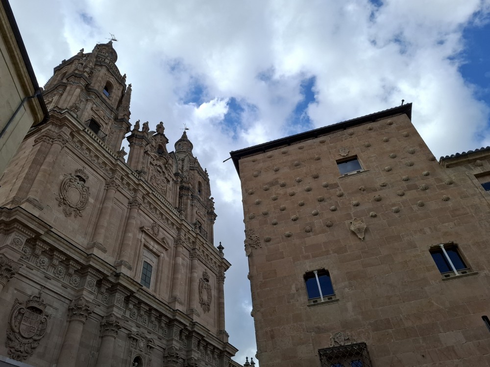 Na náměstí je nějaký knižní festival a střed náměstí je uzavřen, nemůžeme si tedy naplno vychutnat krásu tohoto náměstí obehnaného ochozy historických budov. Pokračujeme kolem kostela Iglesia de San Martín de Tours dále jižním směrem ke Casa de las Conchas (domu mušlí) a kostelu La Clerecía.