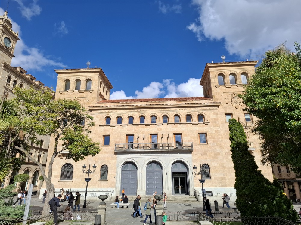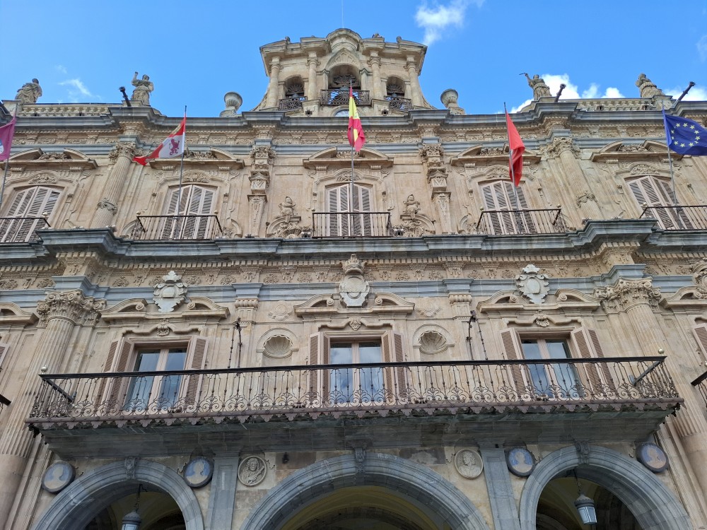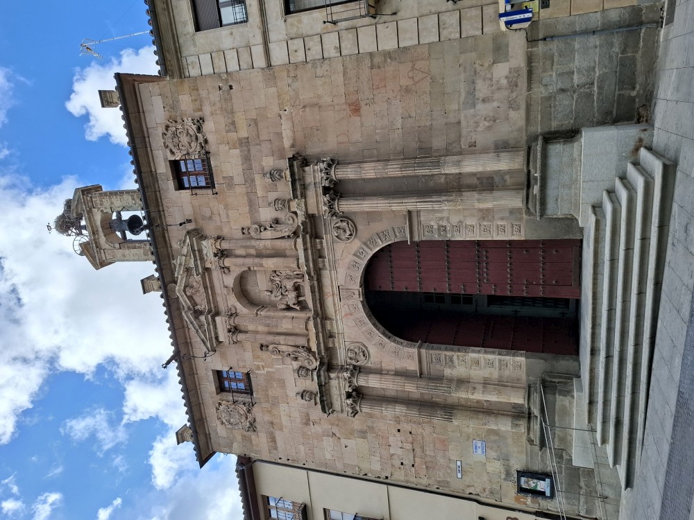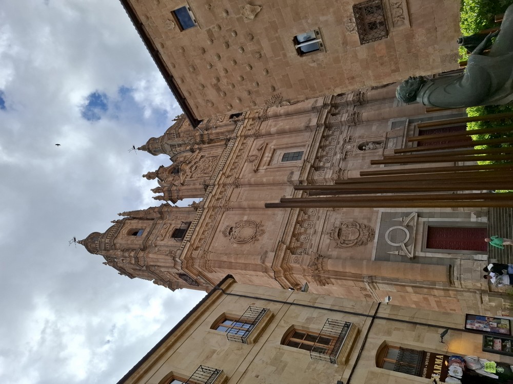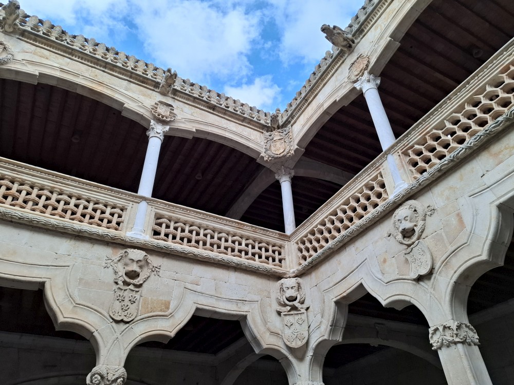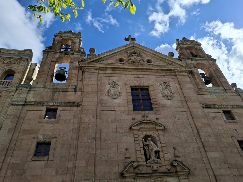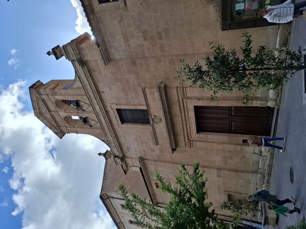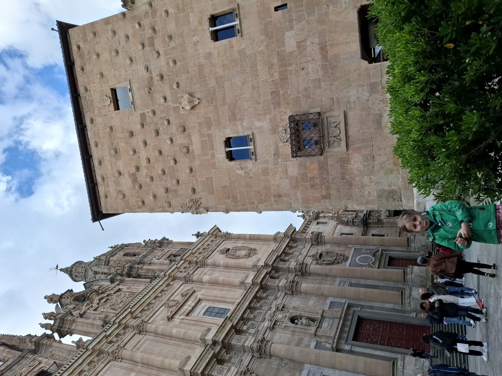 Na náměstí je nějaký knižní festival a střed náměstí je uzavřen, nemůžeme si tedy naplno vychutnat krásu tohoto náměstí obehnaného ochozy historických budov. Pokračujeme kolem kostela Iglesia de San Martín de Tours dále jižním směrem ke Casa de las Conchas (domu mušlí) a kostelu La Clerecía.