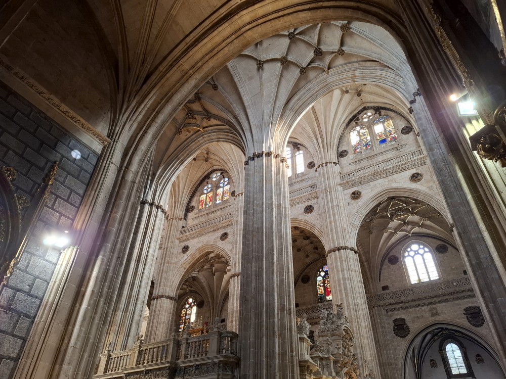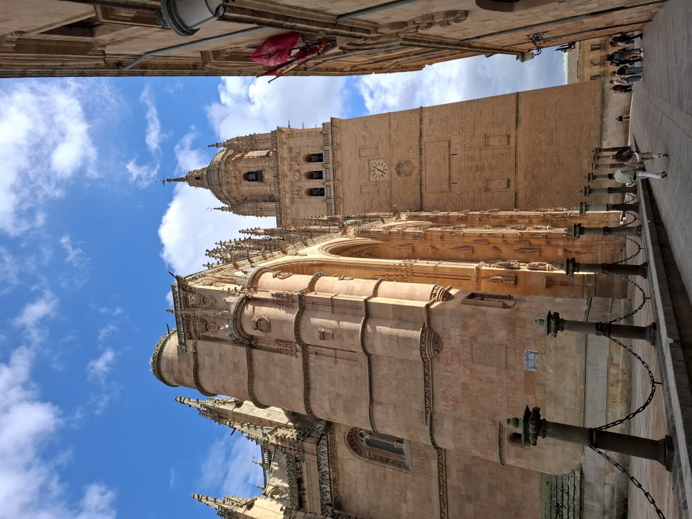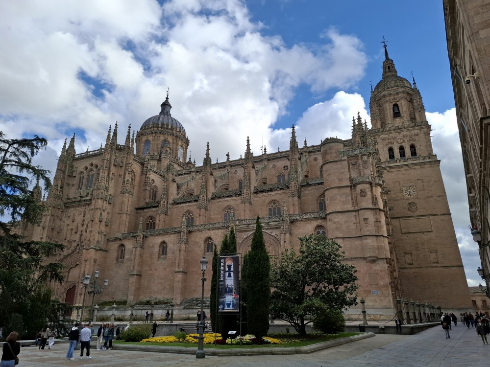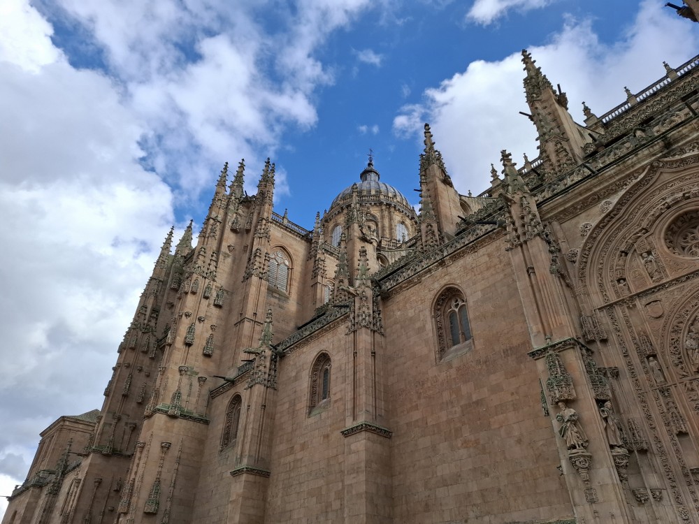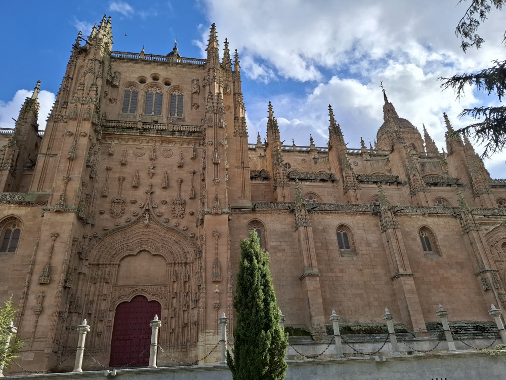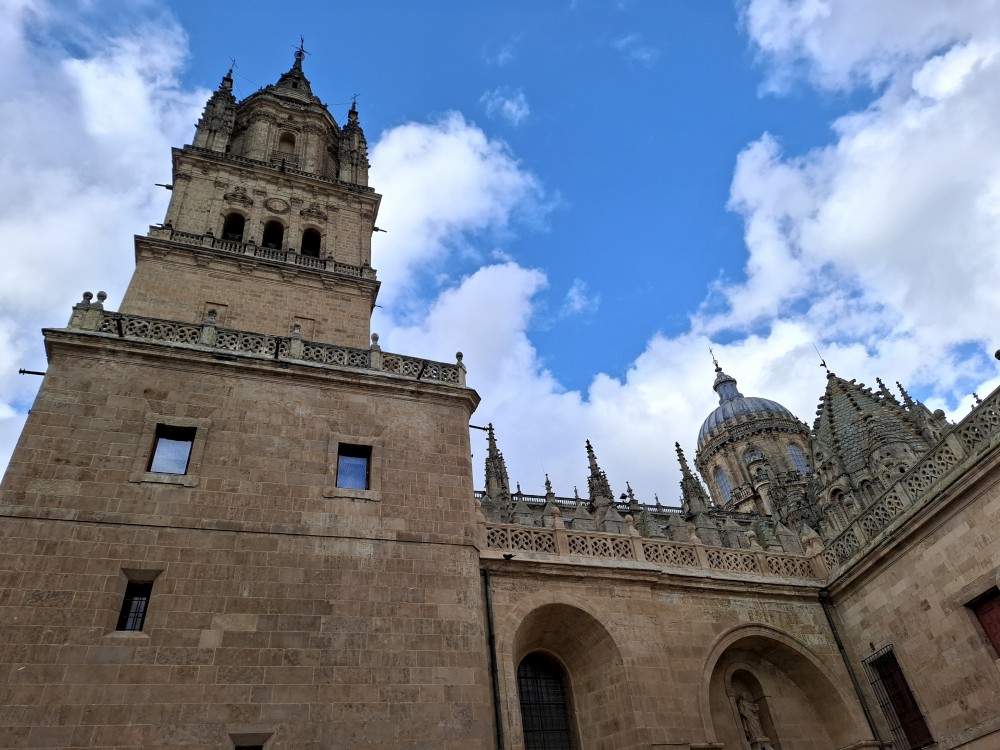 Odtud pokračujeme k impozantní katedrále Catedral Nueva de Salamanca (nová katedrála). U hlavního vstupu do katedrály nacházíme místní architektonický vtípek, kosmonauta vytesaného do kamenného portálu - vtípek restaurátorů portálu. Pokračujeme kolem staré katedrály Catedral Vieja na kamenný most Puente romano.