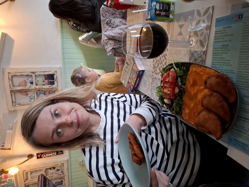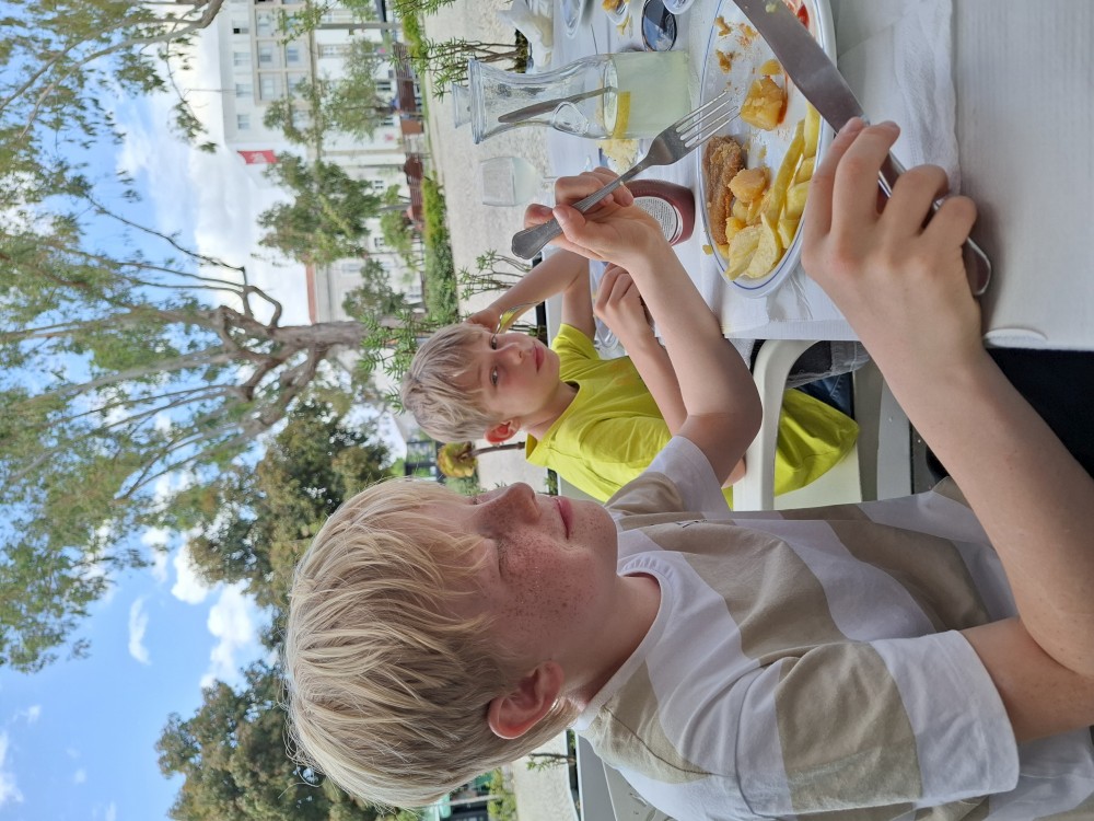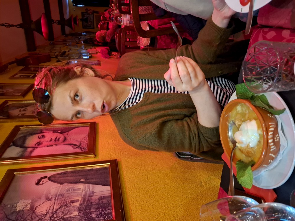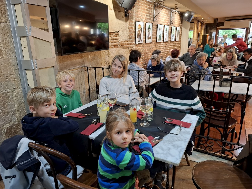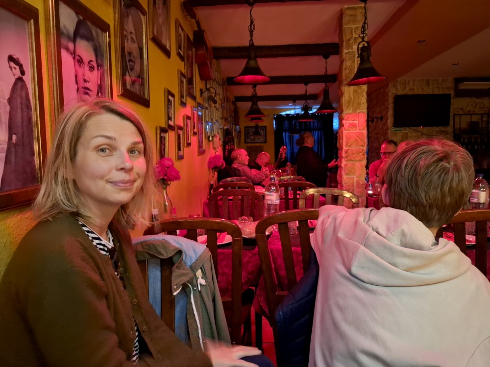 Do restaurace přichází muzikanti, 2 muži a žena, hrají na kytary a zpívají Fado. Bětuška tančí s babičkou naháněčkou, která si ji oblíbila a Bětuška zase ji. Opouštíme restauraci, babča se s námi všemi objímá, že jsme prý krásná rodinka. Taková místní teta Berků.