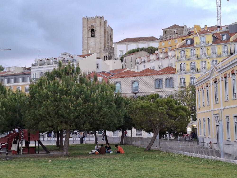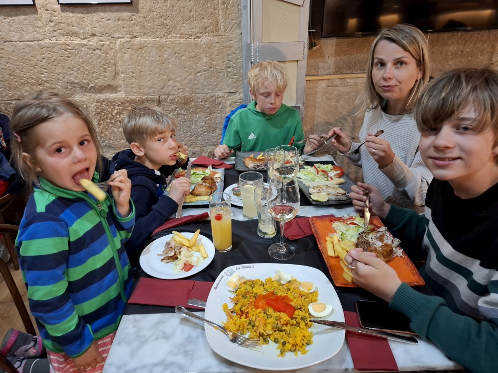 Vycházíme z hradu a prozkoumáváme čtvrť Afama. Zastavujeme na dětském hřišti. Bětuška i kluci dovádějí na prolejzačkách. Pak se dostáváme na náměstí s výhledy a kostely. Děti už mají hlad, hledáme restauraci. Do jedné restaurace nás nalákala "babička naháněčka". Dobře se tu najíme. Víťa má špagety s krevetama, kluci a Bětuška hamburgery, já zeleninovou polévku a Jana nějakou polévku s mořskými plody.
