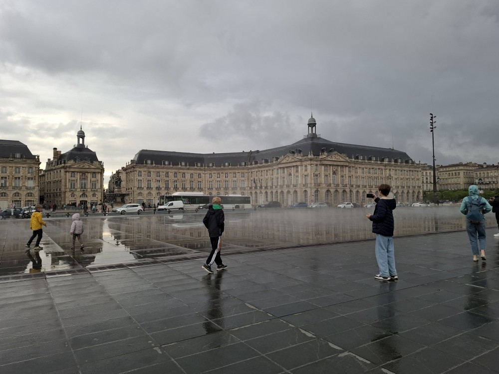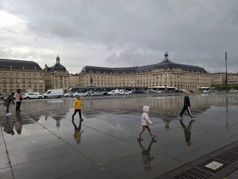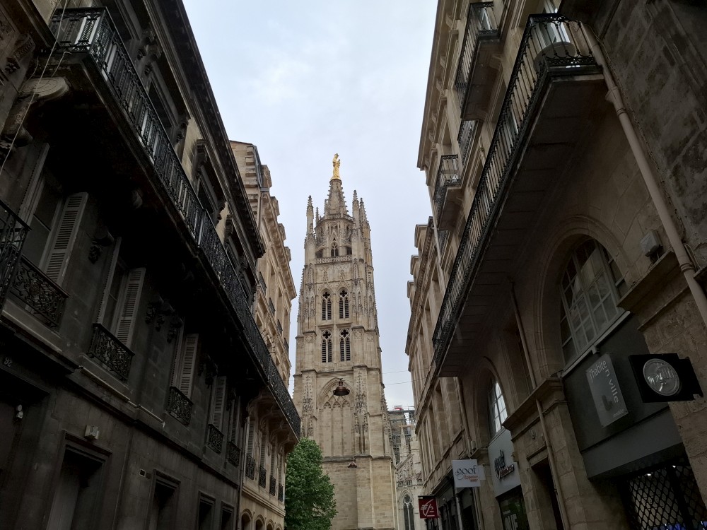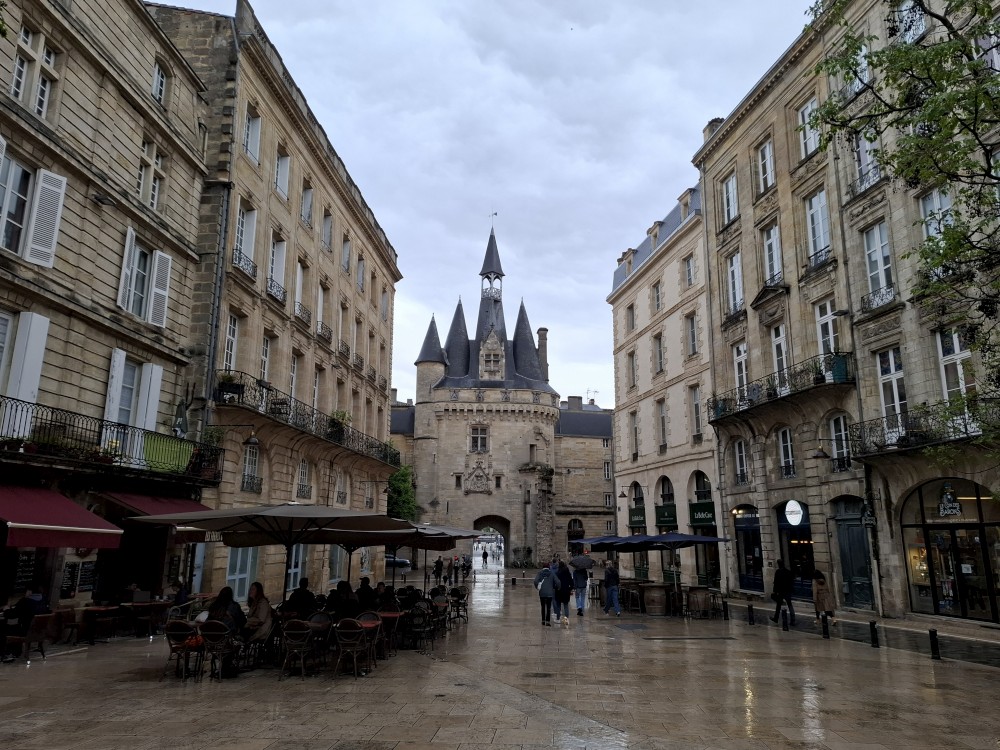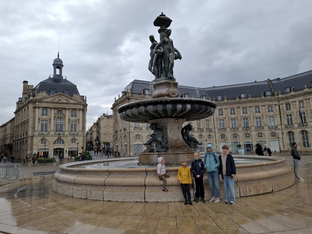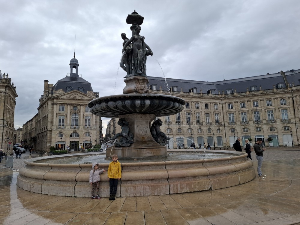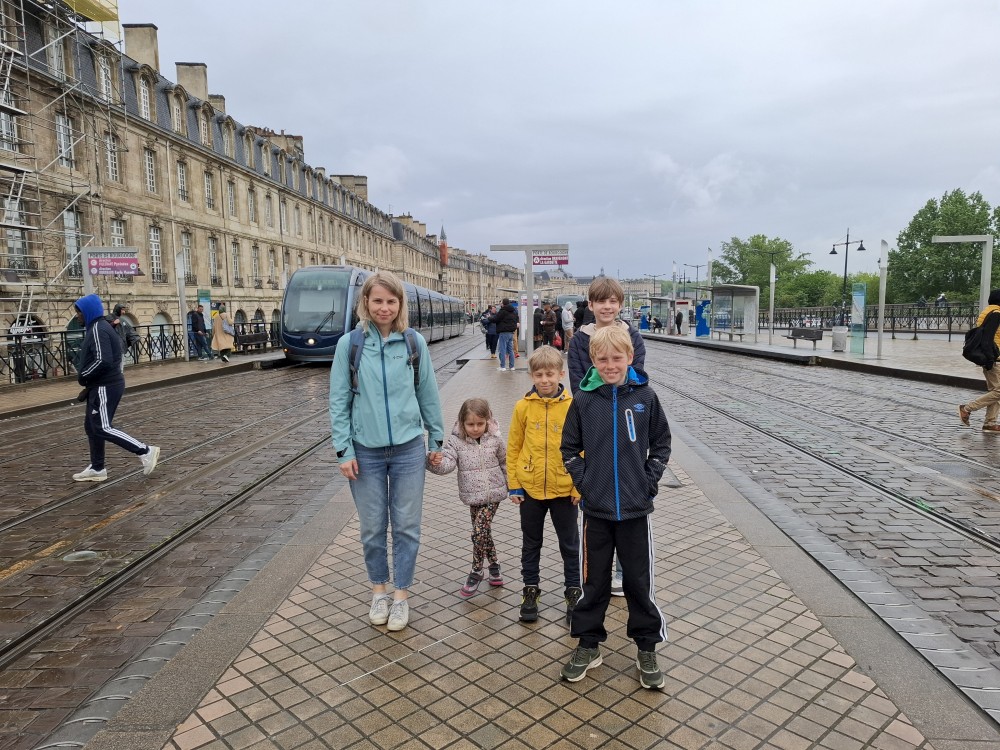 Po krátké pauze jdeme na nedalekou zastávku tramvaje A, přes aplikaci kupujeme lístky (10 EUR pro všechny) a jedeme přímo do centra. Asi za 30 minut přejíždíme most přes Garonu a vystupujeme. Jdeme na náměstí, kde je Basilica of St. Michael. Opravují věž. Pokračujeme k městské bráně, cestou kupujeme dětem pizzu. Prší a je asi 14 stupňů.