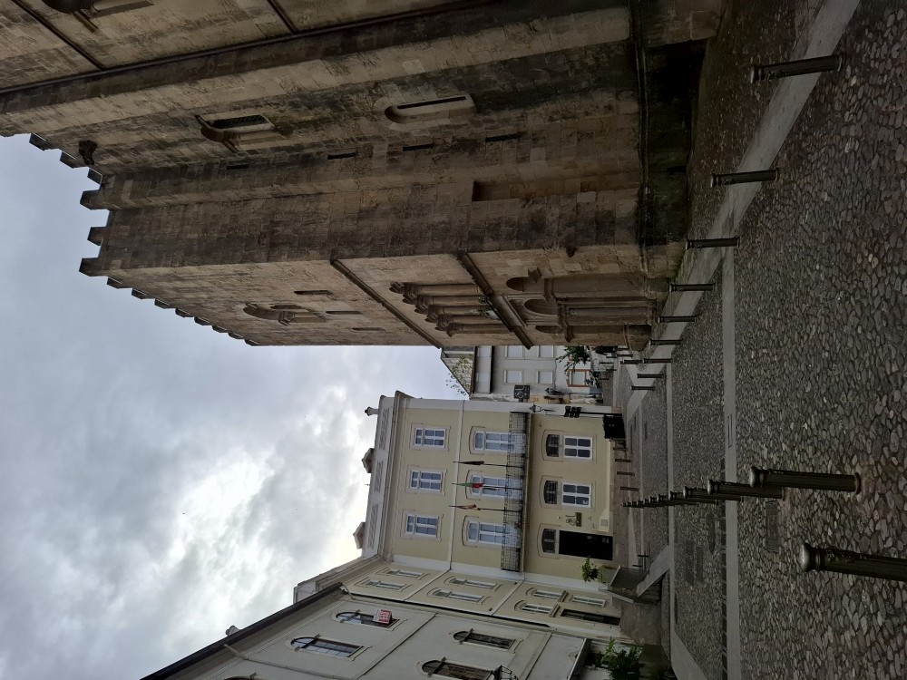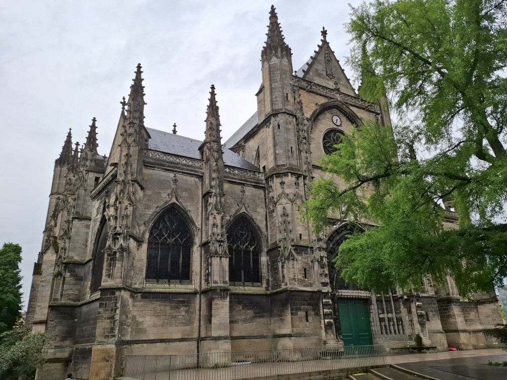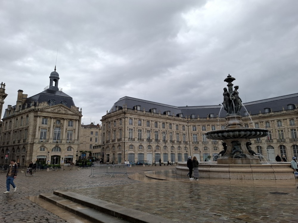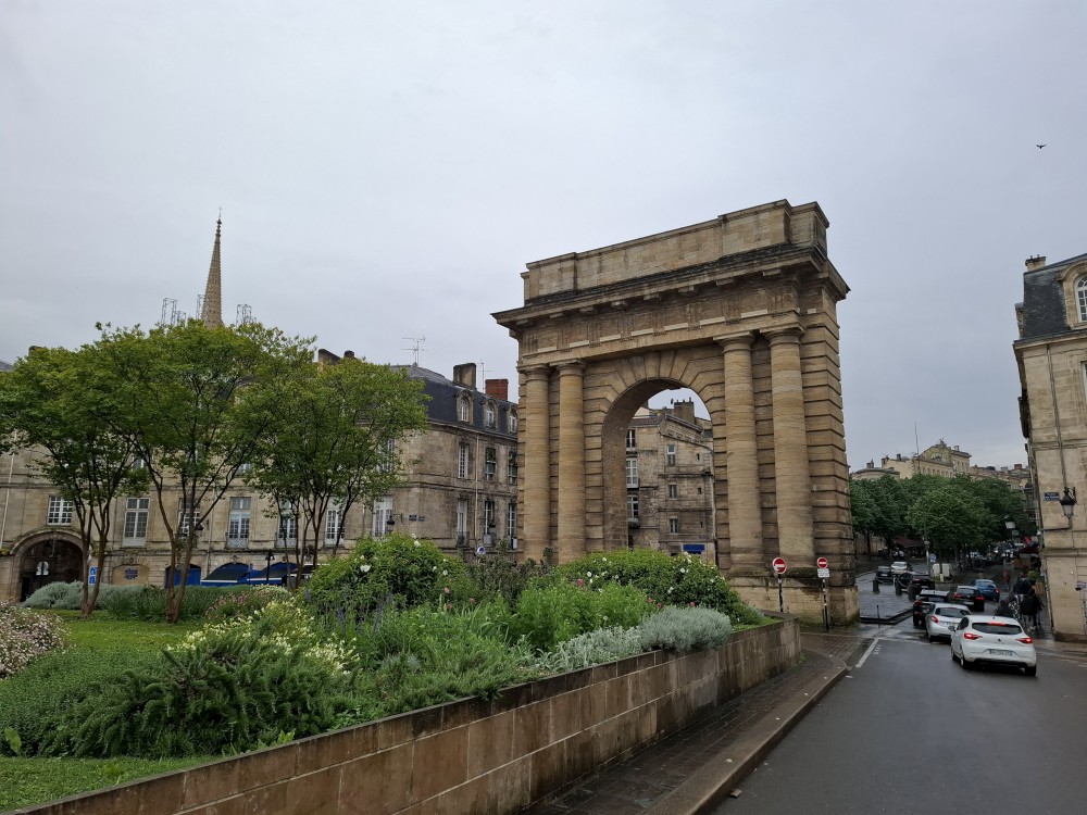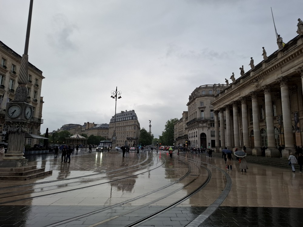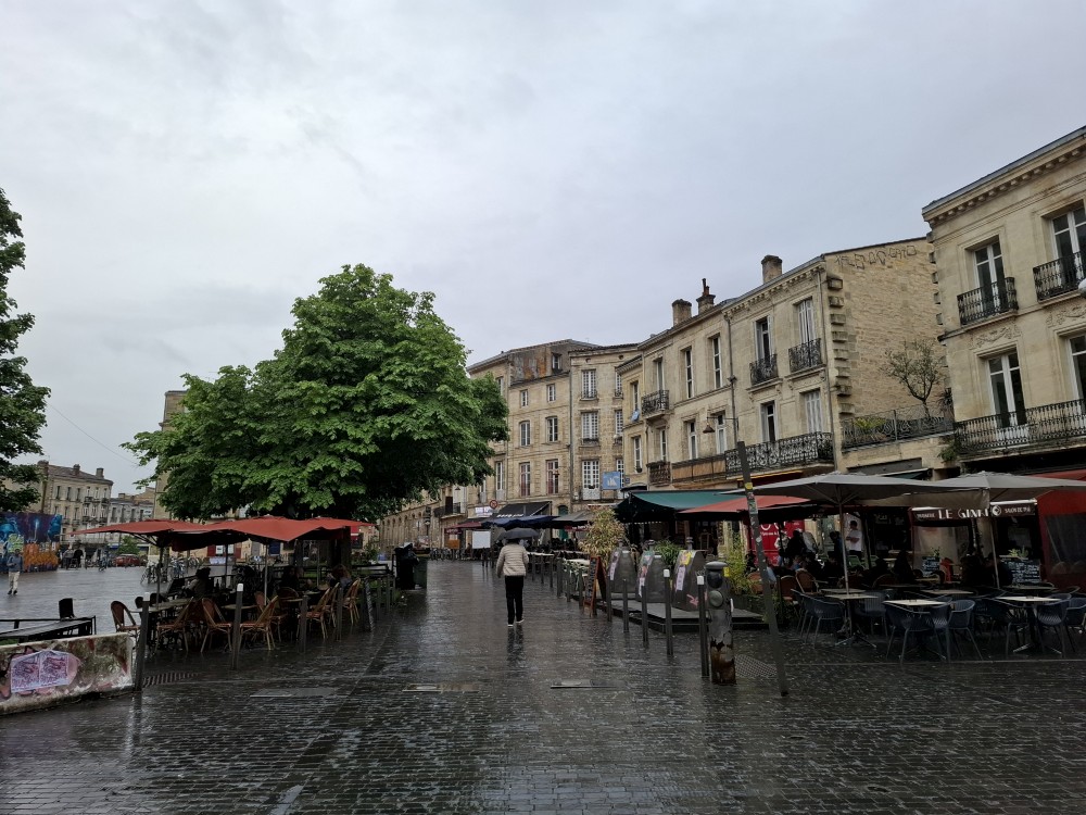 Po krátké pauze jdeme na nedalekou zastávku tramvaje A, přes aplikaci kupujeme lístky (10 EUR pro všechny) a jedeme přímo do centra. Asi za 30 minut přejíždíme most přes Garonu a vystupujeme. Jdeme na náměstí, kde je Basilica of St. Michael. Opravují věž. Pokračujeme k městské bráně, cestou kupujeme dětem pizzu. Prší a je asi 14 stupňů.