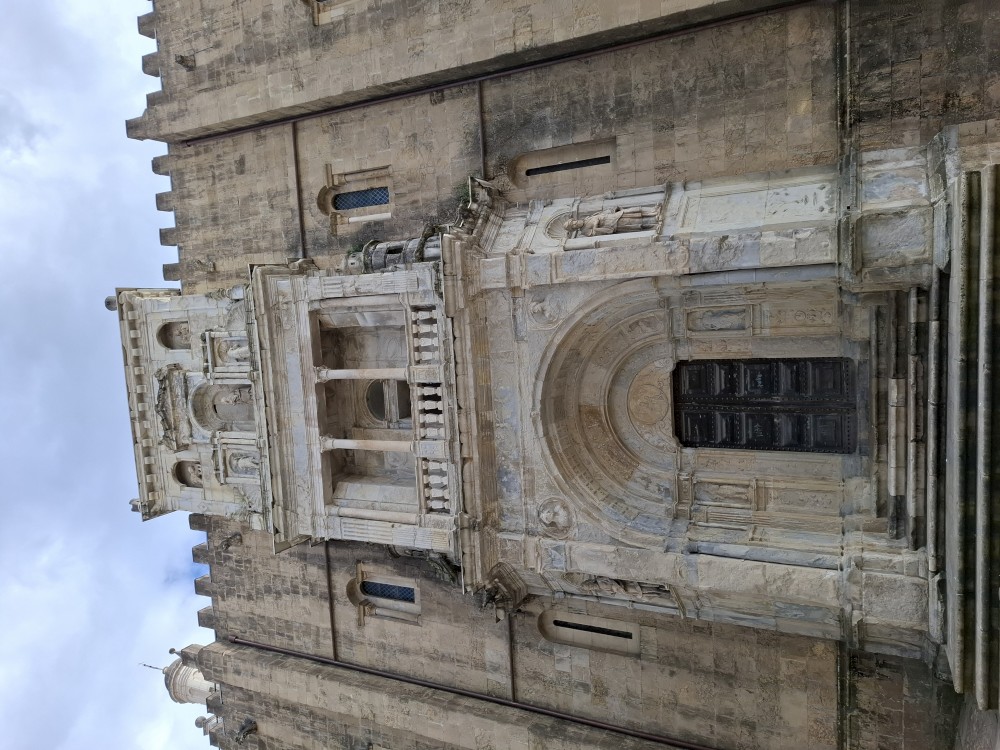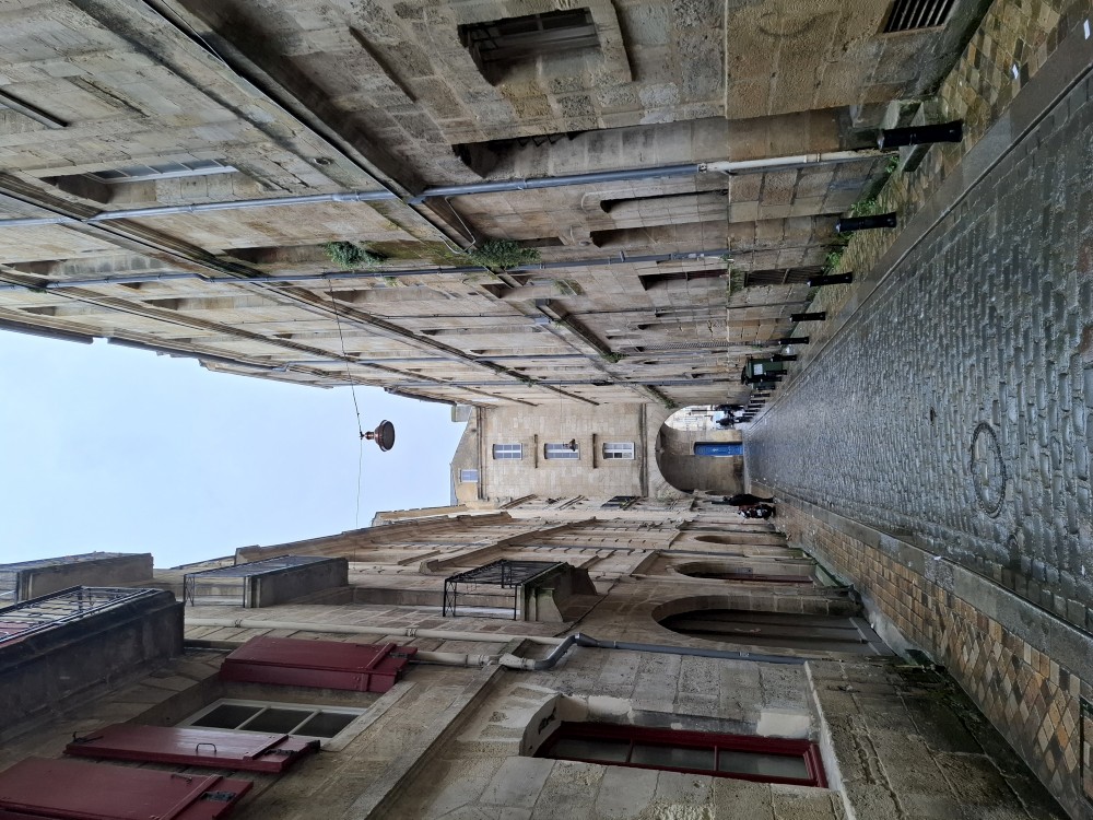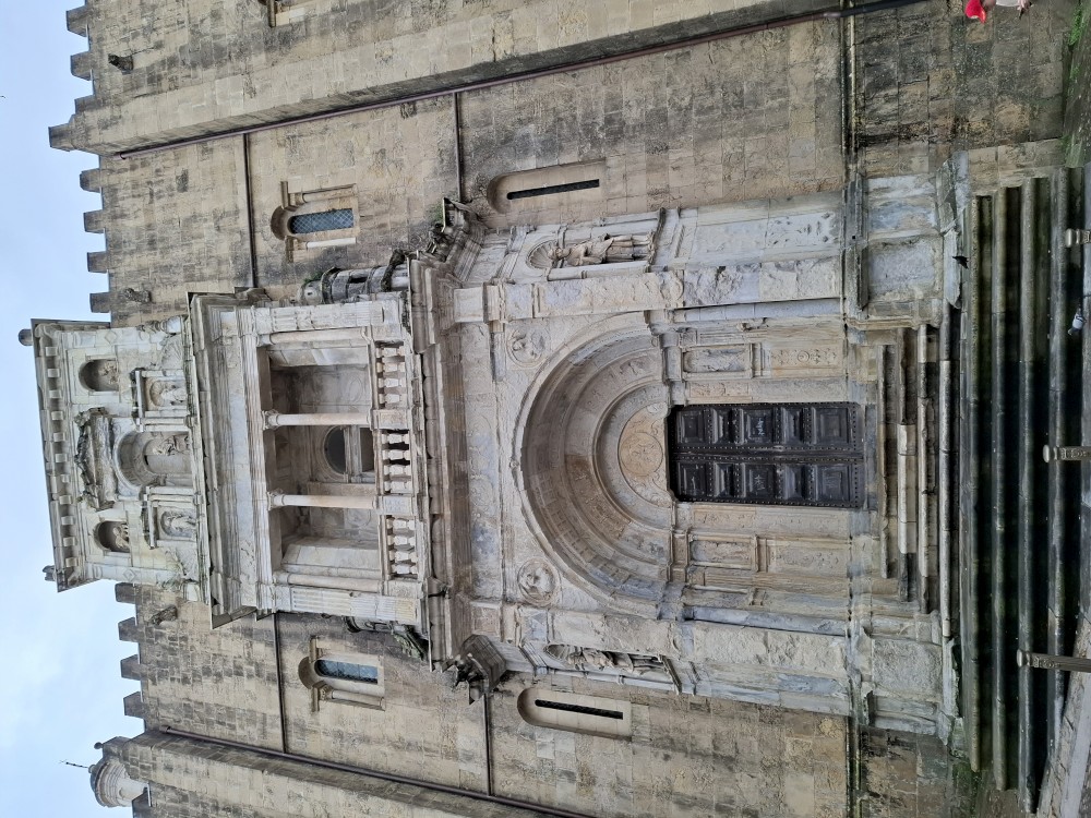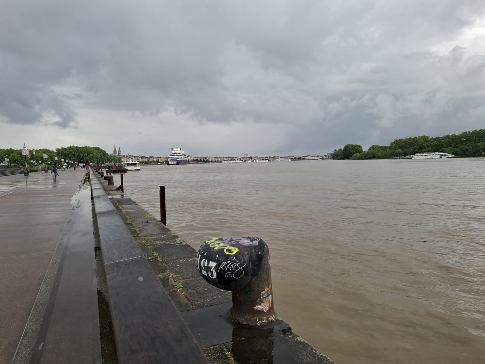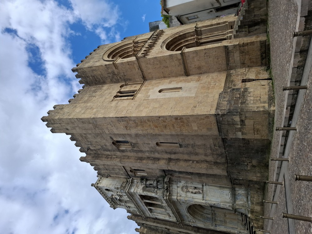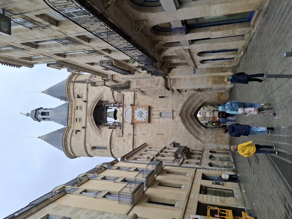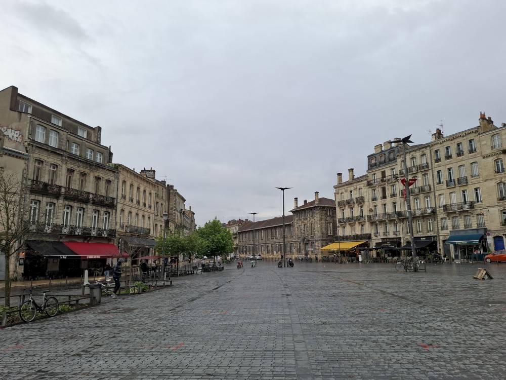 Po krátké pauze jdeme na nedalekou zastávku tramvaje A, přes aplikaci kupujeme lístky (10 EUR pro všechny) a jedeme přímo do centra. Asi za 30 minut přejíždíme most přes Garonu a vystupujeme. Jdeme na náměstí, kde je Basilica of St. Michael. Opravují věž. Pokračujeme k městské bráně, cestou kupujeme dětem pizzu. Prší a je asi 14 stupňů.