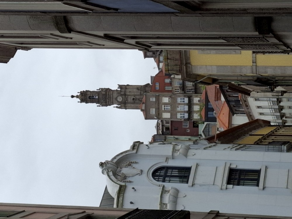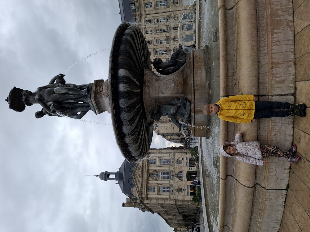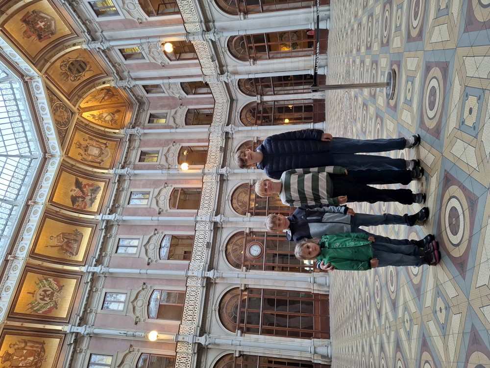 Čekáme celkem dlouhou dobu na pokladnu v burzovním paláci. Když se dostaneme k pokladně, zjišťujeme, že je vstup nečekaně drahý, pro celou rodinu asi 80 EUR. Ale podařilo se nám domluvit, že platíme jen dospělí a děti mohou jít zdarma. Najednou je z toho 28 EUR, to je slušná sleva. Prohlídka začíná skoro až za 2 hodiny, jdeme tedy v dešti na staré město.