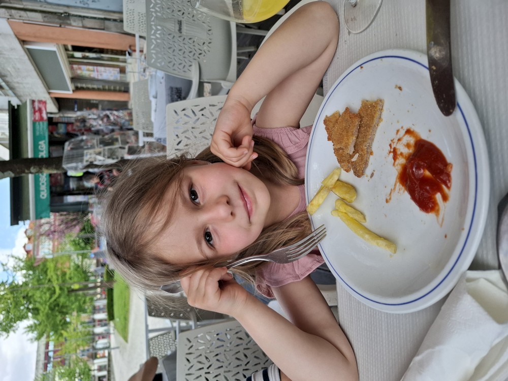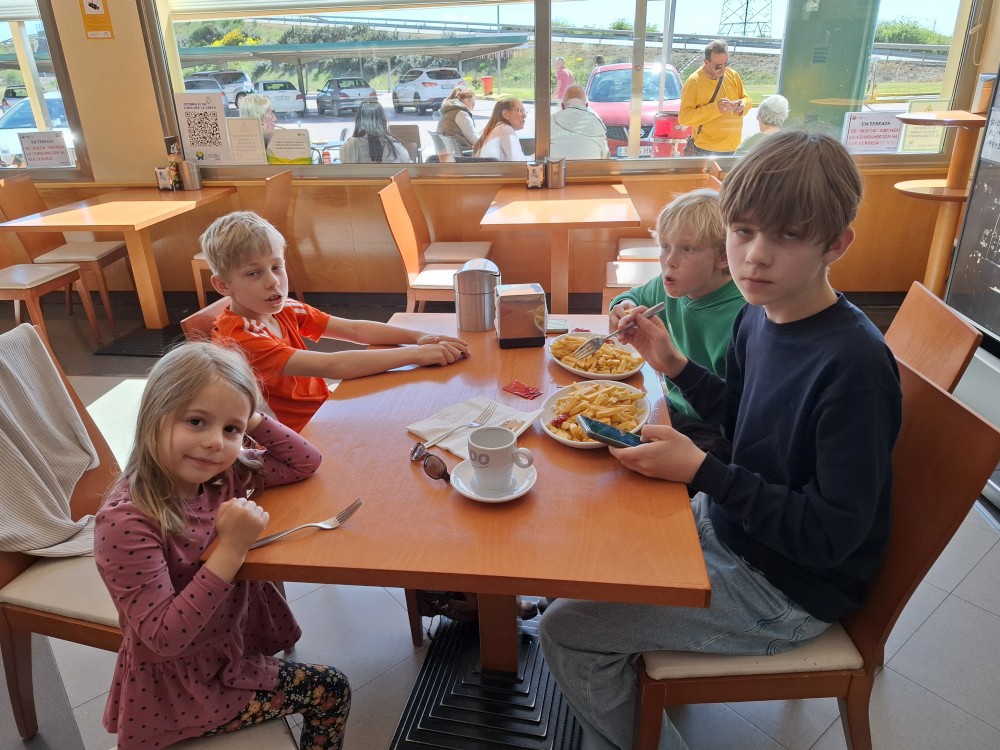 Bětuška okousává kuřecí stehýnko. Stálo to asi 20 EUR. Pak už spěcháme k autu, čeká nás dnes ještě dlouhá cesta. Jedeme hornatou oblastí poblíž pobřeží se spoustou tunelů, pořád platíme mýta. Pak se odkláníme do vnitrozemí. Poblíž Leonu si dáváme kávu a také hranolky v jedné restauraci u pumpy. Překvapuje nás, že je to tu hodně levné. Pokračujeme na západ.
