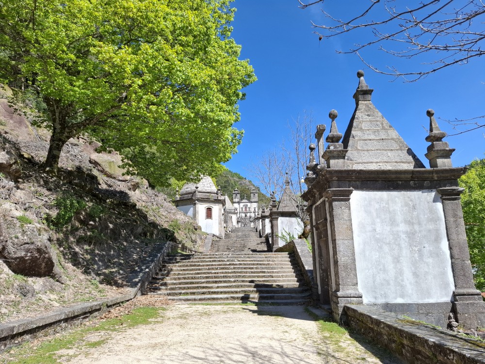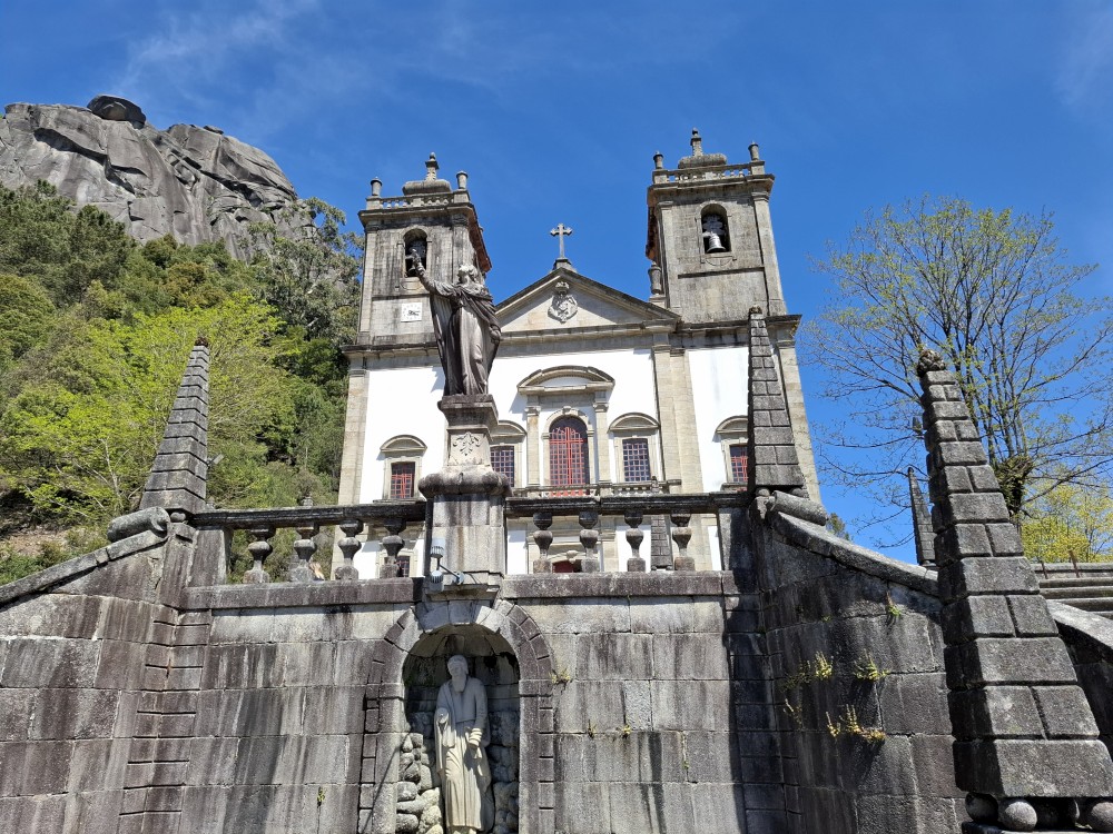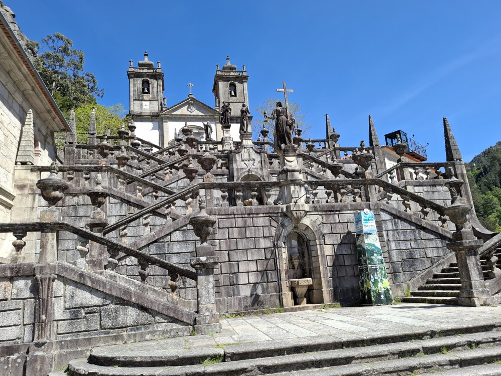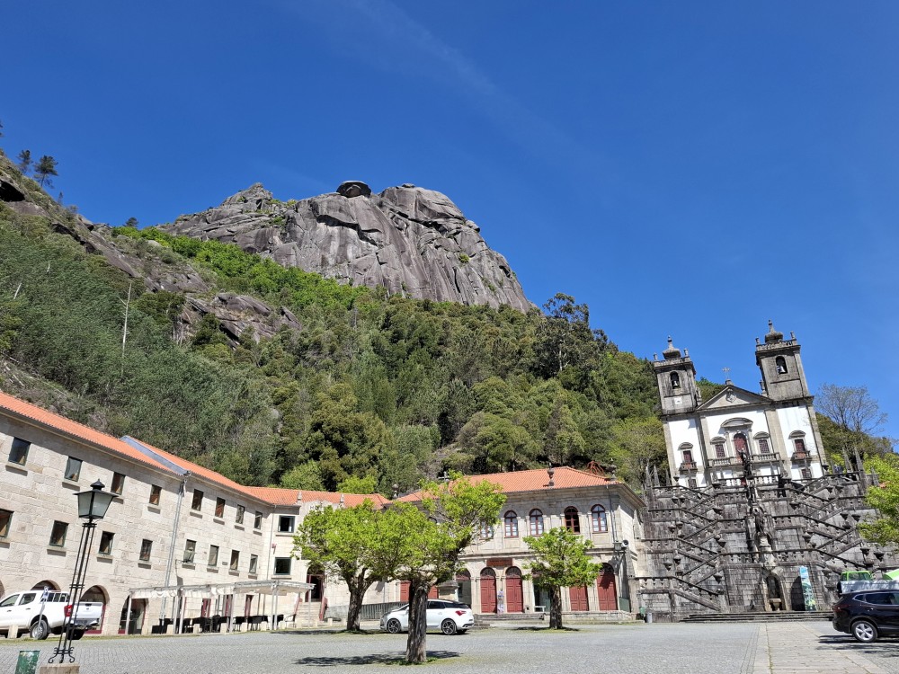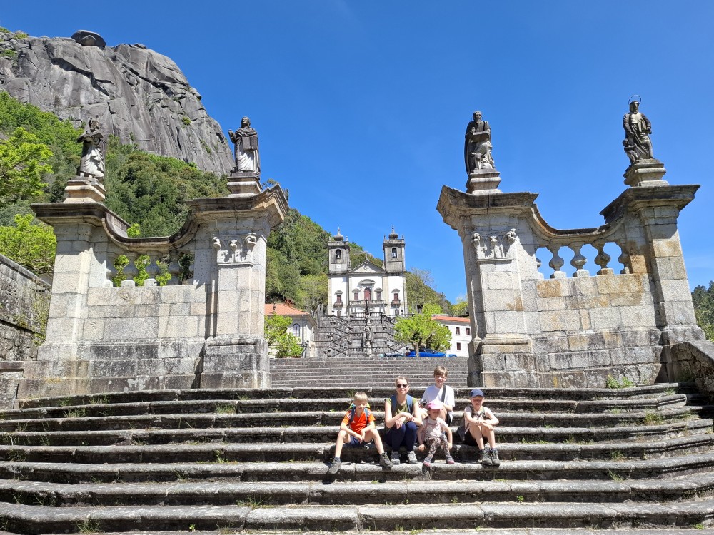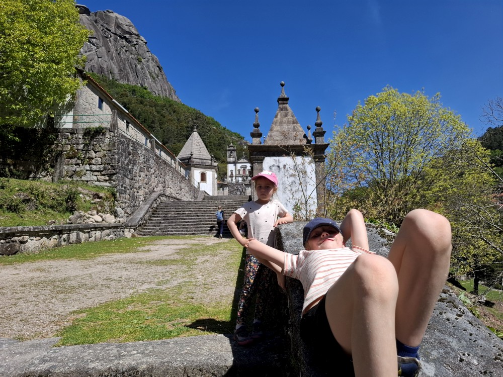 Parkujeme v Penedě hned u poutního kostela. Je to zmenšenina Bom Jesus u Bragy. Nejprve jdeme dolů od kostela po křížové cestě a pak zase zpět. V obchůzku před kostelem kupujeme Jiříkovi a Martínkovi portugalské fotbalové míče. Dáváme je do auta. Občerstvení vedle auta, kde jsme si plánovali dát nějaký oběd je bohužel zavřené. Škoda. Oběd si tedy dáme až po výletě do hor, který máme naplánován.