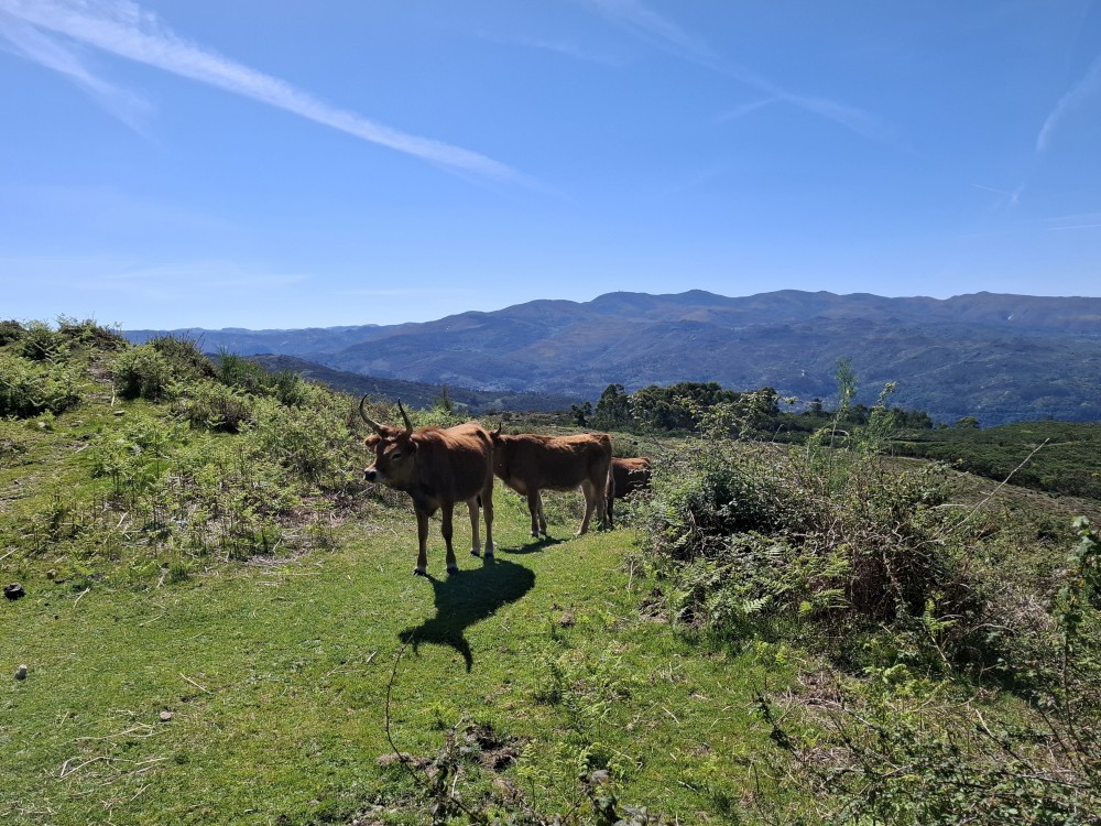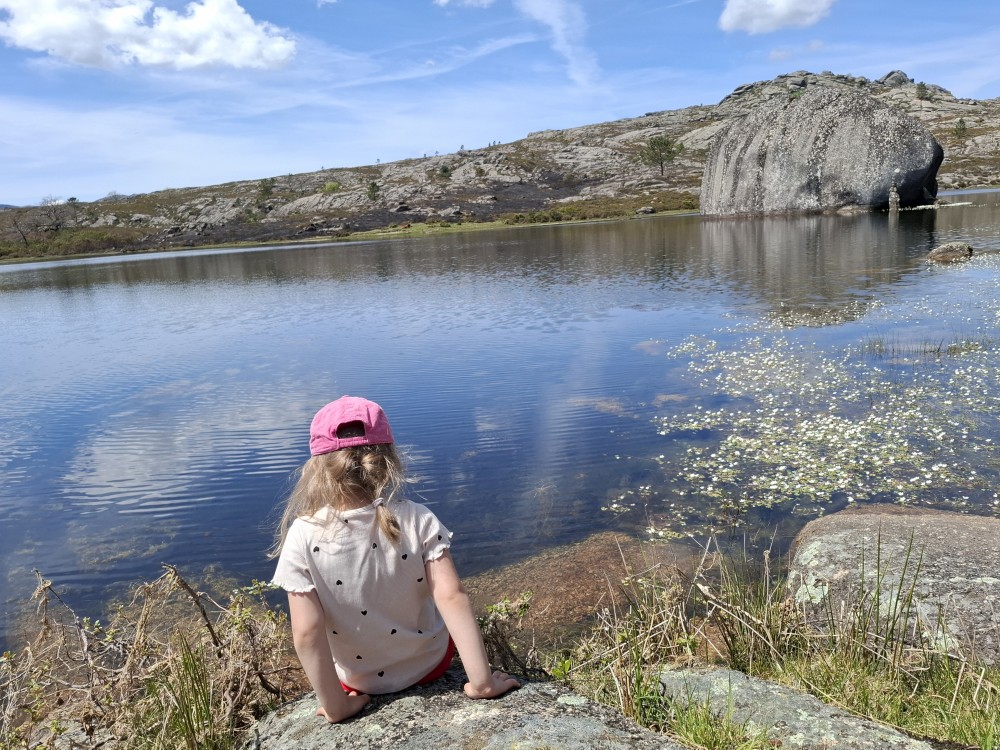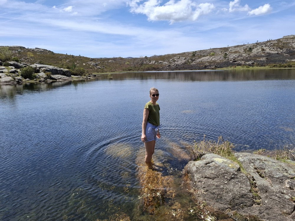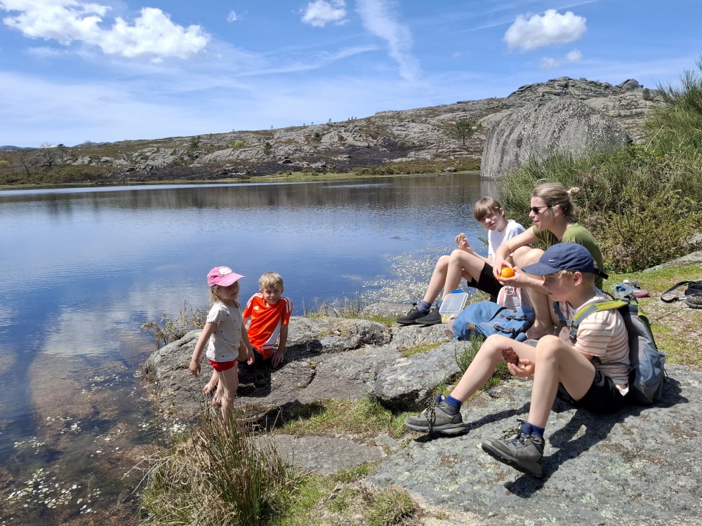 Po chvilce váhání se odhodláváme ke koupačce ve studené vodě jezera, nazí. Dáváme svačinku. U jezera se pase rohatá kráva. Všude jsou slyšet žáby, část jezera je pokryta bílými květy, všude kolem hory. Vydáváme se na cestu zpět. Potkáváme holandský pár. Říkají nám, že je ve Španělsku a Portugalsku black-out. To nám asi dost komplikuje plány. Plánovaný oběd nebude, všechny restaurace jsou bez proudu a nevaří.