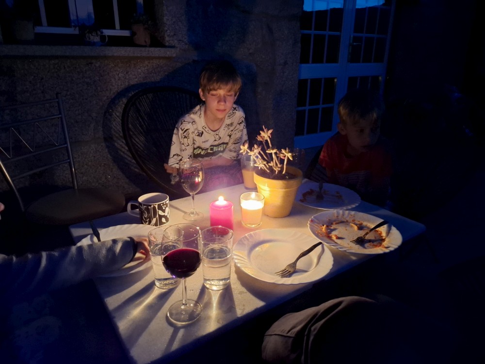 Jedeme zpět do Casa Velha. Děláme si těstoviny na plynovém vařiči, ten naštěstí funguje. Sedíme při svíčkách na terase a pijeme víno. Premiér Portugalska říká, že prý obnova po black-outu bude možná až týden. To by nám plány hodně komplivalo. Jdeme spát. V noci naštěstí proud nahazují.