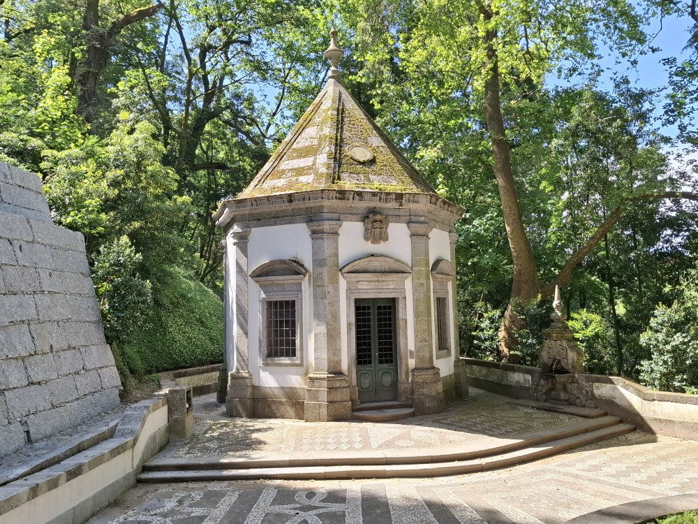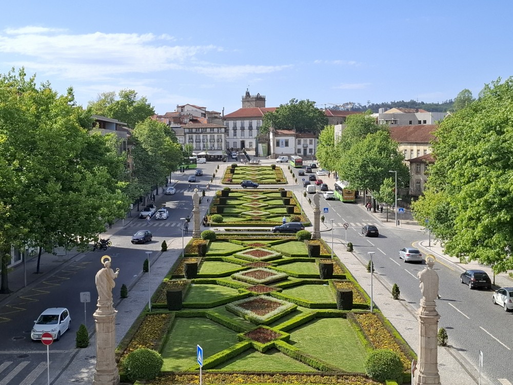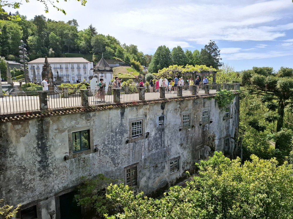 Jdeme se podívat na kostel Igreja e Oratórios de Nossa Senhora da Consolação, který zakončuje dlouho zahradu, ale také stojí u kruhového objezdu, který zahradu obkružuje. Je tu nepříjemně hustá doprava. V kostele platíme každý 1 EUR za vstup do věže. Ukázalo se ale, že to není věž, ale jen pár schodů do patra s výhledem na zahradu. Toto za 6 EUR úplně nestálo.