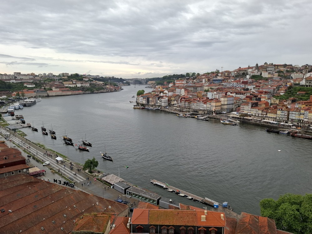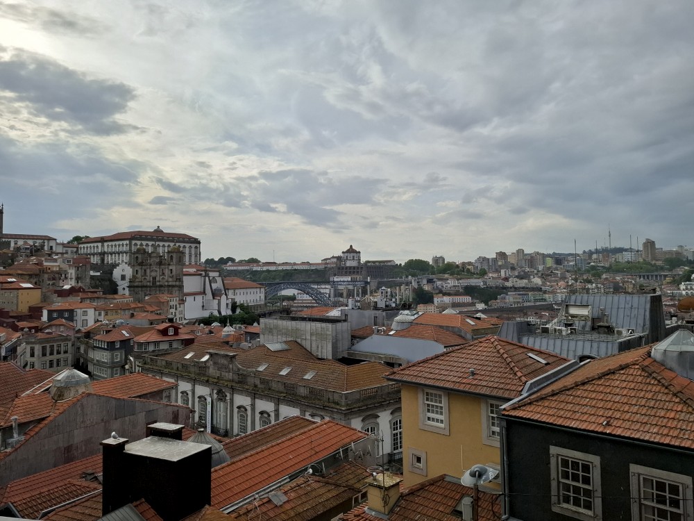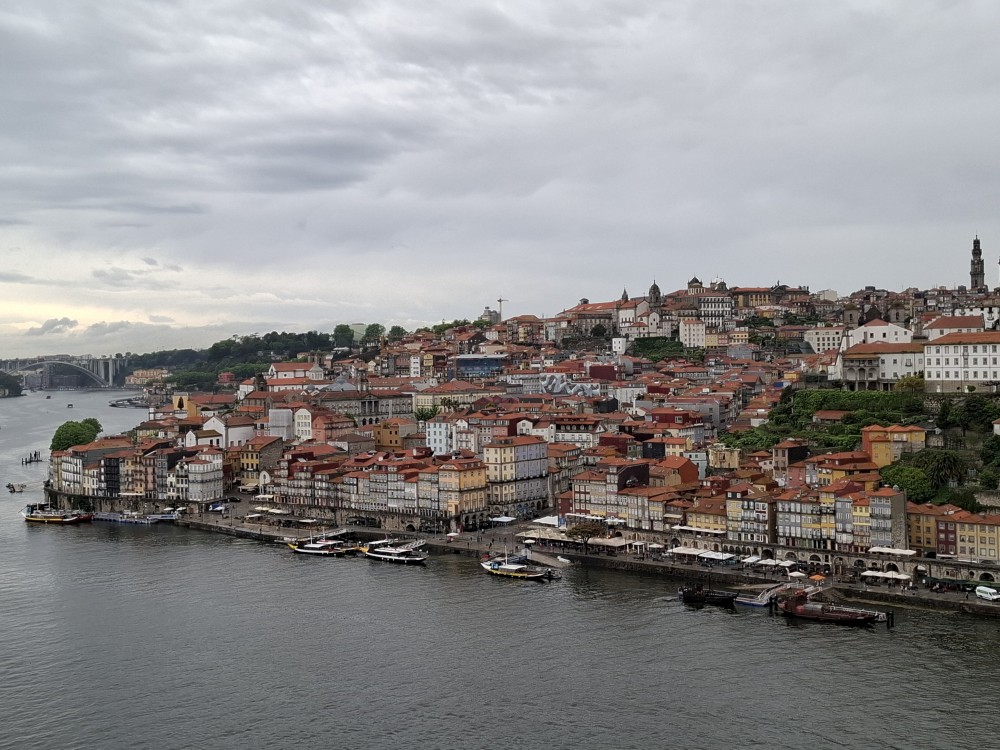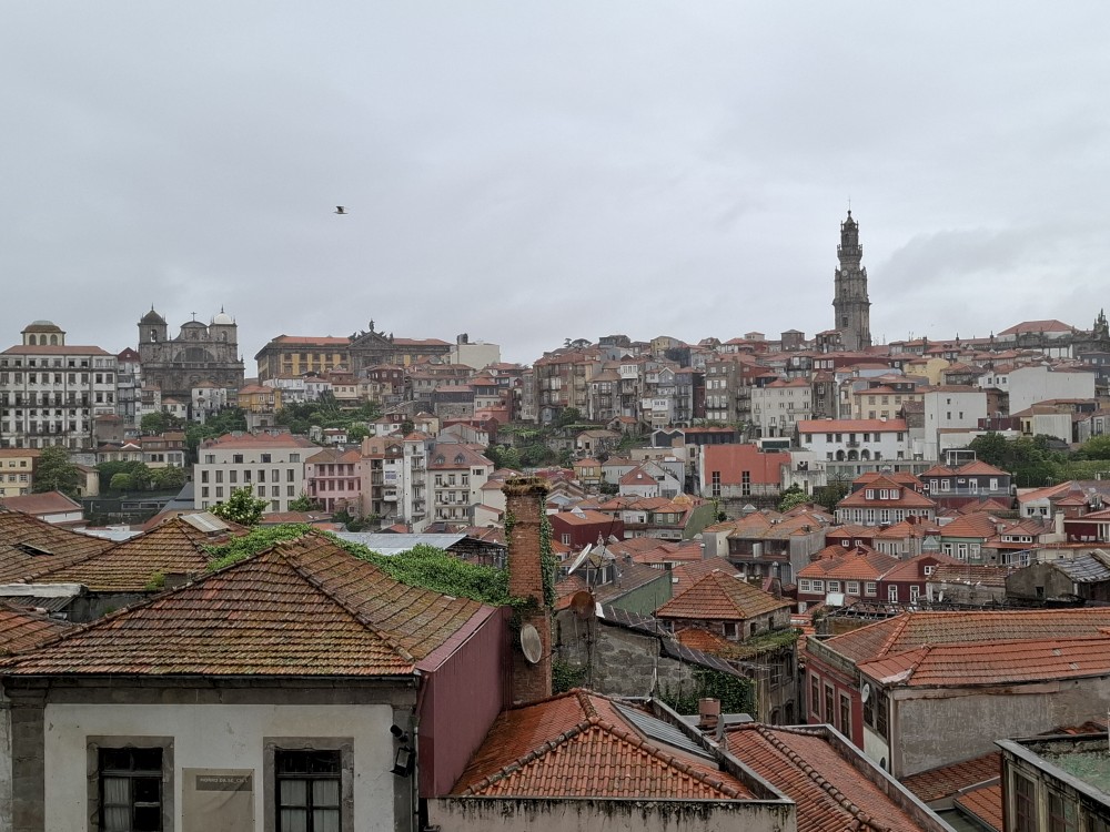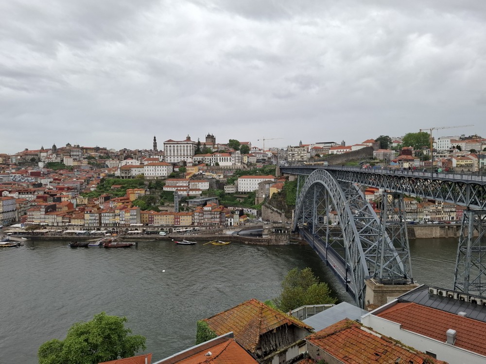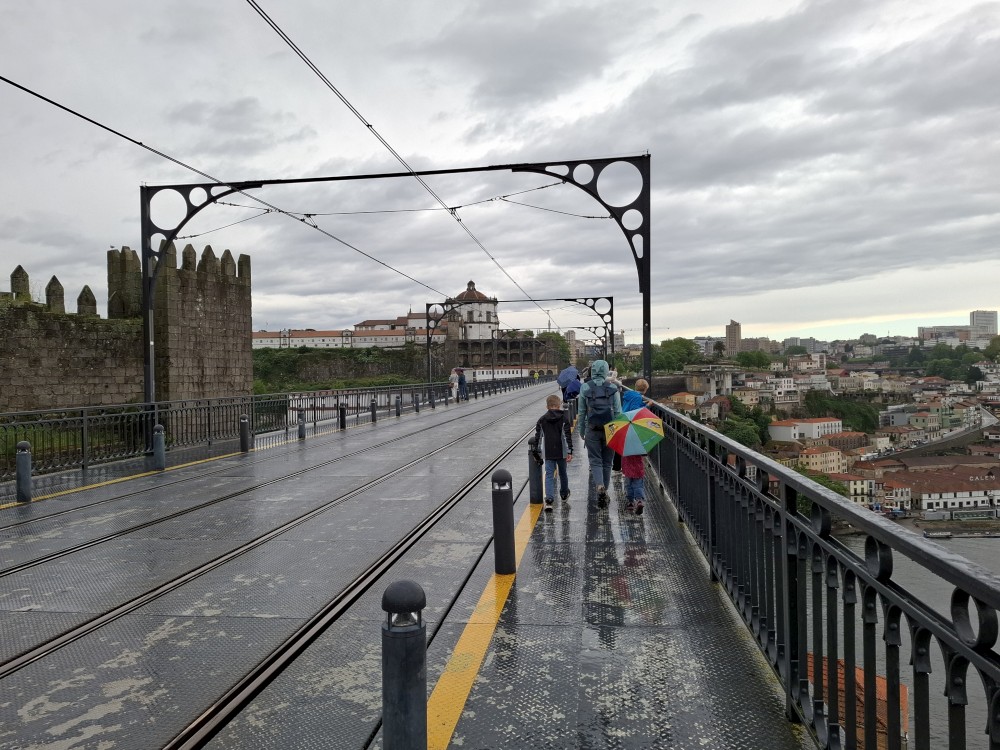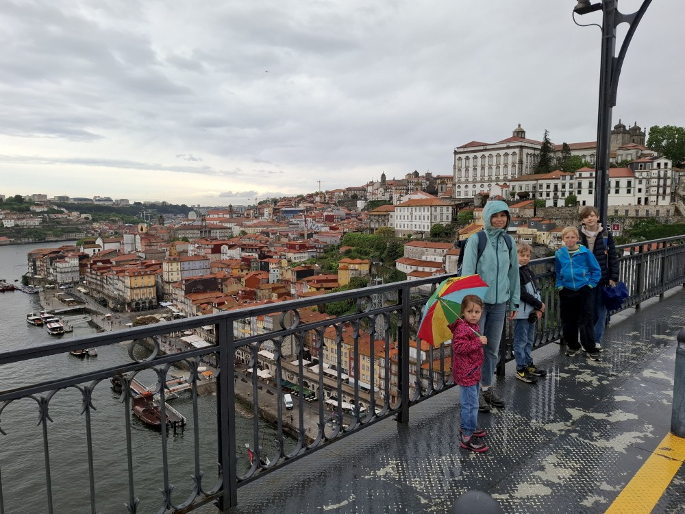 Pak vyrážíme znovu do města. Jdeme je Sparu, nakupujeme na snídani. Pokračujeme v dešti ke knihovně Lella, je tam ale hodně dlouhá fronta venku a nechce se nám v ní v dešti stát. Jdeme tedy zase ke katedrále Sé a odtud přecházíme po horní části mostu na druhou stranu řeky. Fotíme si výhledy na Ribeiru a celé staré město Porto.