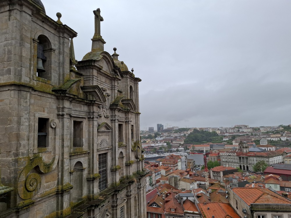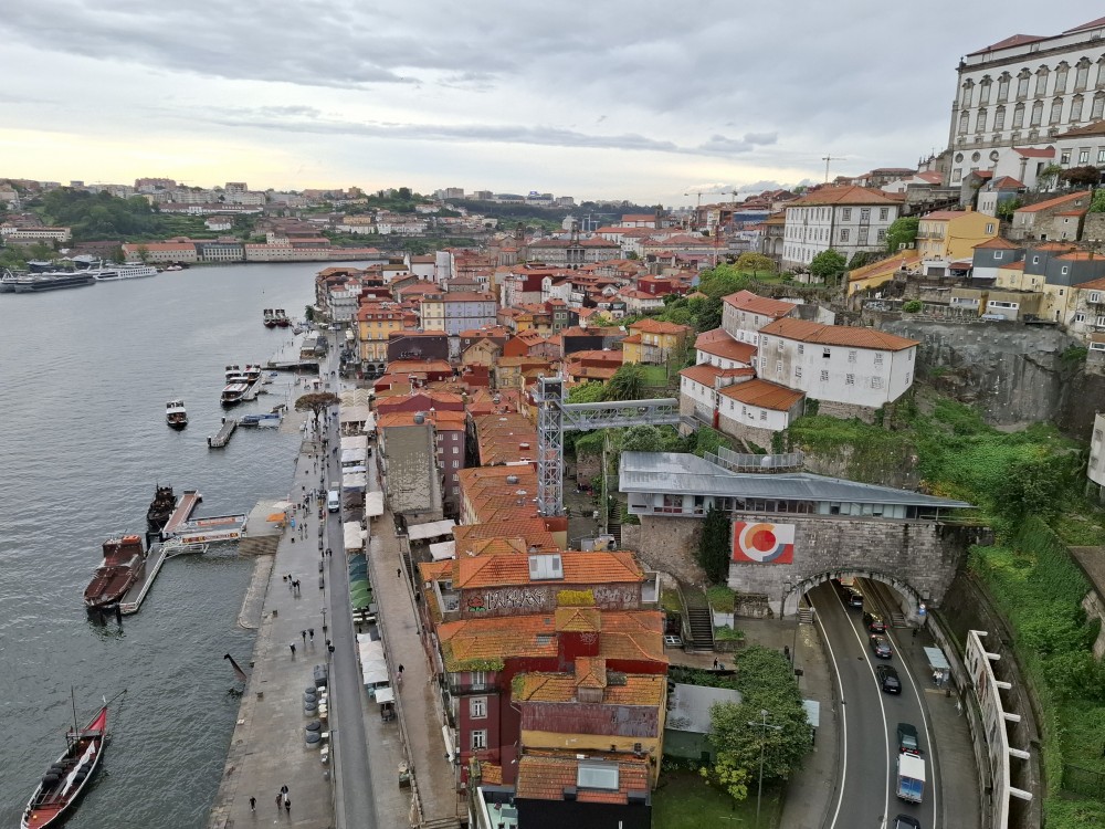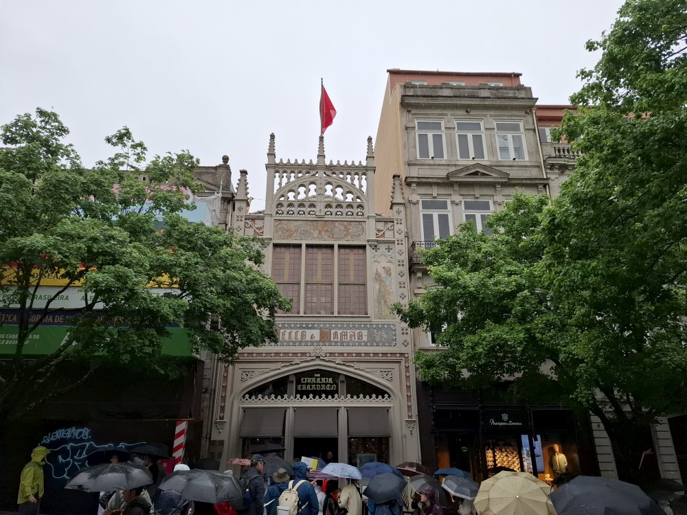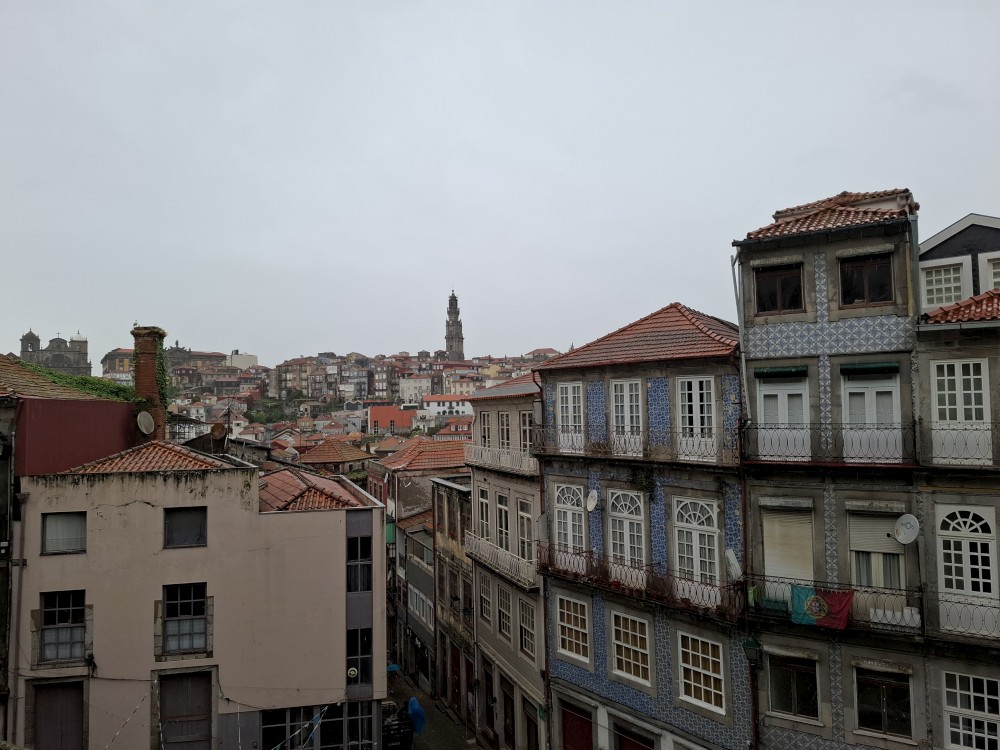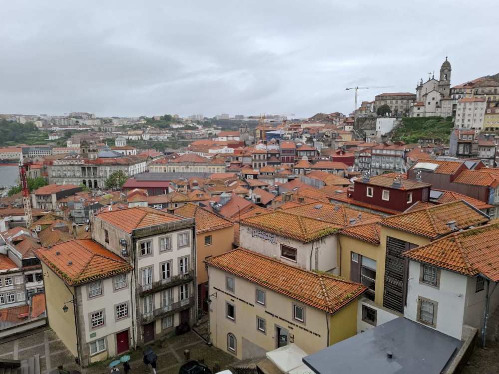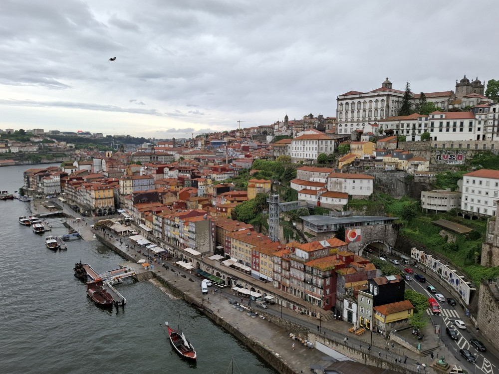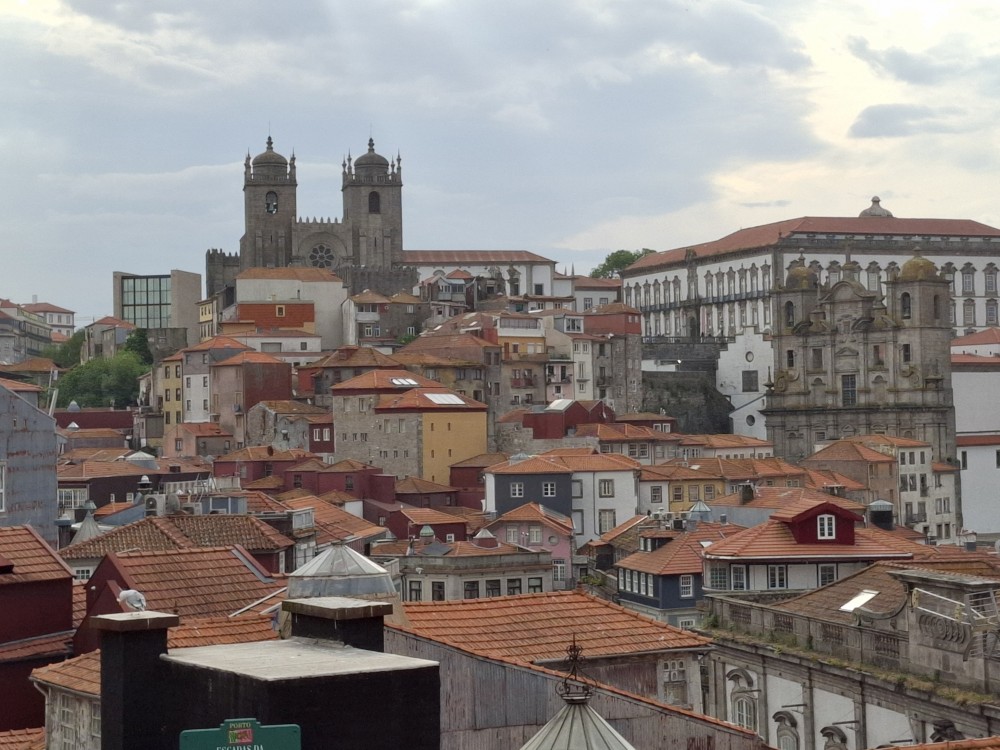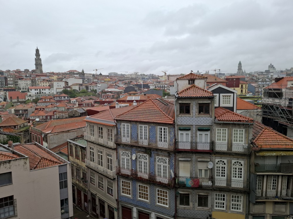 Pak vyrážíme znovu do města. Jdeme je Sparu, nakupujeme na snídani. Pokračujeme v dešti ke knihovně Lella, je tam ale hodně dlouhá fronta venku a nechce se nám v ní v dešti stát. Jdeme tedy zase ke katedrále Sé a odtud přecházíme po horní části mostu na druhou stranu řeky. Fotíme si výhledy na Ribeiru a celé staré město Porto.