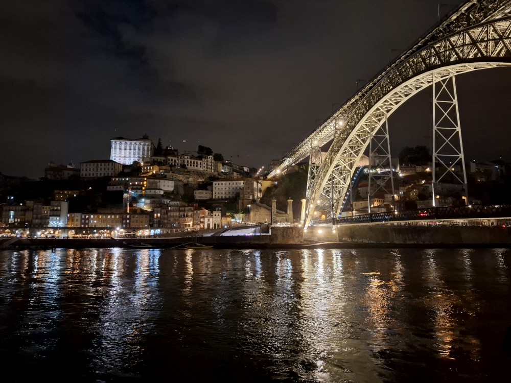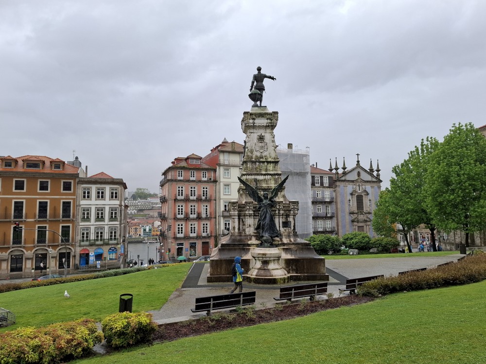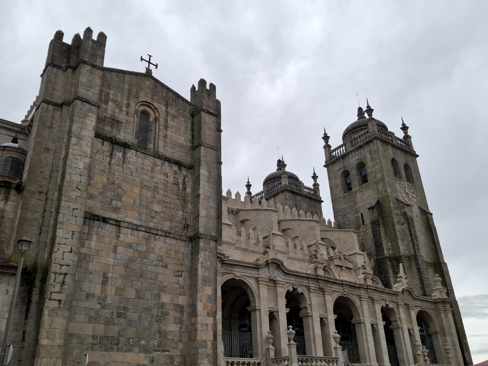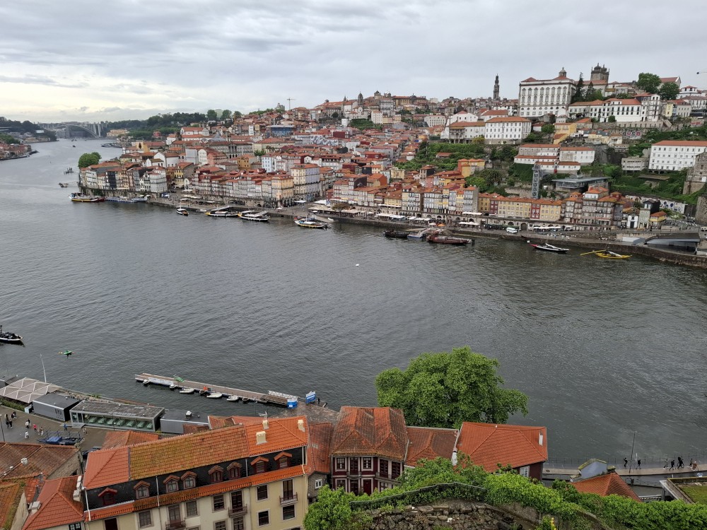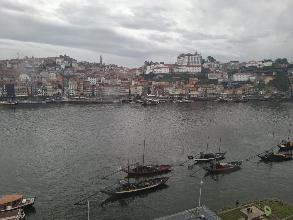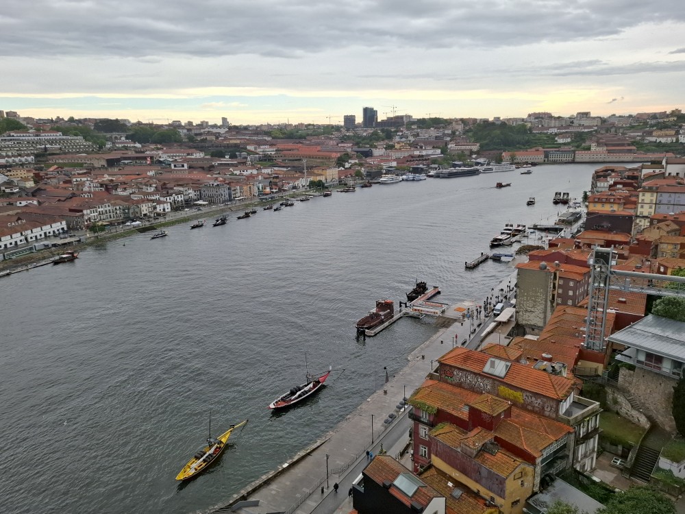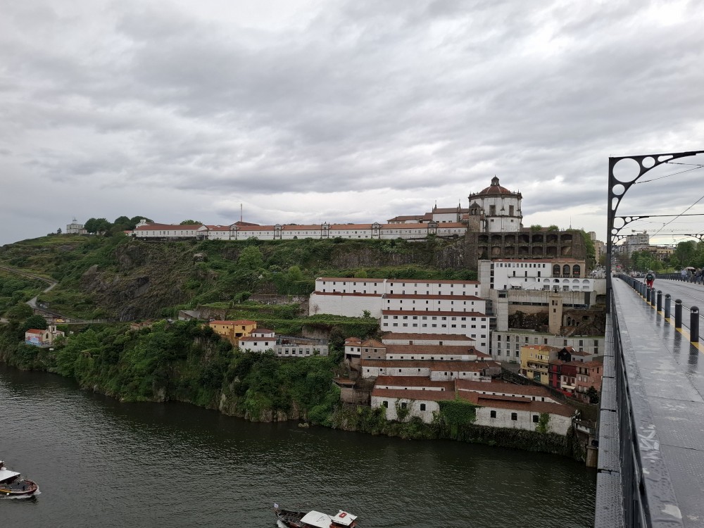 Pak vyrážíme znovu do města. Jdeme je Sparu, nakupujeme na snídani. Pokračujeme v dešti ke knihovně Lella, je tam ale hodně dlouhá fronta venku a nechce se nám v ní v dešti stát. Jdeme tedy zase ke katedrále Sé a odtud přecházíme po horní části mostu na druhou stranu řeky. Fotíme si výhledy na Ribeiru a celé staré město Porto.