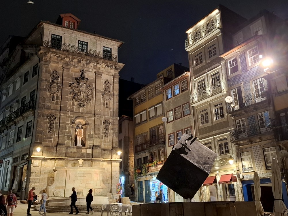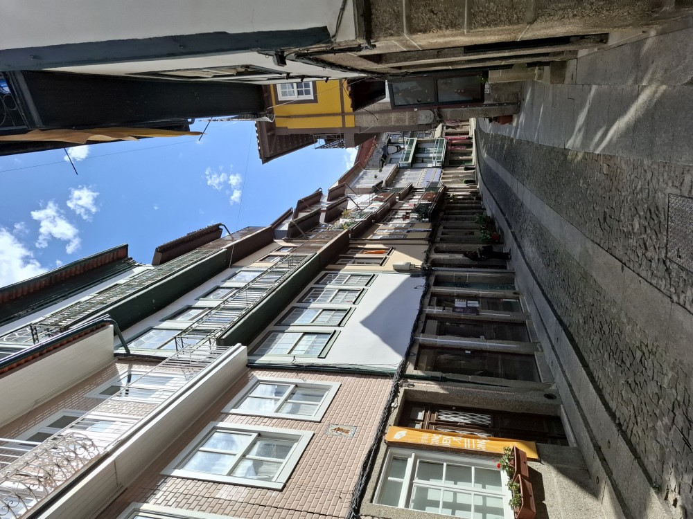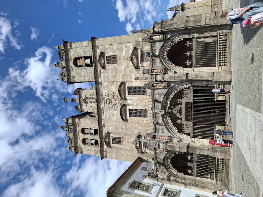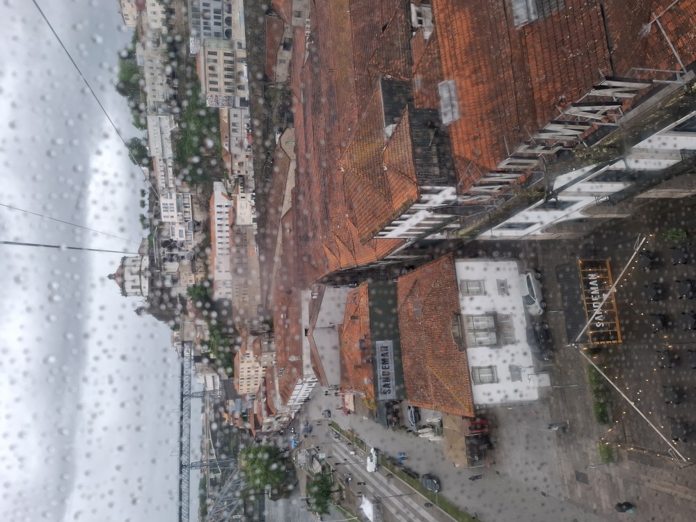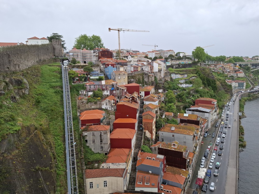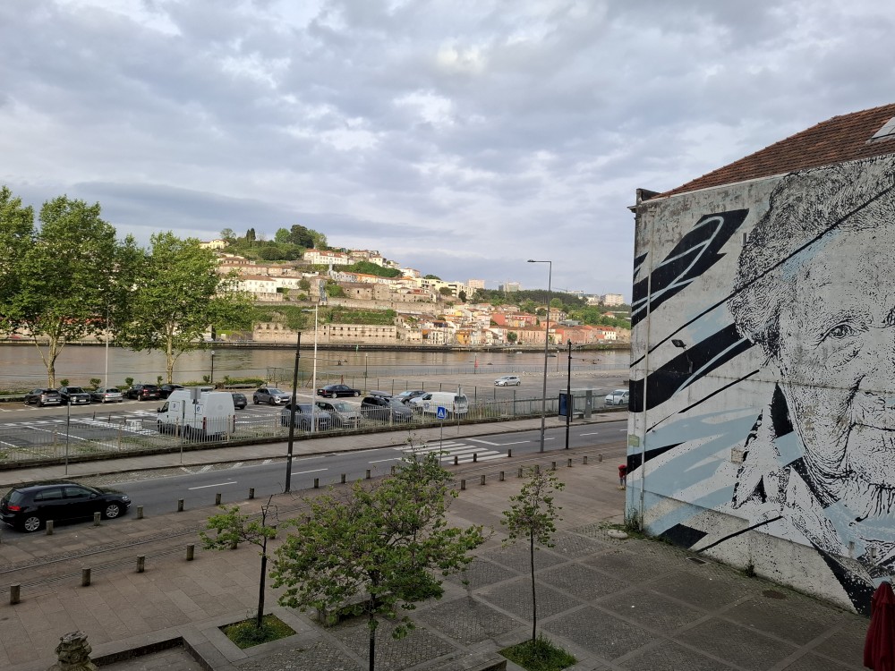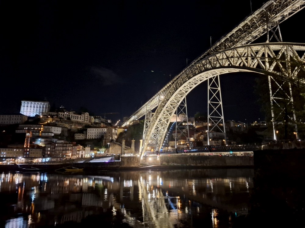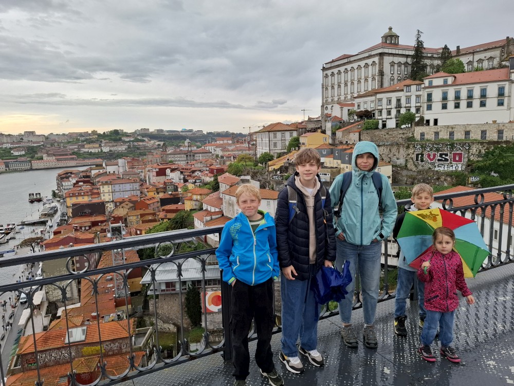 Pak vyrážíme znovu do města. Jdeme je Sparu, nakupujeme na snídani. Pokračujeme v dešti ke knihovně Lella, je tam ale hodně dlouhá fronta venku a nechce se nám v ní v dešti stát. Jdeme tedy zase ke katedrále Sé a odtud přecházíme po horní části mostu na druhou stranu řeky. Fotíme si výhledy na Ribeiru a celé staré město Porto.